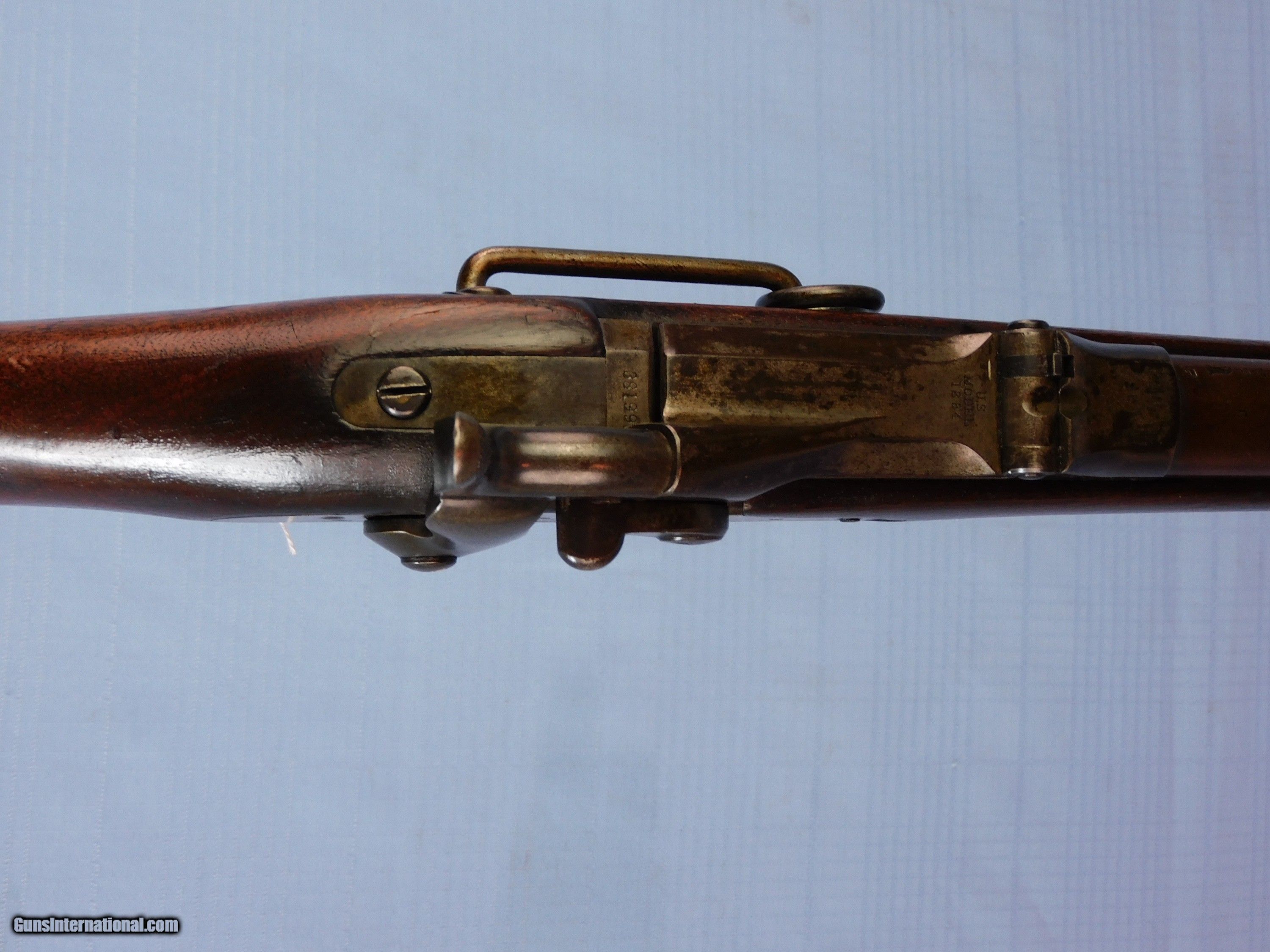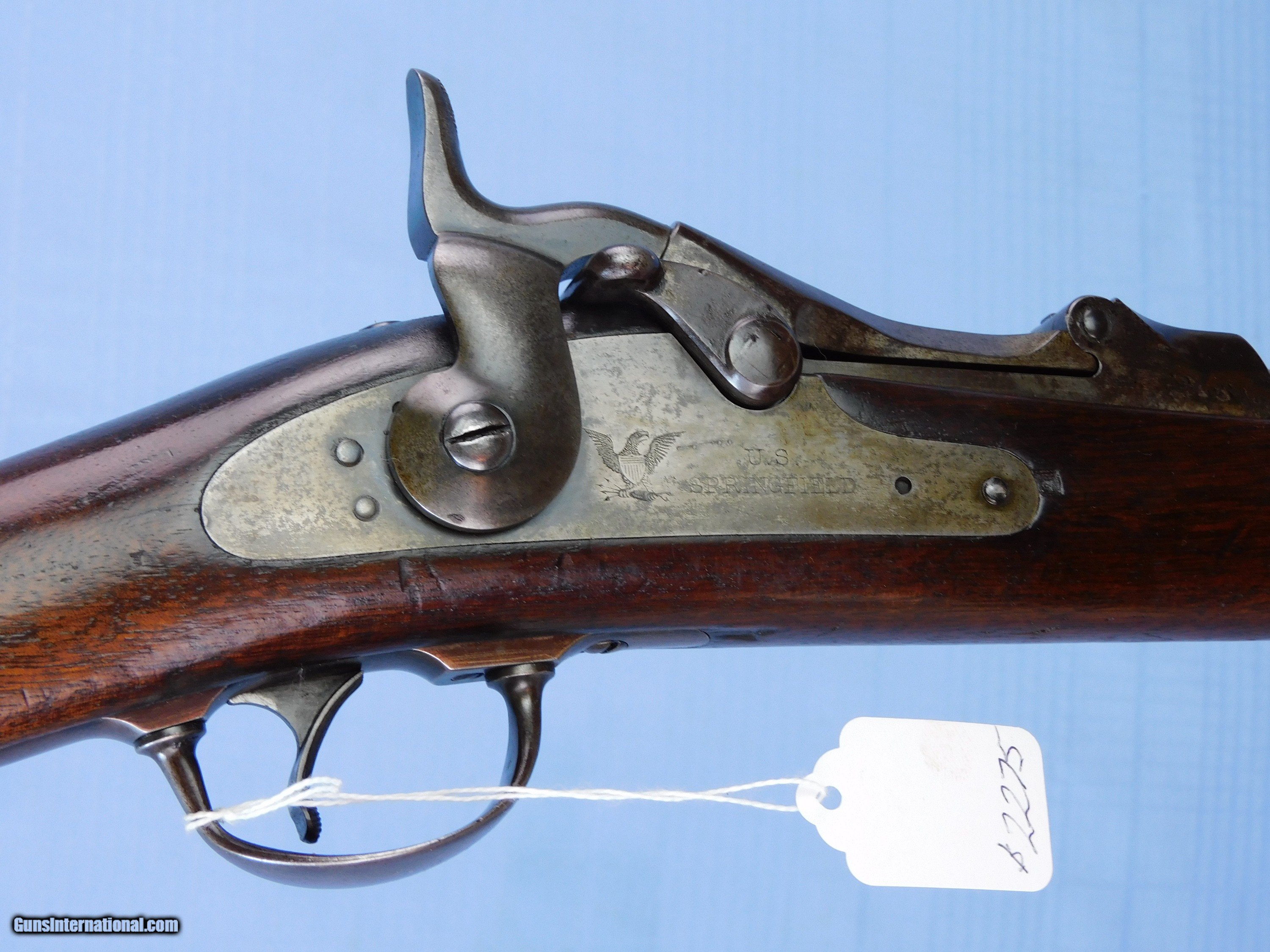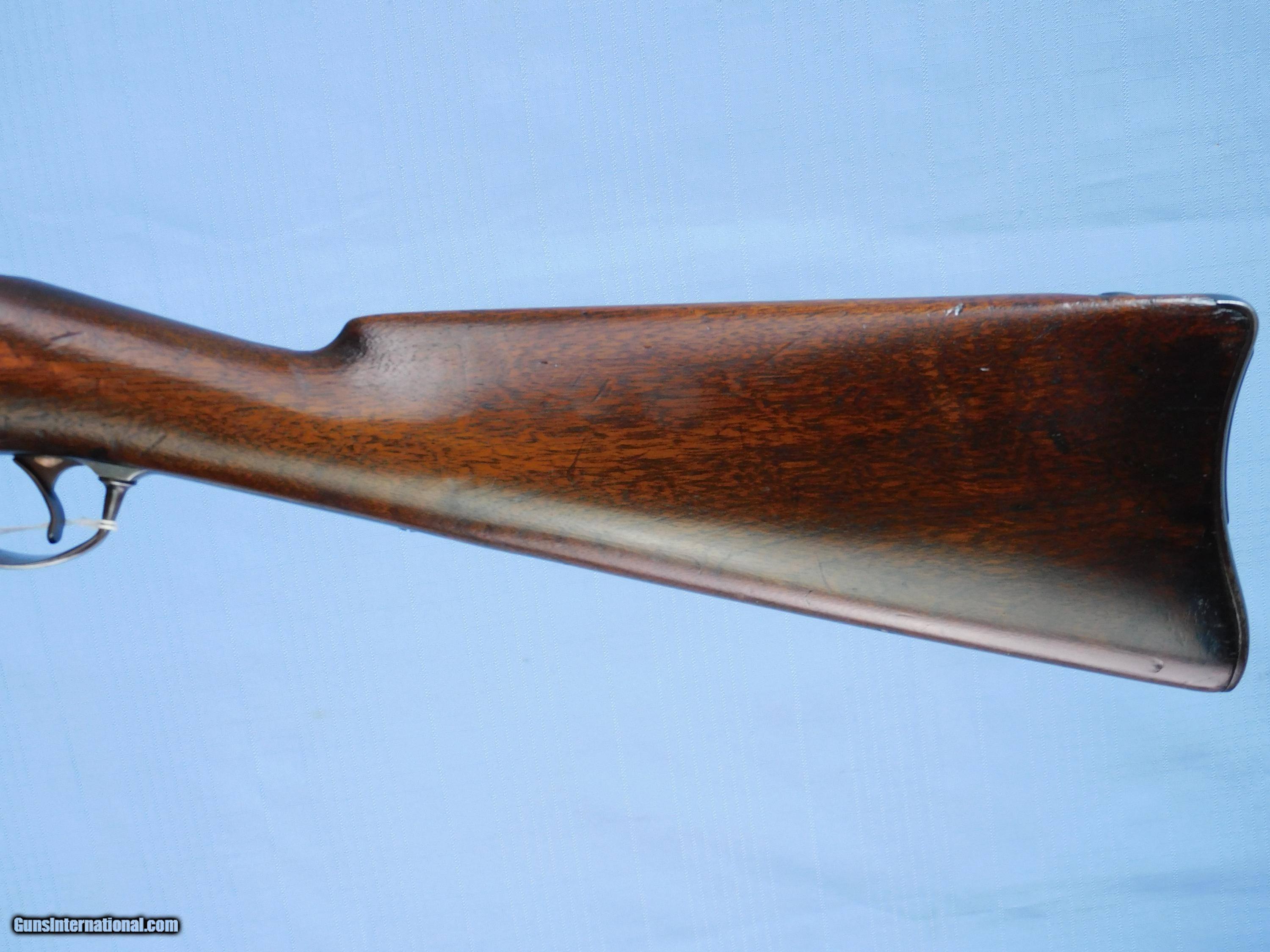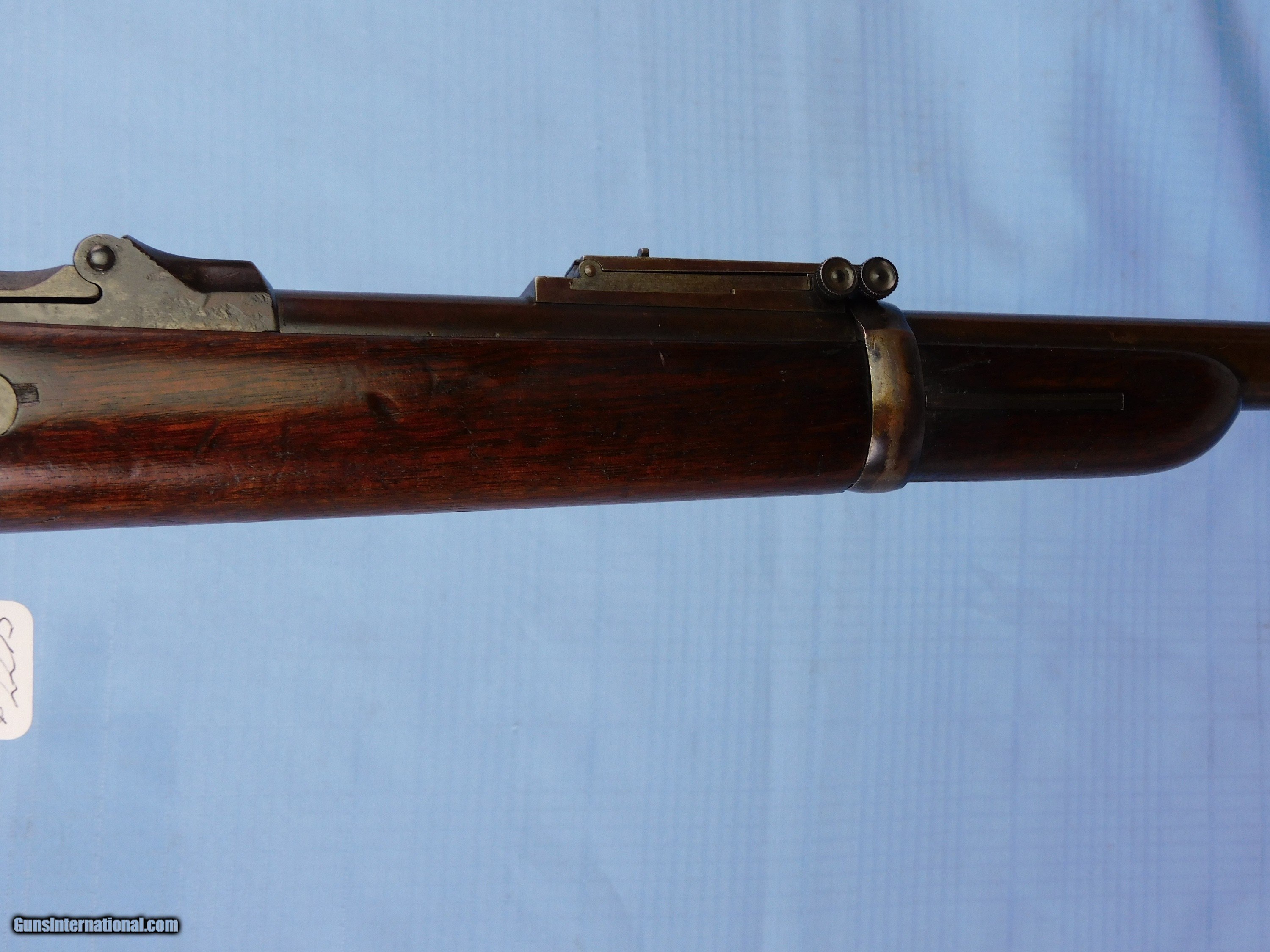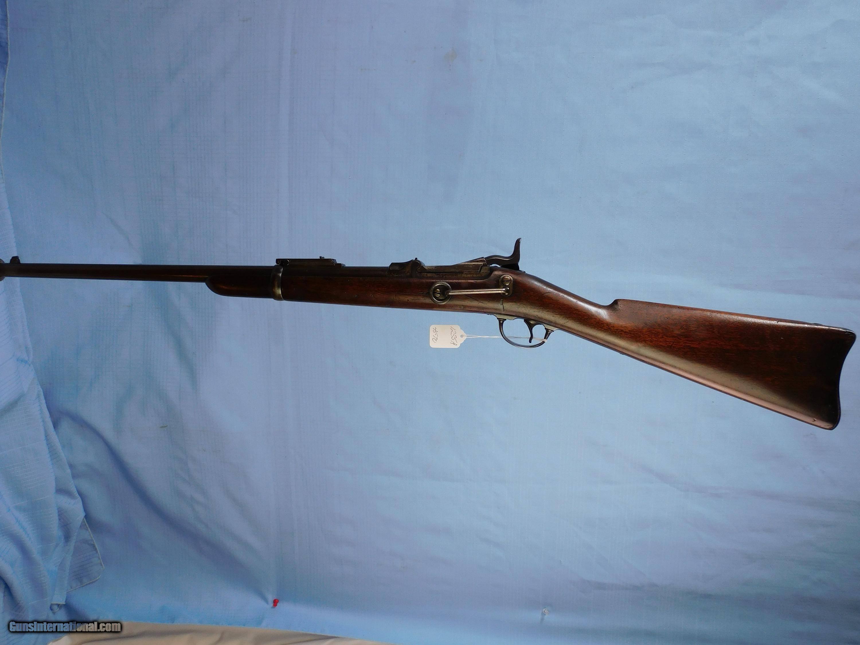 Description: #1235A SPRINGFIELD MODEL 1884 SRC, 45-70, SN 3819XX, 22” bbl., Buffington adjustable rear sights, letter C stamped on rear sight, 3 groove rifling, cleaning rod in butt, good bore, 90% bbl. blue turning brown, VG wood. $2250 SOLD Antique: Yes Rifle Caliber: .45-70 Government |