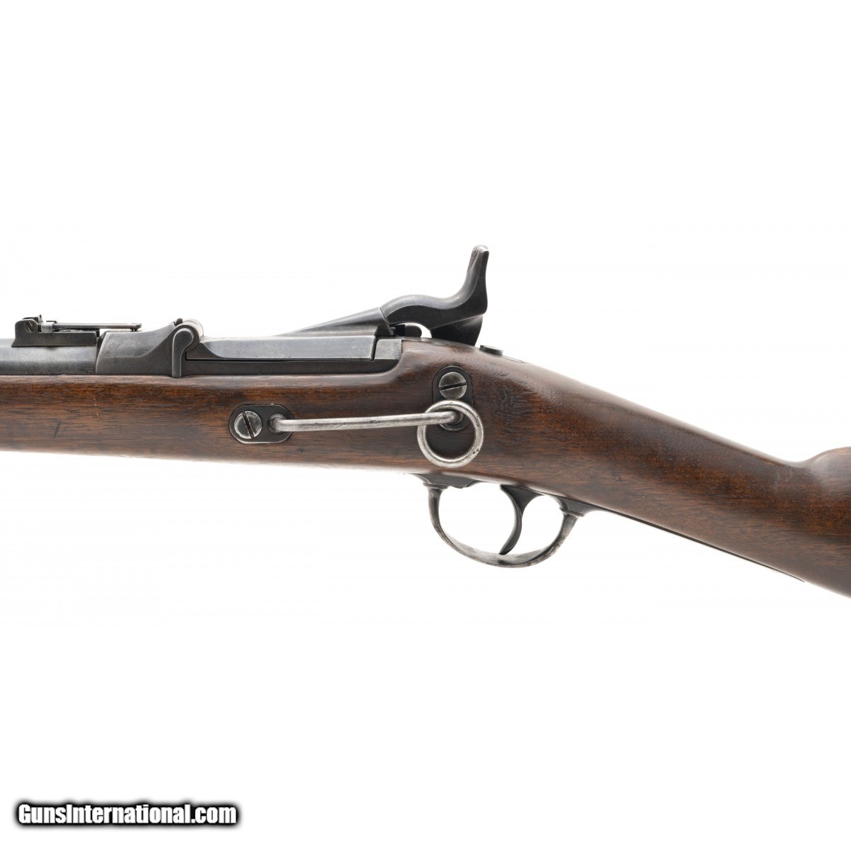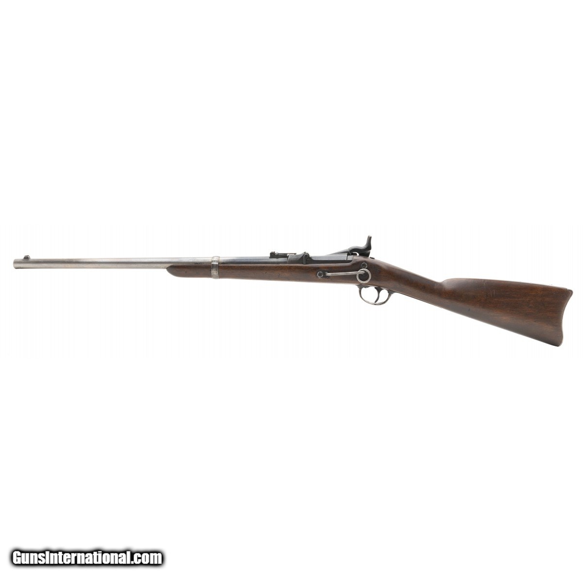 Description: " Rare U.S. Springfield Model 1870 trapdoor carbine chambered in 50-70 with a 22"" barrel. Barrel is grey to blue with pin-prick oxidation visible. Receiver is still in the black, lock plate is a dull blue finish. Wood shows usage and handling wear, bore is good with strong rifling noted. Only 341 were ever manufactured, scarce martial carbine. SOLD Antique: Yes |