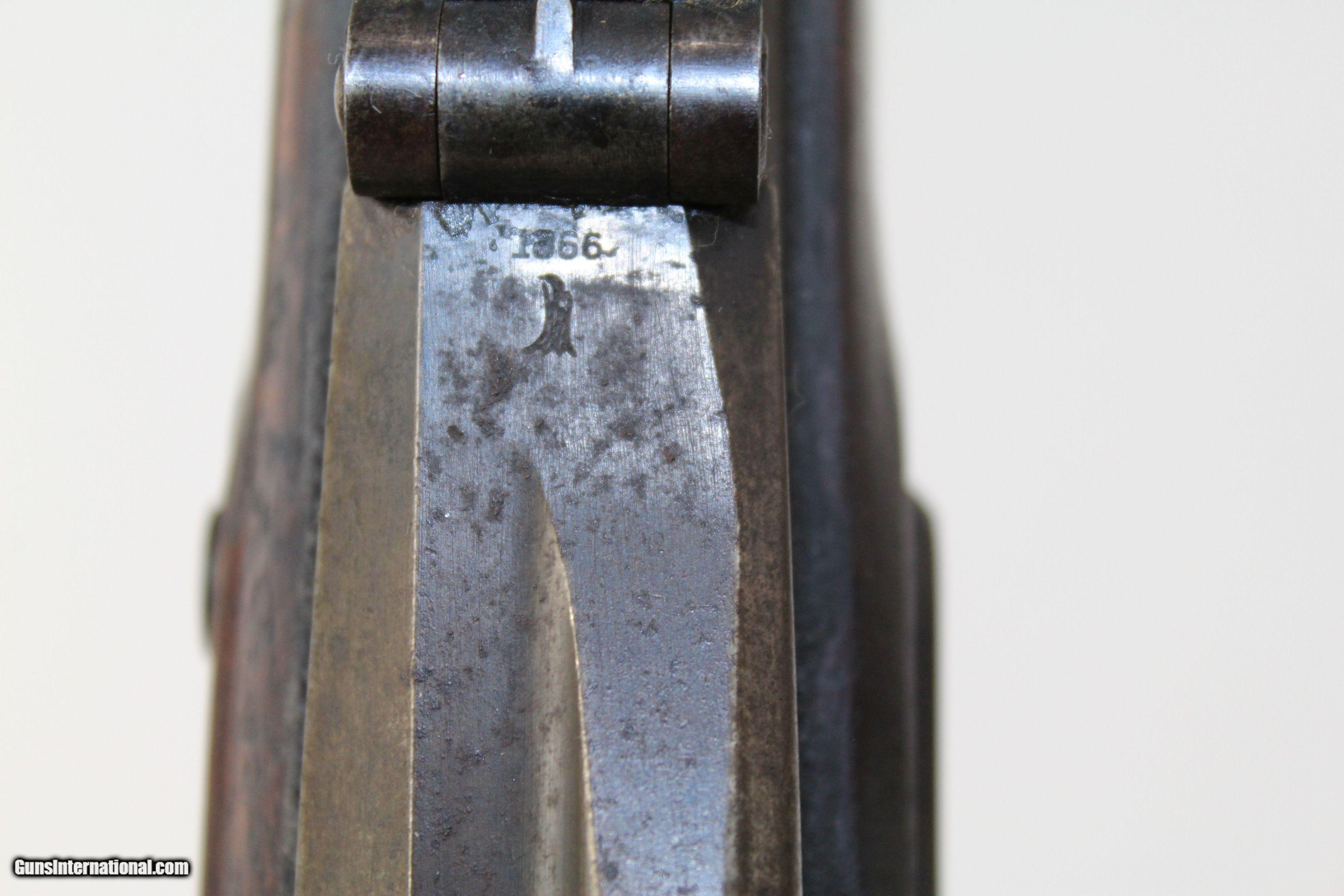 Description: SPRINGFIELD M1866 Allin Conversion TRAPDOOR Rifle .50-70 Made Famous During the Indian Wars Here is an antique Springfield Model 1866 Allin Trapdoor Conversion, the rifle being made in 1864 and then converted in 1866. After the American Civil War, the United States military was slow to adopt new technological advances in firearms and opted to retrofit their enormous surplus inventory of Model 1861 type muskets to fire cartridges. Many different types of conversions were conceived and implemented. This one is named for its inventor, Erskine S. Allin, Master Armorer for Springfield Armory. These conversions were the main infantry weapon of the West and played a large role in the Indian Wars of the late 19th century. 25,000 Model 1863s received the Allin Conversion, enabling them to be loaded via the breach through a “trapdoor” mechanism. The tail of the lock is dated “1864” and the front of the lock is marked “EAGLE/U.S./SPRINGFIELD”. The breech is dated “1866”. The left stock is marked “13”. The top of the butt plate is marked “U.S.” There is a single government inspector cartouche remaining with the initials “HSH”. The bayonet is marked “US” with a smaller “S” inspection mark. The overall condition is good. The metal surfaces are dark with age. The markings are clear and legible. The walnut stock is dark and shows typical handling. There is a gouge on the right side of the butt that caused a splinter, but other than that the stock is solid. The bore is in good condition, dark with sharp rifling. The action is excellent, strong and crisp. Here is a nice example of an early trapdoor rifle! Own the original! This is a legitimate antique and not a reproduction. Barrel is 36-5/8 inches. Caliber: .50-70 GOVT Overall condition as seen in photos. Very Fast. Very Safe. FREE SHIPPING WORLDWIDE. Delivered directly to your door by express mail! Guaranteed AUTHENTIC & Includes CERTIFICATE OF AUTHENTICITY. ancestryguns $1050 #6505 SOLD Antique: Yes |