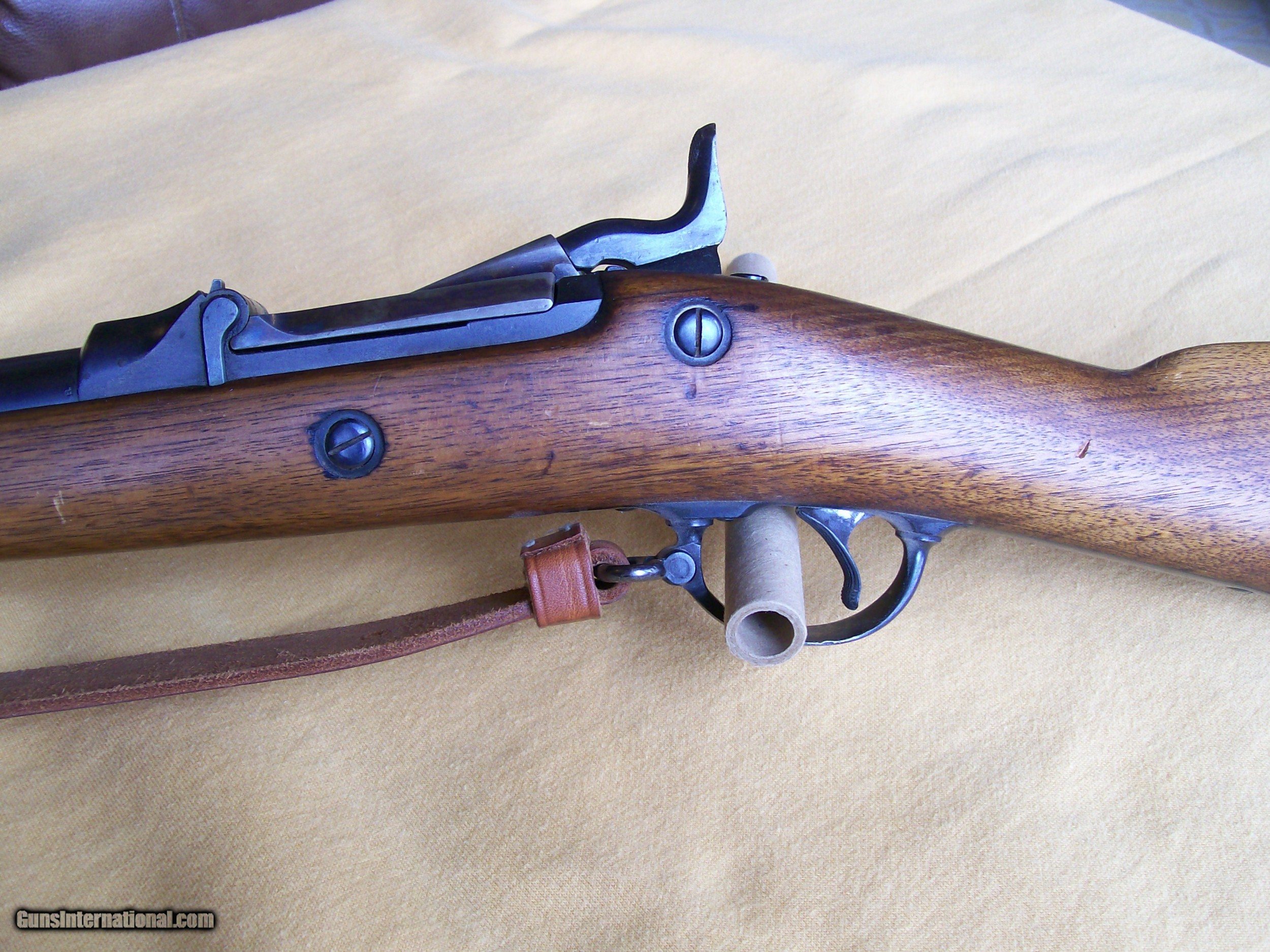 Description: Springfield Model 1873 Trapdoor Ser. No. 477366 made approximately 1889. Very good wood and metal. Blue is in 90% plus condition with lots of case on the cartridge door. Says U.S. Model 1873 on top and on the side action plate. The stock is 90% plus with original finish. There are no cartouche marks on the stock. Bayonet is included. Wonderful old Trapdoor in great shape. $850.00. Free shipping. SOLD Antique: Yes |