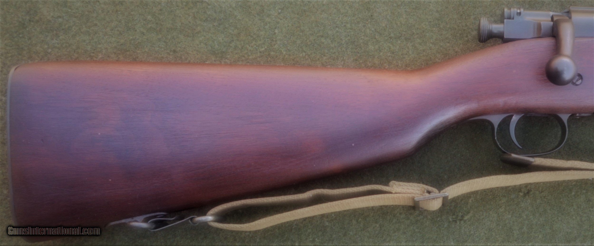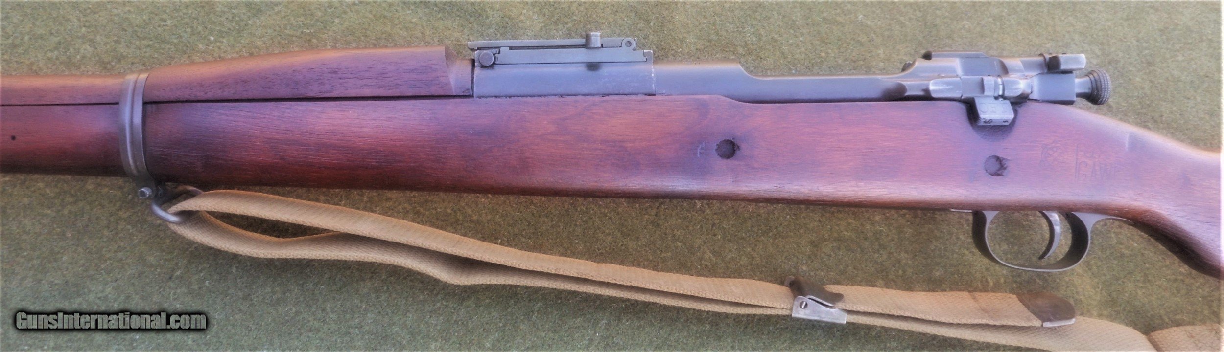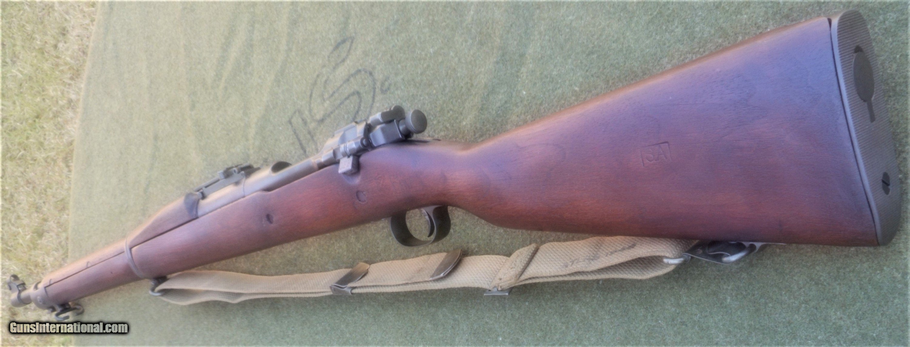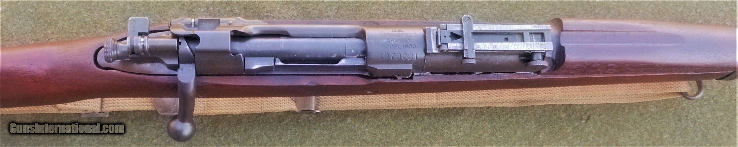 Description: Excellent SA 1903, guaranteed to be an original all GI rifle. The butt stock is an excellent condition, WWII manufacture scant type with an SA GAW rebuild cartouche and inspector markings appropriate for a 1944-45 SA rebuild. The stock set is in excellent rebuilt condition and was apparently refinished and marked with a SA cartouche in an open box after the war. All markings are legible and well-struck. The 4-groove barrel is marked SA 8-44. The bore is absolutely immaculate and the bolt face showsonly minor signs of wear. The stock furniture and butt plate are all milled, and the butt plate is checkered. The bolt body is marked R4 (SA 1942 manufacture) on top of the bolt handle, and with the letter A on the under side of the handle root. The bolt shroud is unmarked, as are the safety, cut off, rear sight assembly and upper band. This rifle appears to have been extensively rebuilt at SA in 1944 or 1945, and then checked and tested and lightly refurbished prior to the Korean War. The flat buckle webb sling is also in very nice condition and is marked Atlas-1944. The sling is also guaranteed to be original G I issue. This fine WWII vintage rifle would make a strong addition to any military collection, and also has the potential to be used as a competition-grade shooter. There is a 3-day, non firing, no disassembly inspection period starting from the time of delivery to your FFL holder. All returns must be recieved in the exact same condition in which they were originally sent to the buyer. Buyer pays all shipping and FFL transfer fees. As with all vinatage firearms, this rifle should be checked by a competent gunsmith before being fired. There is no shooting warranty on any used gun sale. Shooter safety is the sole responsibility of the purchaser. Thanks for your interest. Please feel free to ask any questions you may have. S&I are a flat $45.00 in the lower 48 states. SOLD Curio/Relic: Yes Manufacturer: US Springfield Armory Model: 1903 Springfield Serial Number: 1279081 Caliber Info: 30.06 Bore: Like new Condition: Excellent rebuilt |