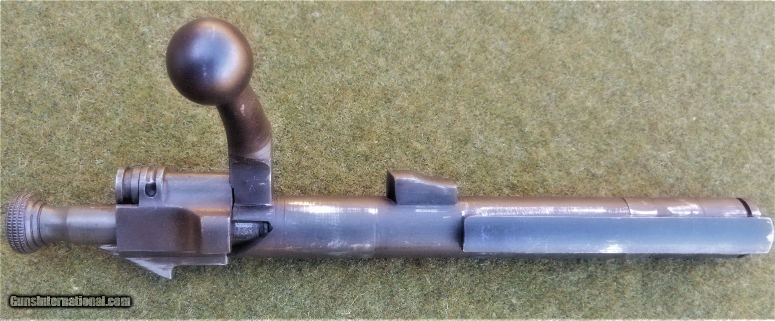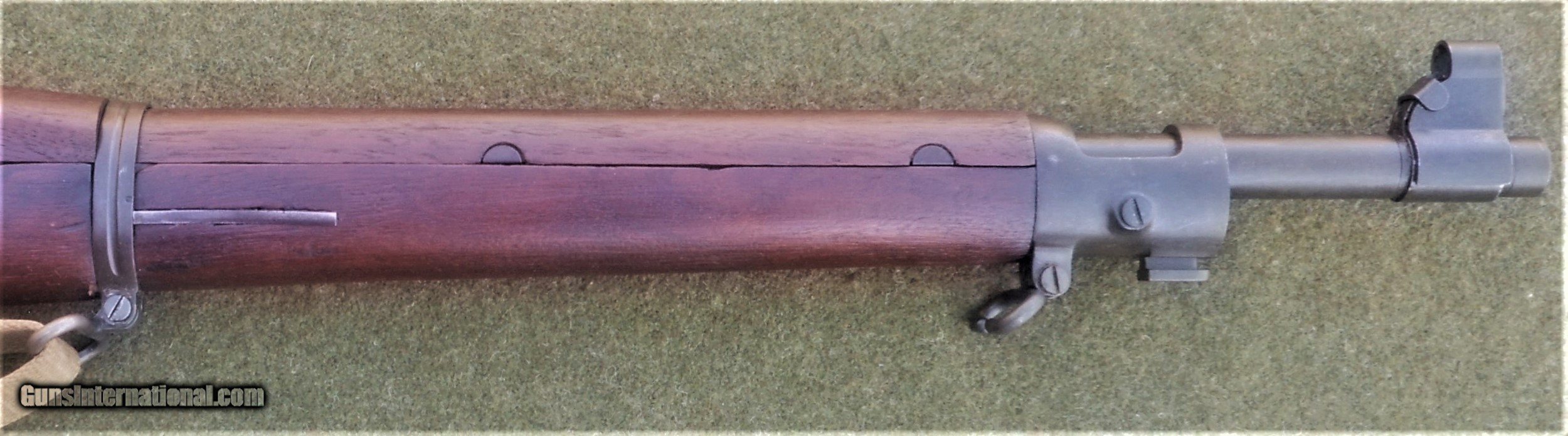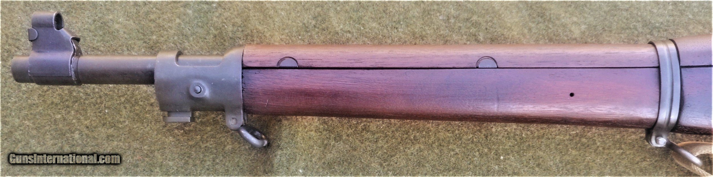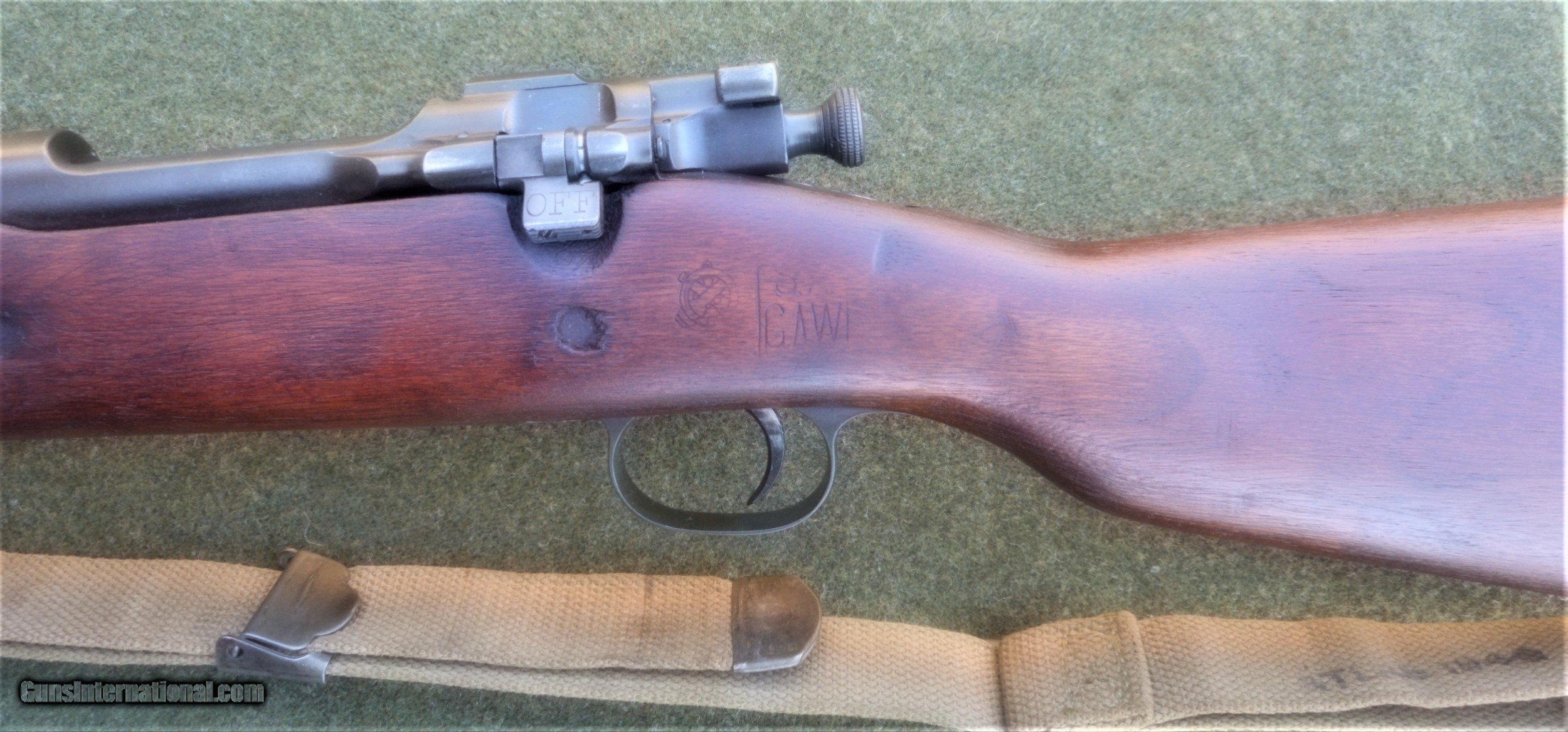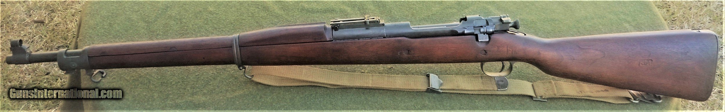 Description: Excellent SA 1903, guaranteed to be an original all GI rifle. The butt stock is an excellent condition, WWII manufacture scant type with an SA GAW rebuild cartouche and inspector markings appropriate for a 1944-45 SA rebuild. The stock set is in excellent rebuilt condition and was apparently refinished and marked with a SA cartouche in an open box after the war. All markings are legible and well-struck. The 4-groove barrel is marked SA 8-44. The bore is absolutely immaculate and the bolt face showsonly minor signs of wear. The stock furniture and butt plate are all milled, and the butt plate is checkered. The bolt body is marked R4 (SA 1942 manufacture) on top of the bolt handle, and with the letter A on the under side of the handle root. The bolt shroud is unmarked, as are the safety, cut off, rear sight assembly and upper band. This rifle appears to have been extensively rebuilt at SA in 1944 or 1945, and then checked and tested and lightly refurbished prior to the Korean War. The flat buckle webb sling is also in very nice condition and is marked Atlas-1944. The sling is also guaranteed to be original G I issue. This fine WWII vintage rifle would make a strong addition to any military collection, and also has the potential to be used as a competition-grade shooter. There is a 3-day, non firing, no disassembly inspection period starting from the time of delivery to your FFL holder. All returns must be recieved in the exact same condition in which they were originally sent to the buyer. Buyer pays all shipping and FFL transfer fees. As with all vinatage firearms, this rifle should be checked by a competent gunsmith before being fired. There is no shooting warranty on any used gun sale. Shooter safety is the sole responsibility of the purchaser. Thanks for your interest. Please feel free to ask any questions you may have. S&I are a flat $45.00 in the lower 48 states. SOLD Curio/Relic: Yes Manufacturer: US Springfield Armory Model: 1903 Springfield Serial Number: 1279081 Caliber Info: 30.06 Bore: Like new Condition: Excellent rebuilt |