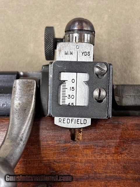 Description: Years ago, when these guns were a dime a dozen, folks would adapt them to sporter use by installing receiver sights and/or drilling and tapping them for scope bases. That is exactly what happened to this excellent original high number Springfield 1903. It now sports an original Redfield receiver sight as shown. We're saddened by it today, but back then it was the "cat's meow" and we would see many of these inexpensive surplus guns in the deer woods as a poor man's deer gun. I guess that's why the untouched guns are worth so much..... SOLD Curio/Relic: Yes Rifle Caliber: .30-06 Springfield |