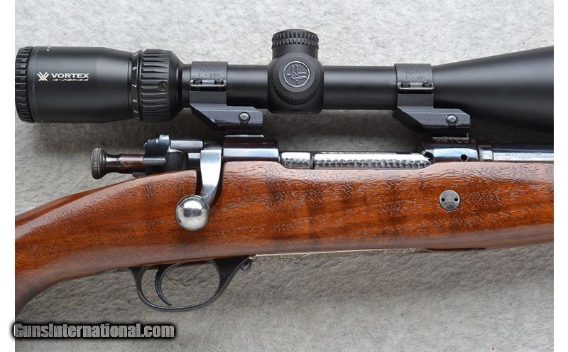 Description: This Springfield Armory Model 1903 is a right hand bolt action rifle in .338 Win. Mag. It has a 24 inch barrel. It is outfitted with a Vortex Crossfire II 4-12x44 Scope. No iron sights. The butt stock is a smooth grip walnut pistol grip with a raised cheekpiece and rosewood cap. The forearm is a smooth grip walnut with a rosewood tip. It has a coin finished hinged floorplate that is engraved with oak leaf and a buck deer in an outdoor scene. S/N 841083. Jack Ladwig is stamped on the barrel. .338 Winchester Magnum SOLD Chambers: Right hand bolt action 4 round internal magazine with an engraved hinged floorplate. Metal Condition: Very good. Some minor handling marks. Wood Condition: Very good. Appears refinished. Bore Condition: Excellent. Barrels: 24 inches. Triggers: Grooved. Stock Dimensions: LOP 14 3/8 inches. Fore End: Smooth grip walnut with a rosewood tip. Butt Pad: Decelerator rubber recoil pad. Weight: 8 lb. 10 oz. Sights: Vortex 4-12x44 Crossfire II Scope. No iron sights. Item Location: Richfield, WI |