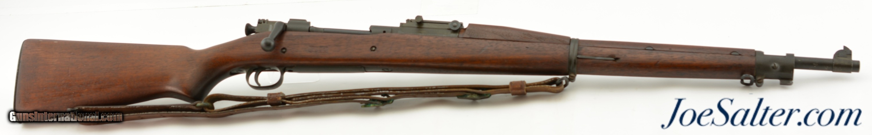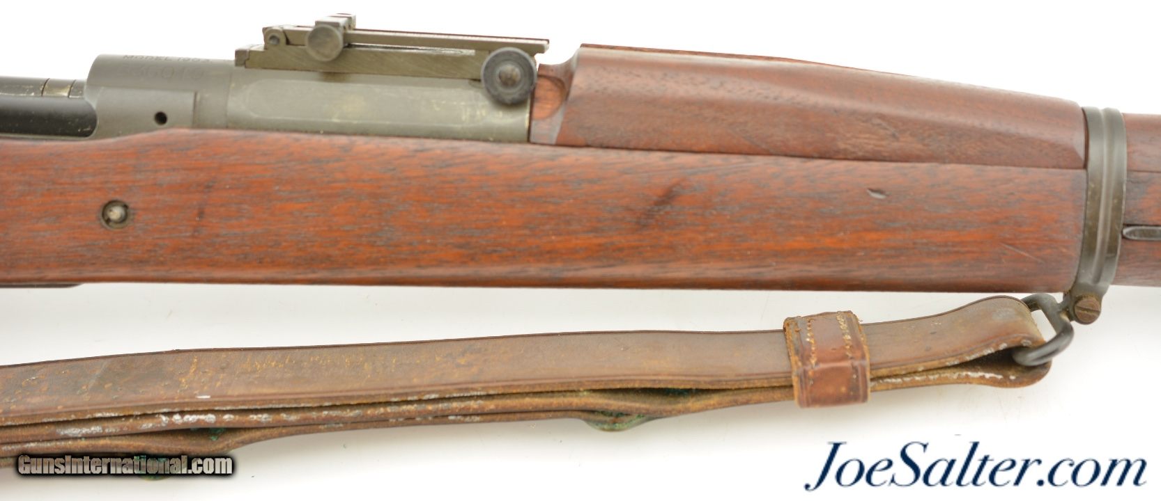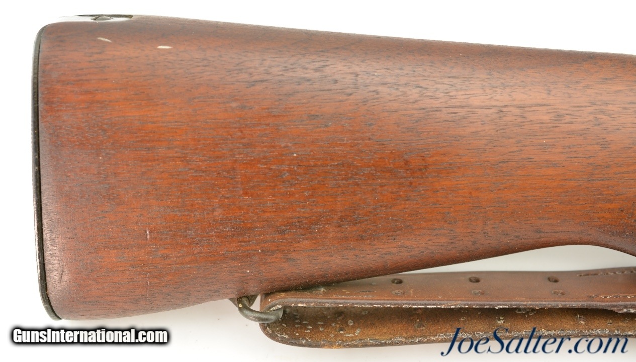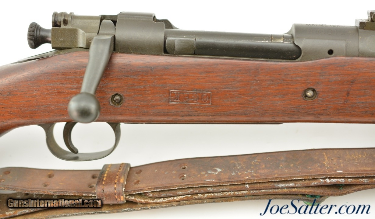 Description: Serial #836019, .30-06, 24" barrel with an excellent, bright bore. This rifle has a 1918-made Springfield receiver mated to a 6-30 dated SA barrel. The metal retains 97-98% of the arsenal-applied parkerized finish, with some mild silvering at the muzzle, along some of the high edges, and on the bearing surfaces of the bolt. The walnut stock and humped handguard are in excellent shape with only some minor handling marks marring the otherwise excellent military oil finish. The stock is not proofmarked, but two "O.G.E.K." cartouches (Ogden Arsenal, Elmer Keith) are present, one on either side of the receiver. The stock compartment is empty but a Hoyt-made, 1918 dated Model 1907 leather sling in fine condition is installed. This is a handsome ‘03-A1 configured rifle, and is in excellent condition overall. FFL or C&R; SOLD Curio/Relic: Yes |