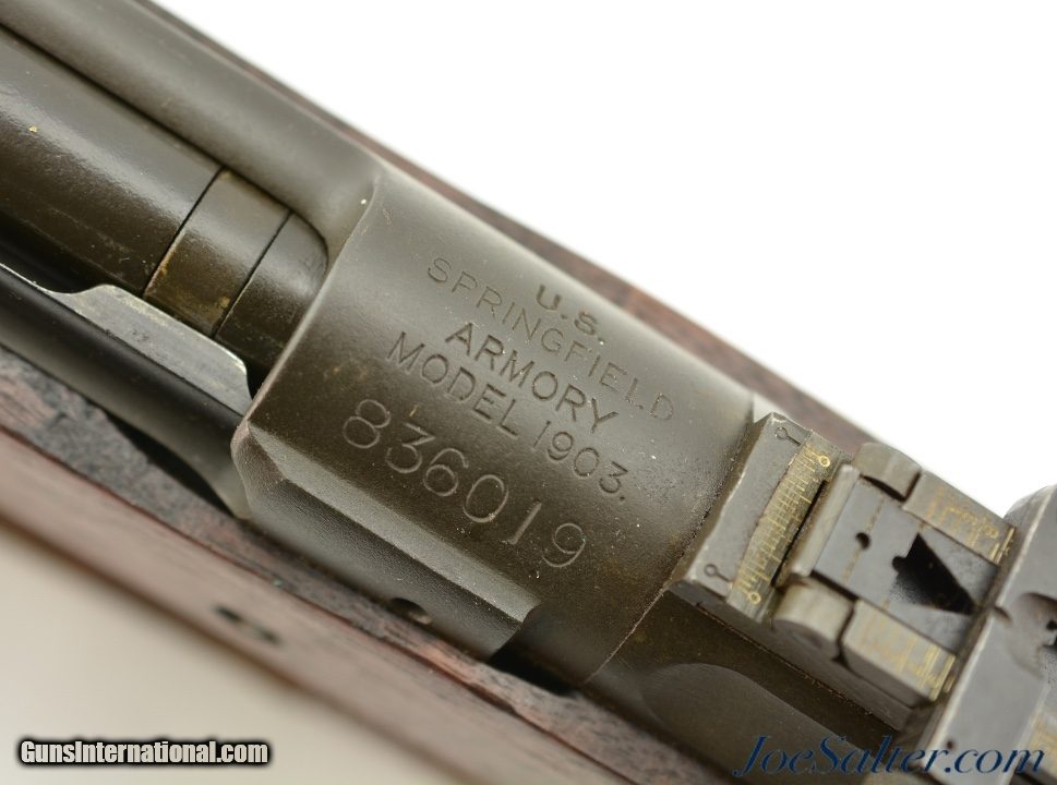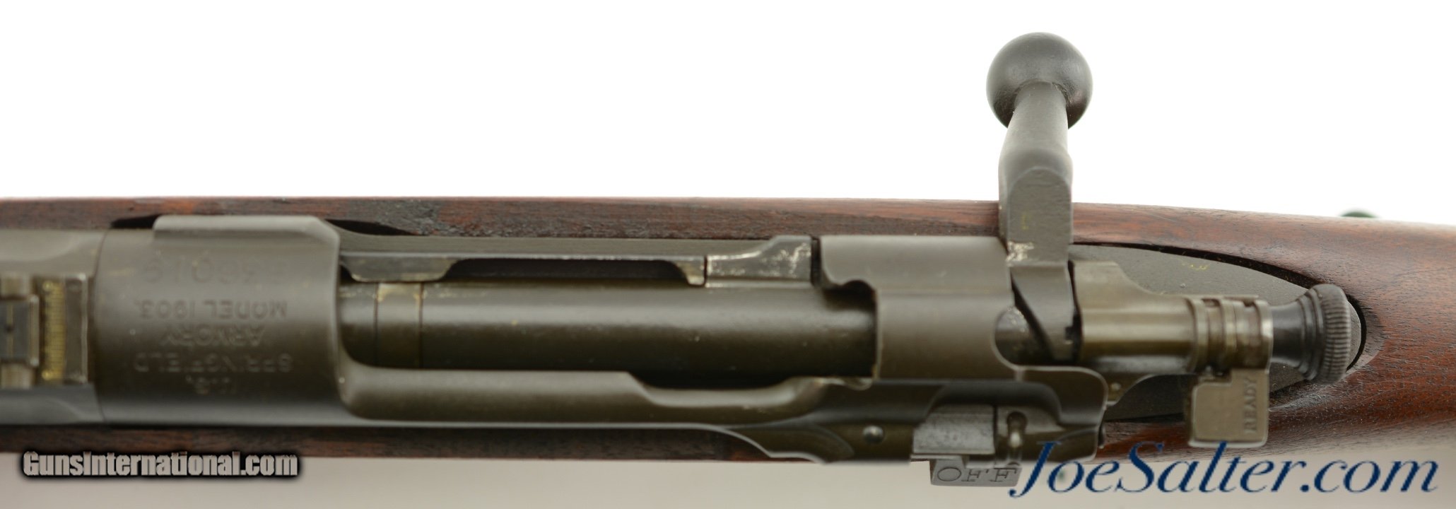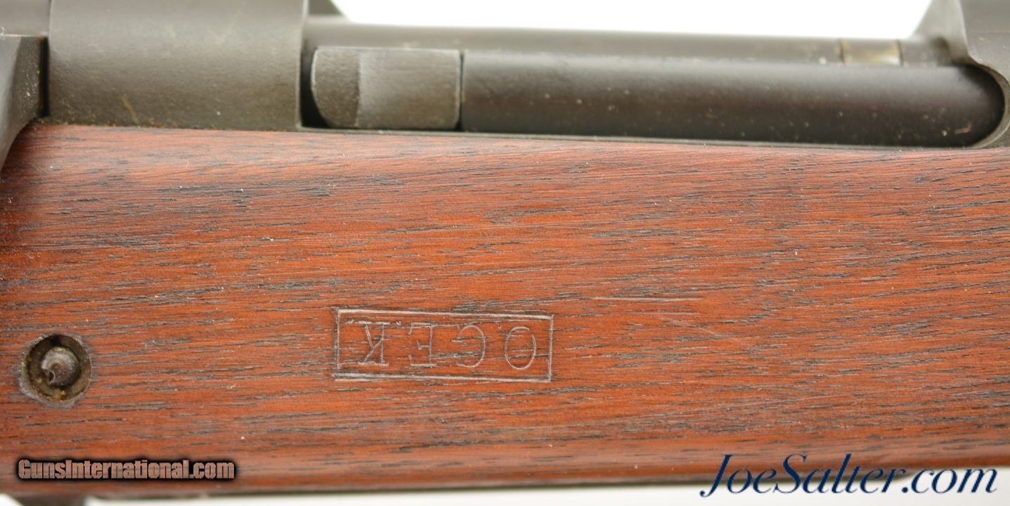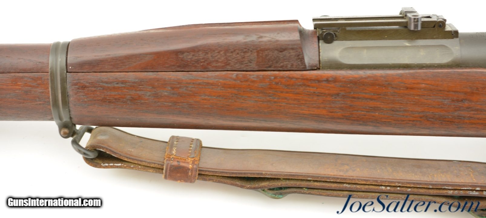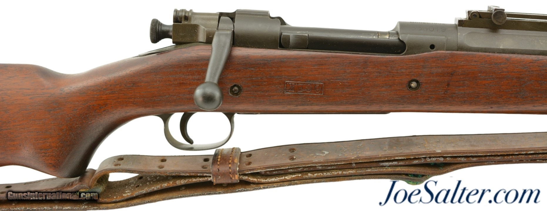 Description: Serial #836019, .30-06, 24" barrel with an excellent, bright bore. This rifle has a 1918-made Springfield receiver mated to a 6-30 dated SA barrel. The metal retains 97-98% of the arsenal-applied parkerized finish, with some mild silvering at the muzzle, along some of the high edges, and on the bearing surfaces of the bolt. The walnut stock and humped handguard are in excellent shape with only some minor handling marks marring the otherwise excellent military oil finish. The stock is not proofmarked, but two "O.G.E.K." cartouches (Ogden Arsenal, Elmer Keith) are present, one on either side of the receiver. The stock compartment is empty but a Hoyt-made, 1918 dated Model 1907 leather sling in fine condition is installed. This is a handsome ‘03-A1 configured rifle, and is in excellent condition overall. FFL or C&R; SOLD Curio/Relic: Yes |