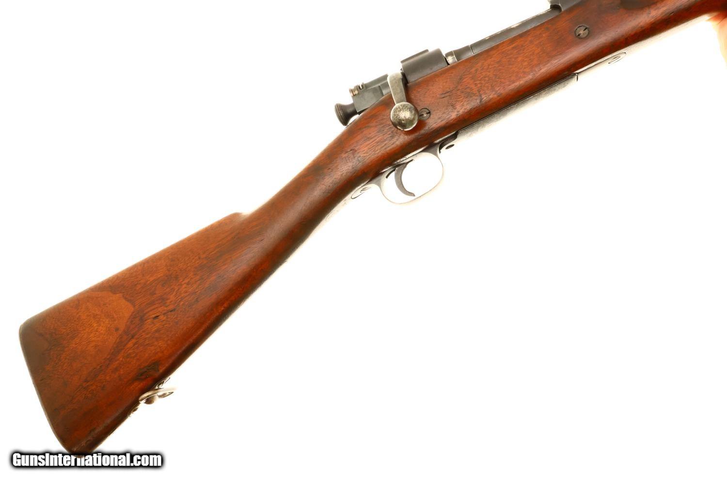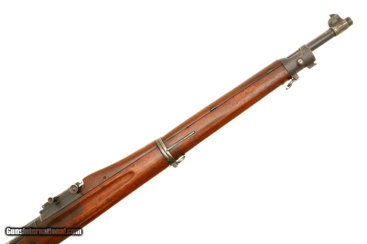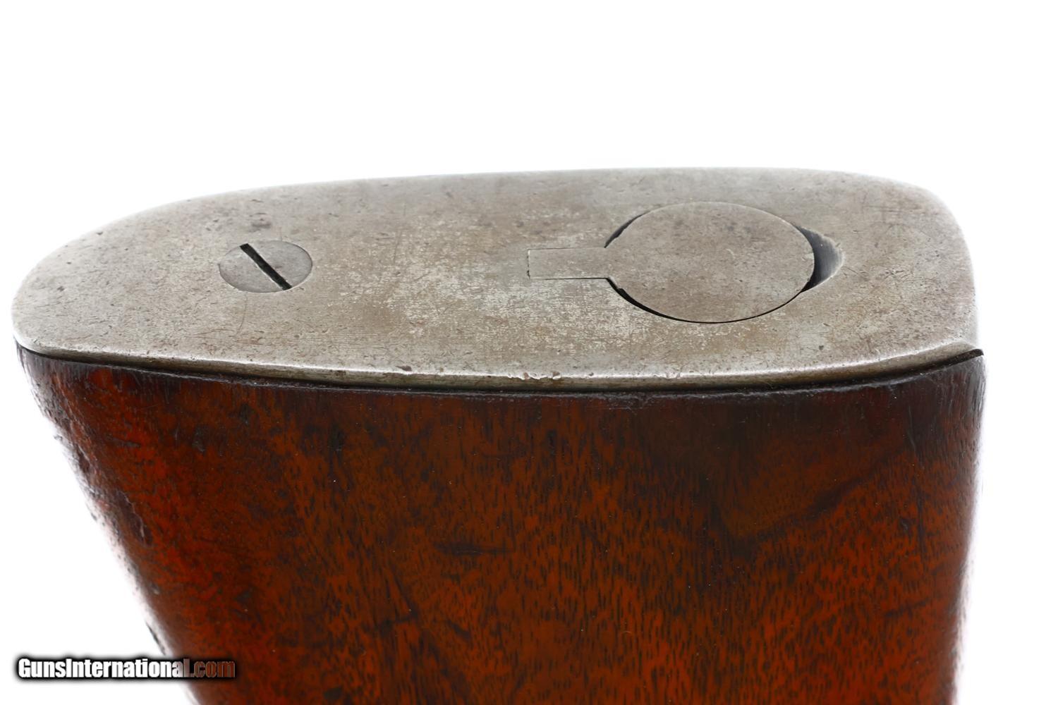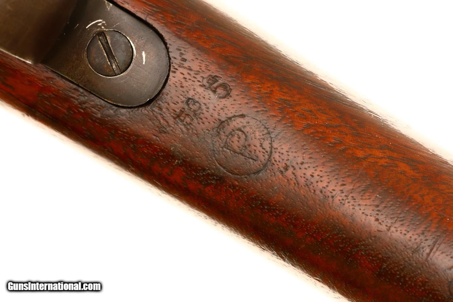 Description: Synopsis: All original Springfield 1903 U.S. Military WWI bolt action rifle, barrel dated 2-18. Description: Standard configuration Springfield Model 1903 rifle, SN 905044, chambered in .30-06, has blade front and ladder style (graded 1-27) rear sights, barrel marked "SA/flaming bomb/2-18", standard receiver markings that reflect manufacturer, model, and SN, and straight bolt. Smooth straight grip "S" stock with finger grooves, high hump handguard with sighting channel, light inspection cartouche appears to be an eagle head/Y59, double reinforcing bolts, and smooth steel trapdoor buttplate. Condition: G/VG overall condition with faded original blue in the usual contact areas, particularly noticeable on left side of bayonet mount. Stock with original varnish, oil darkening, and scattered bruising. Bright bore with sharp rifling. Correct manual mechanics. A nice, honest, U.S Springfield Armory 1903 rifle. SOLD Curio/Relic: Yes Manufacturer: Springfield Model: 1903 Serial Number: 905044 Caliber Info: .30-06 Condition: G/VG |