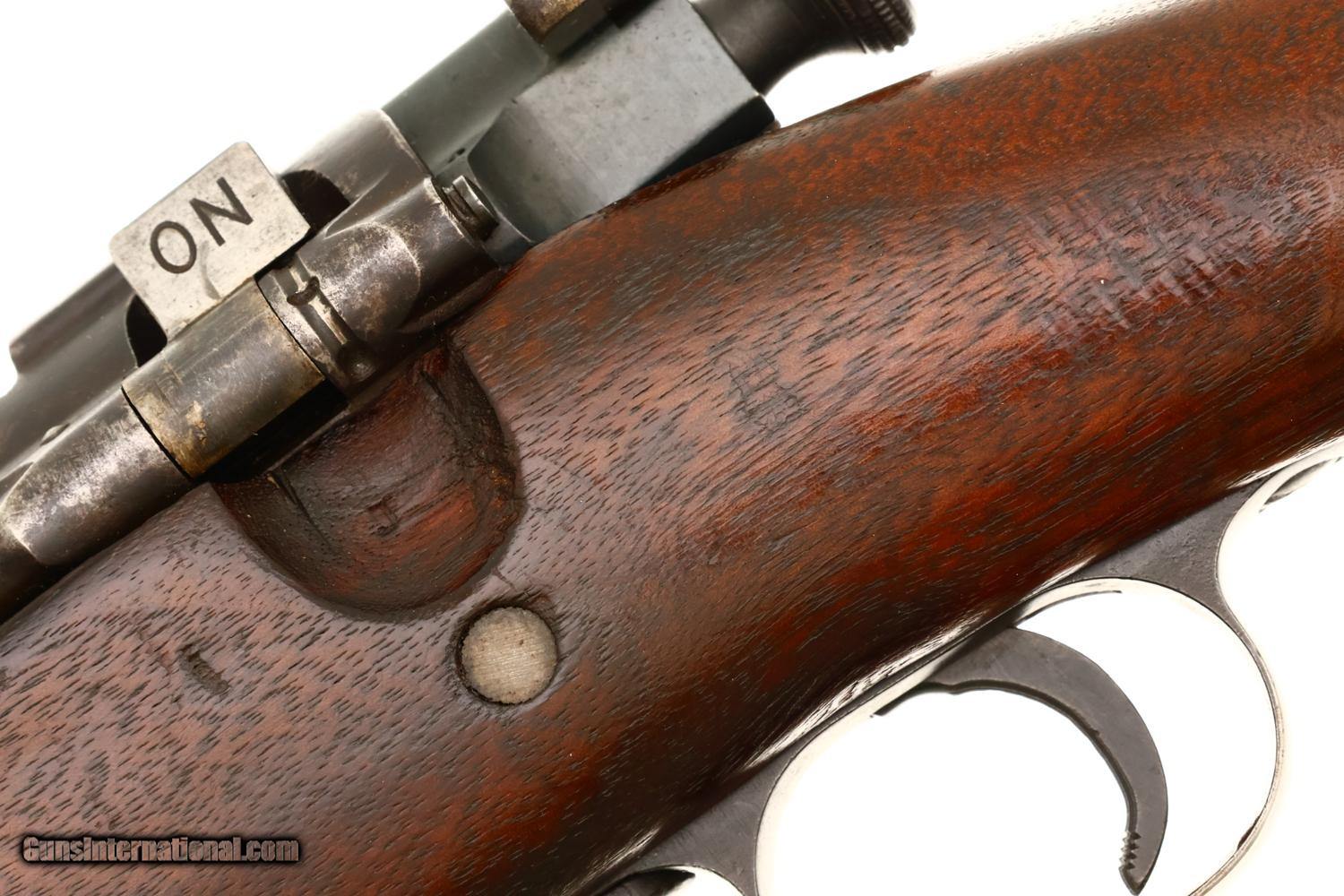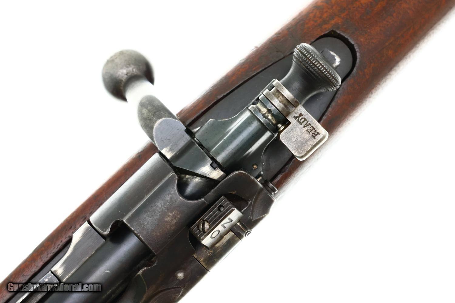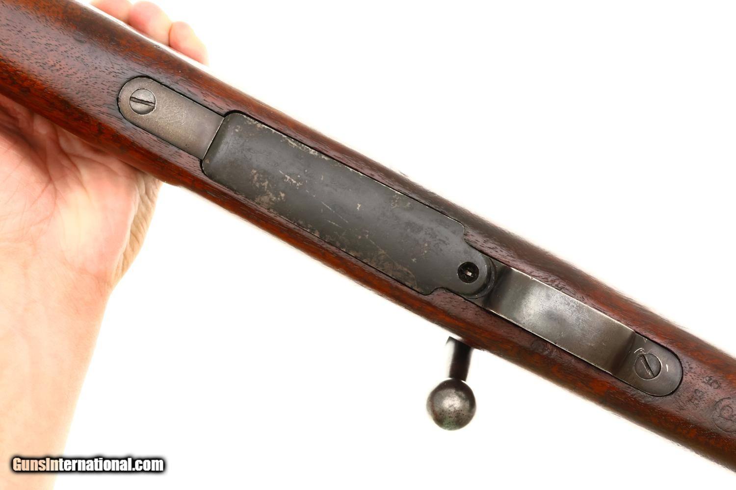 Description: Synopsis: All original Springfield 1903 U.S. Military WWI bolt action rifle, barrel dated 2-18. Description: Standard configuration Springfield Model 1903 rifle, SN 905044, chambered in .30-06, has blade front and ladder style (graded 1-27) rear sights, barrel marked "SA/flaming bomb/2-18", standard receiver markings that reflect manufacturer, model, and SN, and straight bolt. Smooth straight grip "S" stock with finger grooves, high hump handguard with sighting channel, light inspection cartouche appears to be an eagle head/Y59, double reinforcing bolts, and smooth steel trapdoor buttplate. Condition: G/VG overall condition with faded original blue in the usual contact areas, particularly noticeable on left side of bayonet mount. Stock with original varnish, oil darkening, and scattered bruising. Bright bore with sharp rifling. Correct manual mechanics. A nice, honest, U.S Springfield Armory 1903 rifle. SOLD Curio/Relic: Yes Manufacturer: Springfield Model: 1903 Serial Number: 905044 Caliber Info: .30-06 Condition: G/VG |