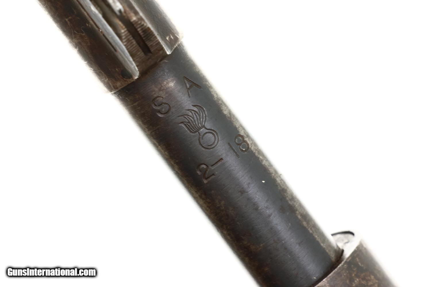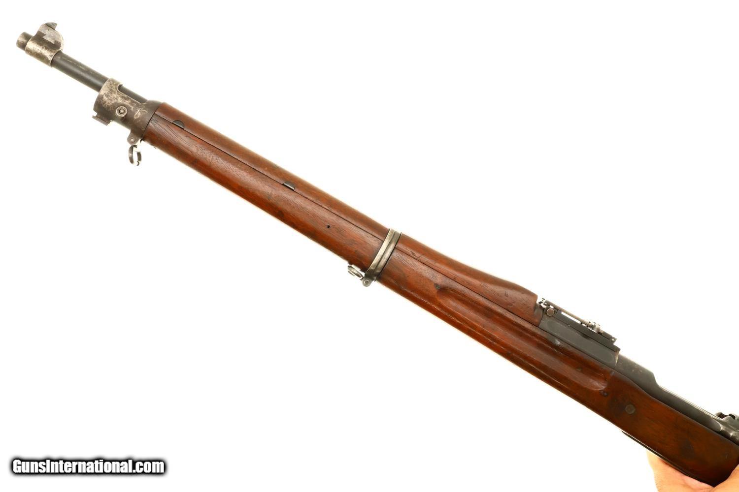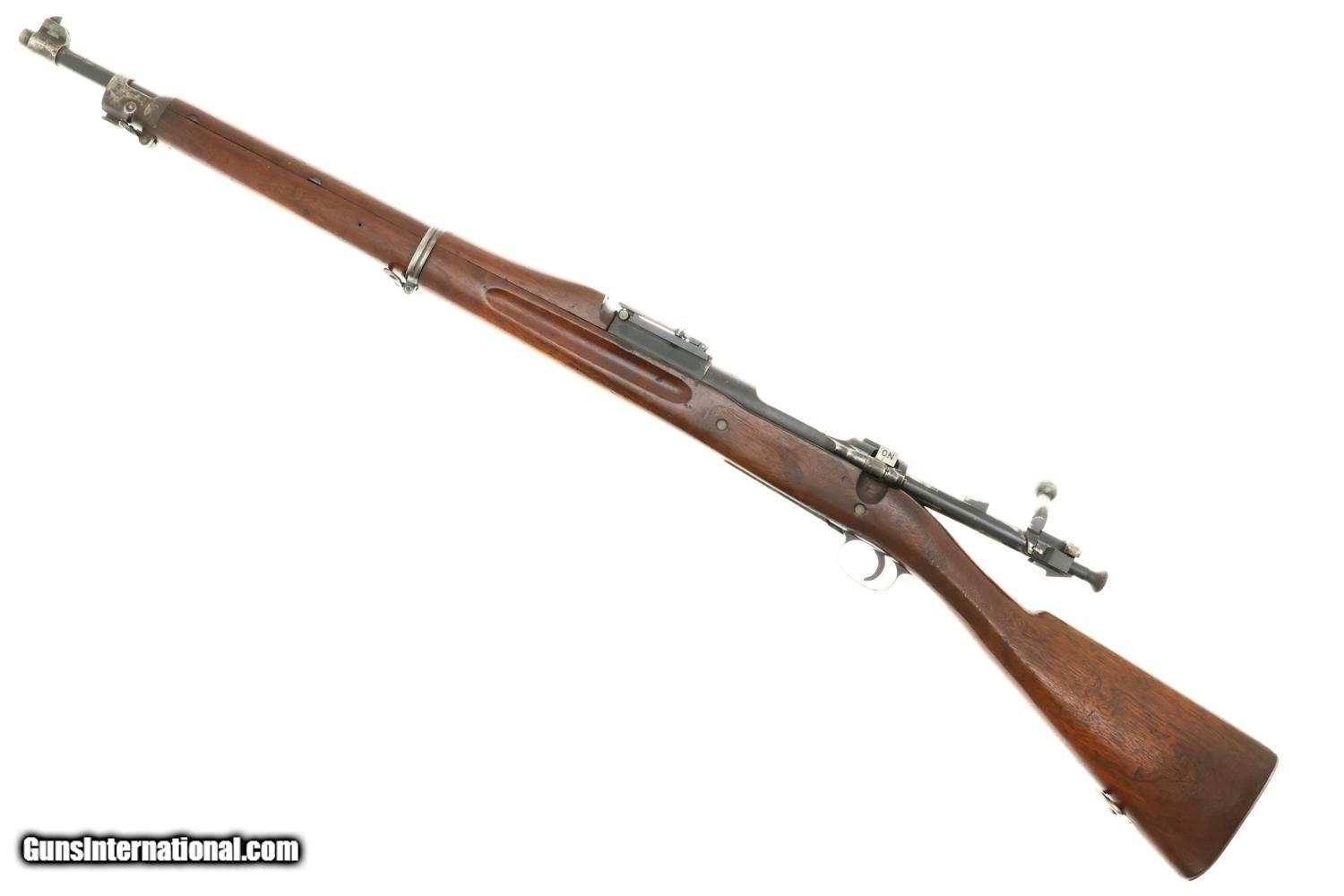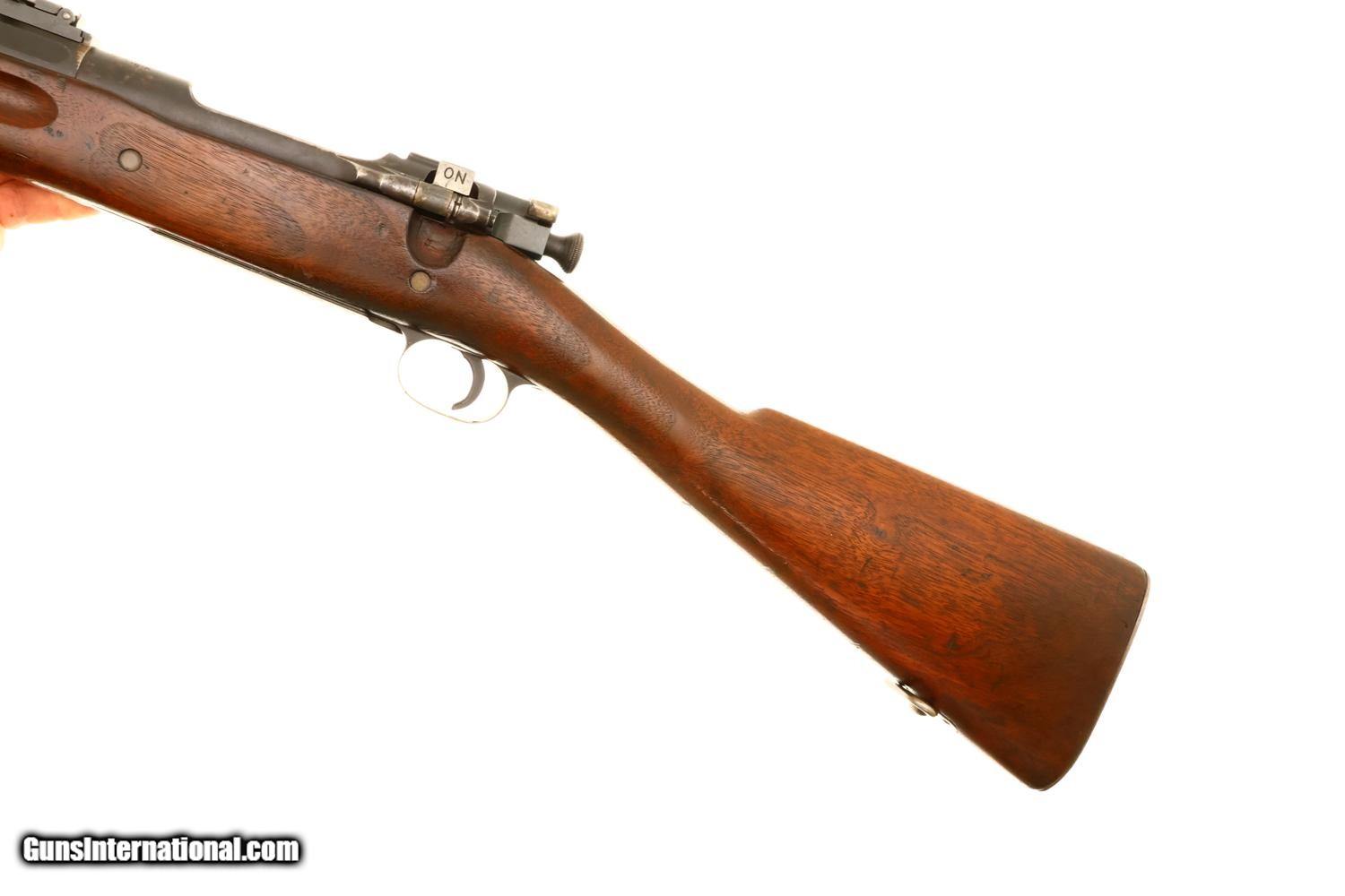 Description: Synopsis: All original Springfield 1903 U.S. Military WWI bolt action rifle, barrel dated 2-18. Description: Standard configuration Springfield Model 1903 rifle, SN 905044, chambered in .30-06, has blade front and ladder style (graded 1-27) rear sights, barrel marked "SA/flaming bomb/2-18", standard receiver markings that reflect manufacturer, model, and SN, and straight bolt. Smooth straight grip "S" stock with finger grooves, high hump handguard with sighting channel, light inspection cartouche appears to be an eagle head/Y59, double reinforcing bolts, and smooth steel trapdoor buttplate. Condition: G/VG overall condition with faded original blue in the usual contact areas, particularly noticeable on left side of bayonet mount. Stock with original varnish, oil darkening, and scattered bruising. Bright bore with sharp rifling. Correct manual mechanics. A nice, honest, U.S Springfield Armory 1903 rifle. SOLD Curio/Relic: Yes Manufacturer: Springfield Model: 1903 Serial Number: 905044 Caliber Info: .30-06 Condition: G/VG |