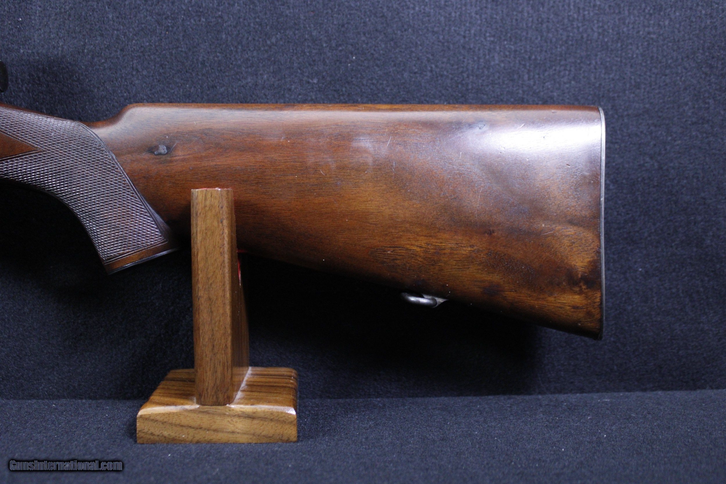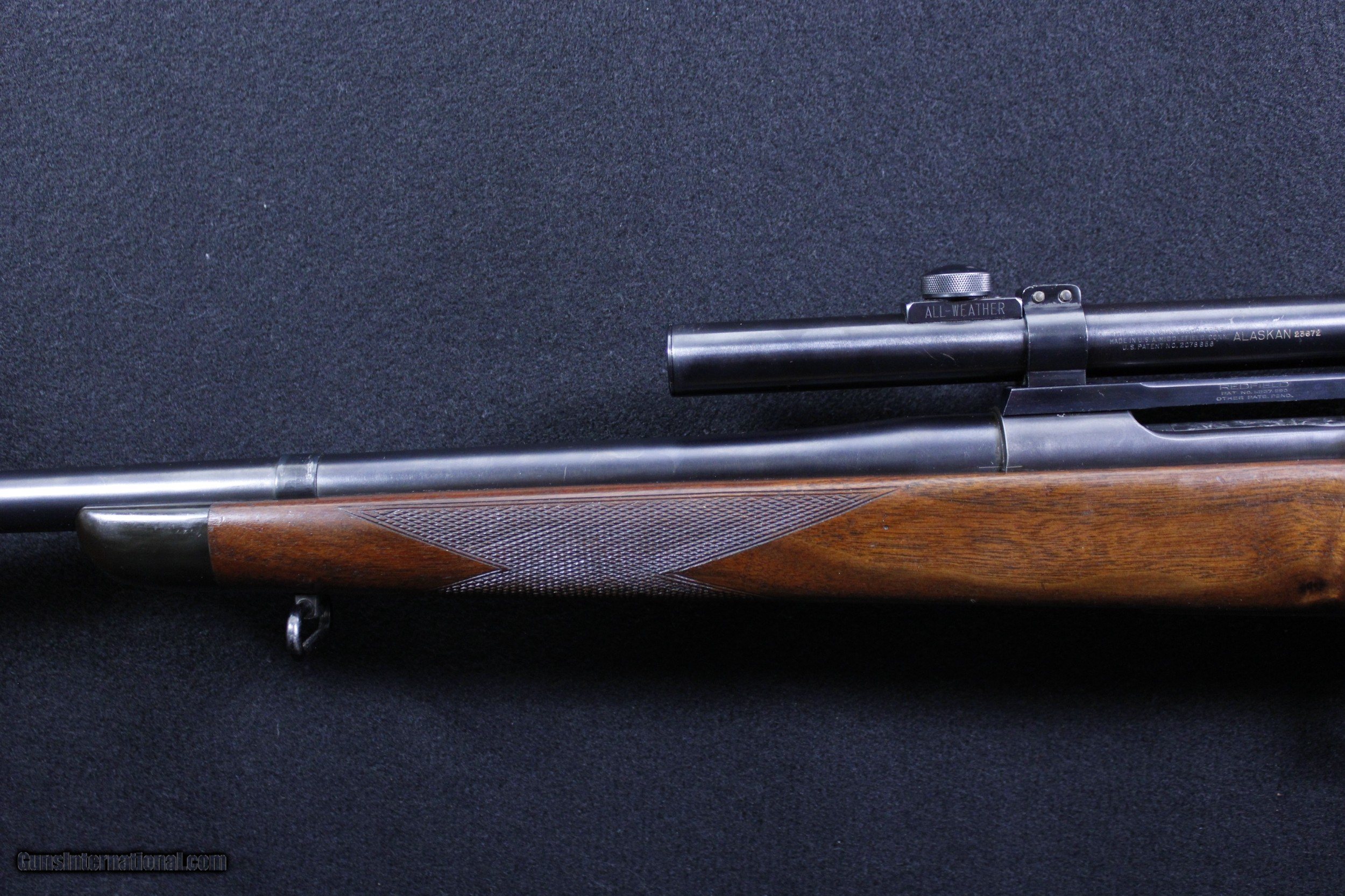 Description: Springfield Armory 1903 Custom Sporter .30-06 manufactured in 1932. Rifle is in very good overall condition. Wood shows some minor handling marks as well as an area that has been filled where a receiver sight was installed. Checkering has remained crisp. Bore is bright and clear with well defined lands and grooves. Some wear to the finish. Comes with a Lyman Alaskan 2 1/2X scope in redfield rings and bases. Mechanically excellent. Dimensions are as follows; BBL. 24" WT. 9lb. 12oz. DIM. 13 3/8" L.O.P. SOLD |