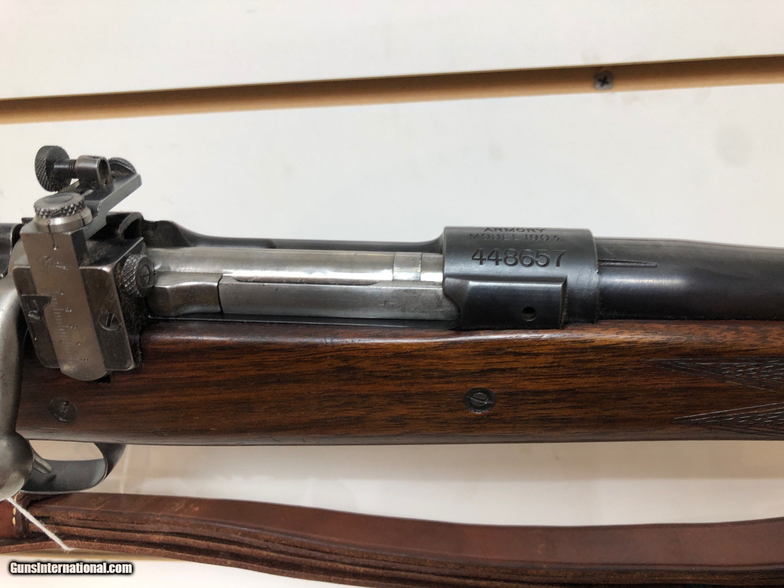 Description: Springfield Armory Model 1903, WIth Leather Strap. SOLD Manufacturer: Springfield Model: 1903 Serial Number: 448657 |