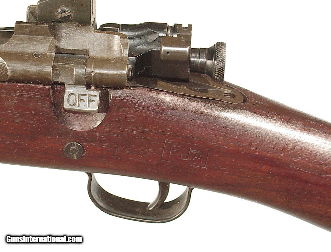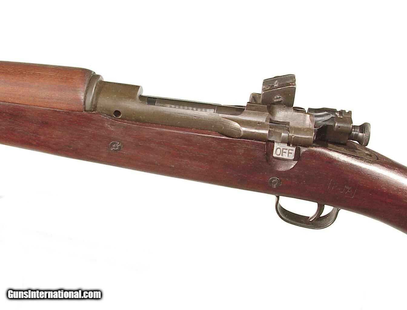 Description: .30-06 caliber, 24" barrel dated "5-43" at the muzzle. Bolt action with adjustable rear receiver sight. Parkerized finish on all metal parts. Full length walnut stock handguard the U.S. inspector's cartouche appears on the left side. In unissued condition retaining all of the parkerized finish. Mint bore and excellent wood. Curio/Relic: Yes Price: $1,895.00 Contact Seller |