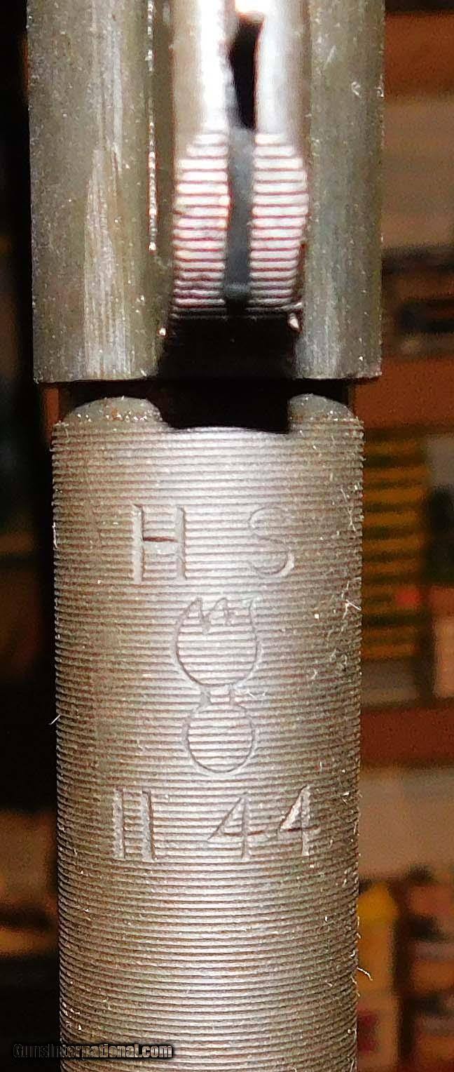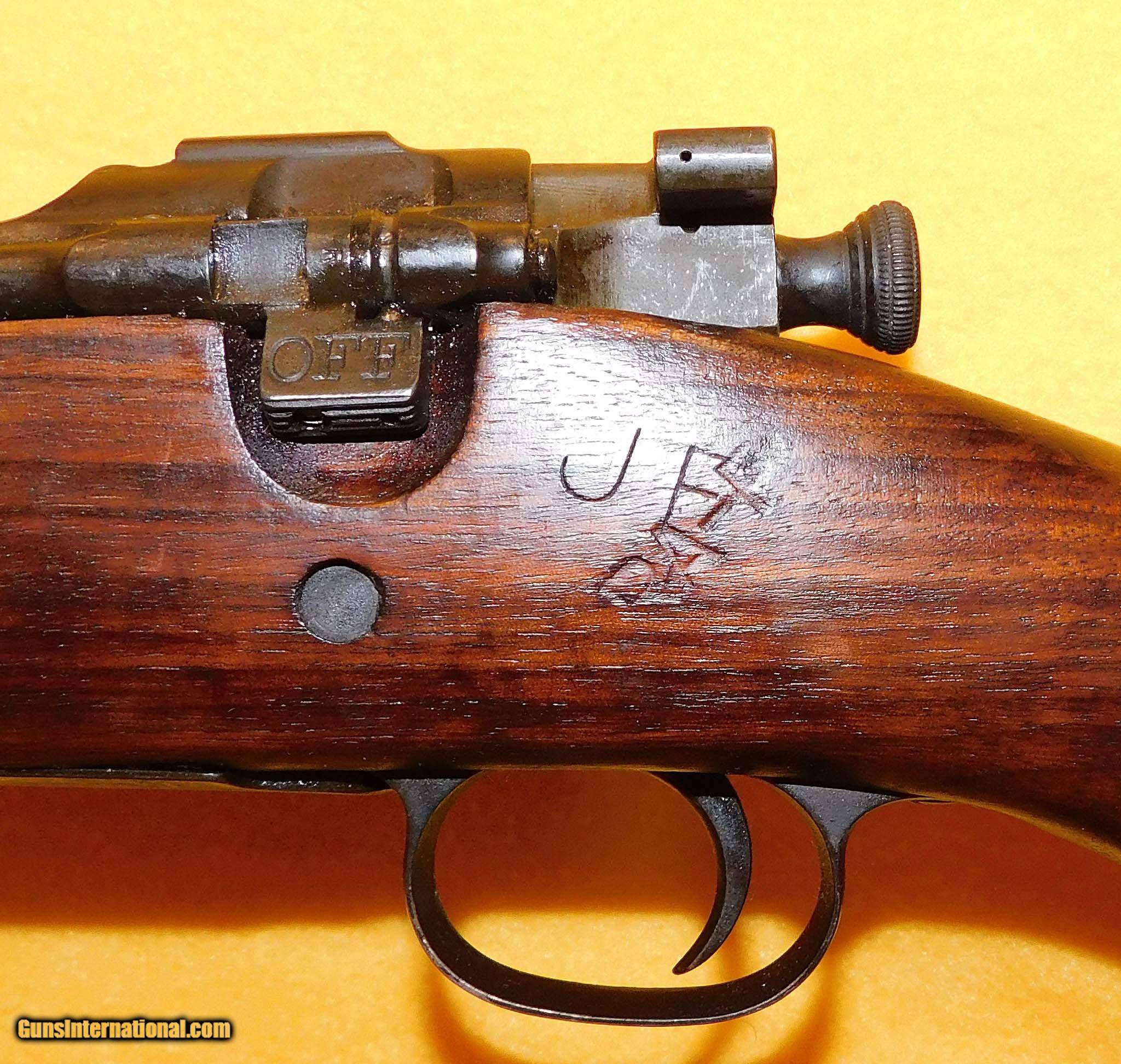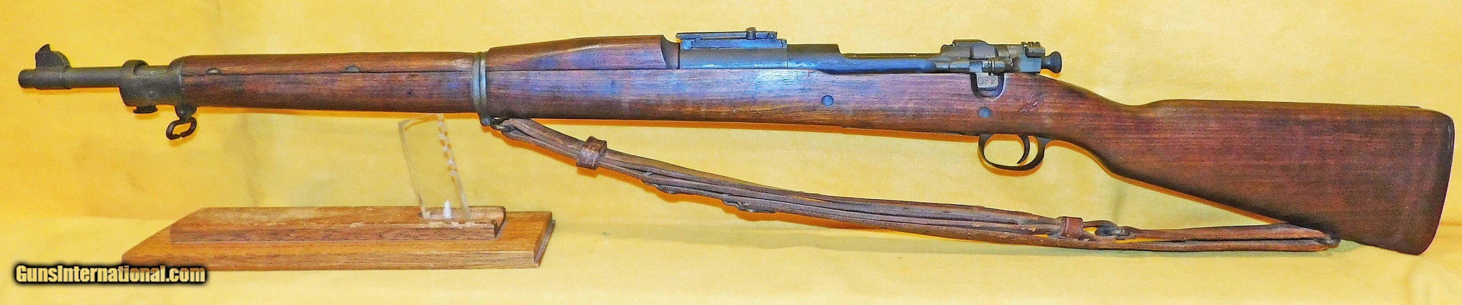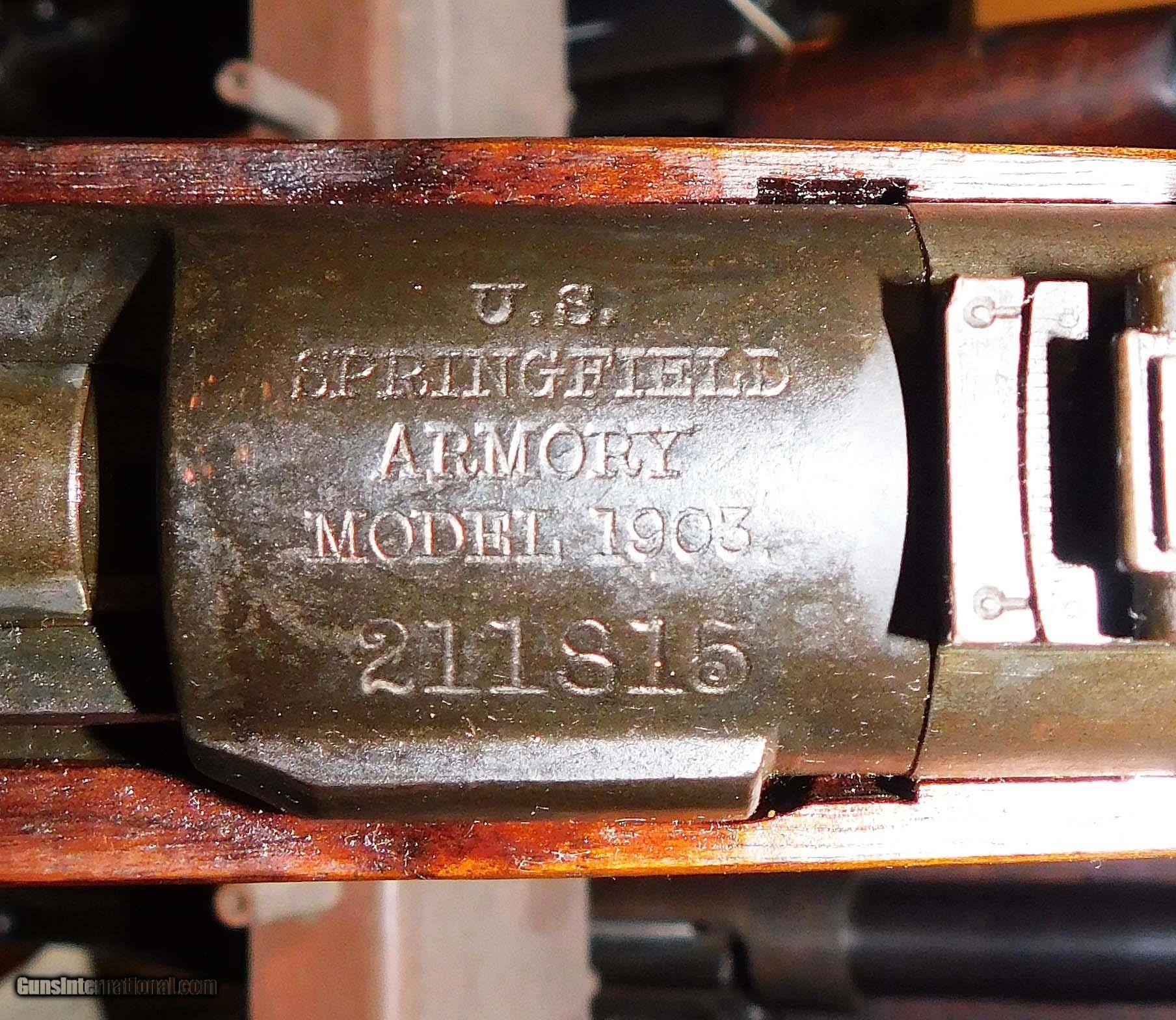 Description: U.S. SPRINGFIELD ARMORY 1903 IN .30-06 CAL., WITH 24" BARREL. COLOR PARKERIZED. CONDITION 85%. SERIAL NUMBER 211815. U.S. SPRINGFIELD ARMORY MODEL OF 1903 IN .30-06 CALIBER, BORE HAS STRONG RIFLING WITH A PITTED DARK BORE, STOCK HAS (RA-F) OVER STAMPED WITH (JF) AND A (P) PROOFED BEHIND THE TRIGGER GUARD, UPPER FRONT HAND GUARD HAS BEEN FITTED TO THE INNER BAND, BARREL IS STAMPED H.S. (HIGH STANDARD) WITH THE FLAMING BOMB AND DATED 11-44, WOOD IS IN VERY GOOD CONDITION, PERIOD SLING, THIS MOST LIKELY WAS A VFW RIFLE AND WOULD MAKE A GOOD SHOOTER, 85% OVERALL CONDITION, OUR STOCK # D1938 SOLD |
