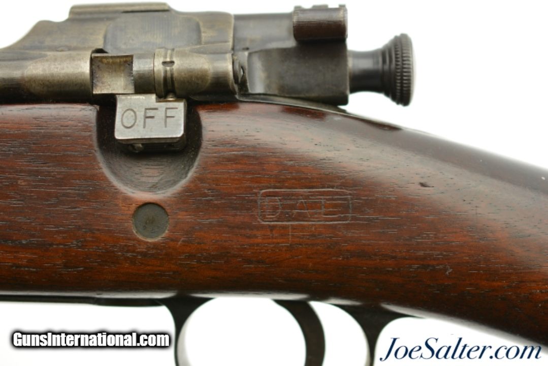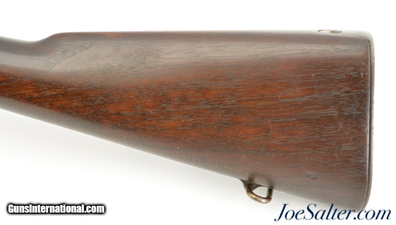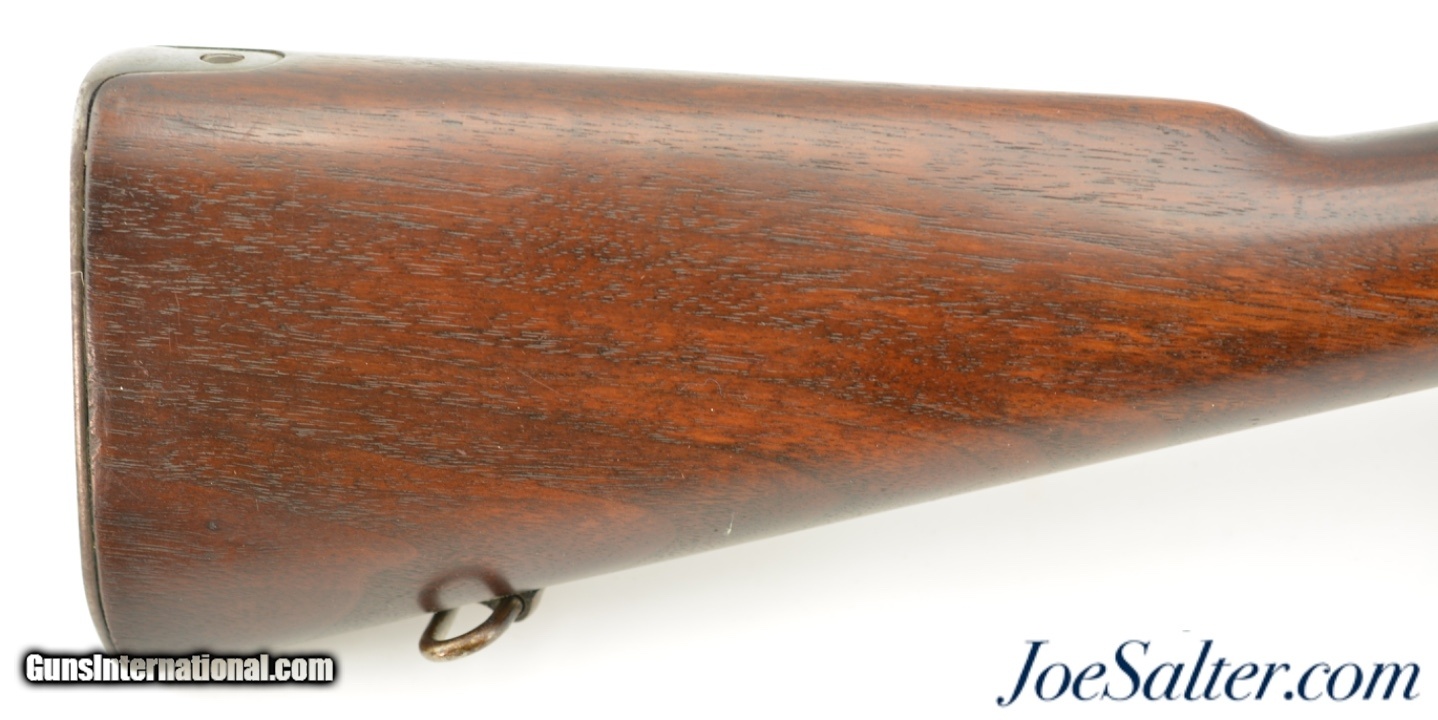 Description: Serial #796429, .30-06, 24" barrel with an excellent, bright bore. This rifle has a 1-18 dated "SA" stamped barrel with "A" surcharge mark beneath the date. The metal retains 70-75% of the original blue finish with gray fading along the high and exposed edges, as well as mottled plum-brown freckling on the receiver and rear sight base (an early type 1905 rear sight with platinum wire sight lines is installed). The bolt has additional fading on the bearing surfaces, and some further fading is present on the floorplate. The walnut stock and handguard are in fine shape with minor handling marks and small surface blemishes scattered throughout the otherwise excellent reapplied oil finish. The "D.A.L." (Daniel A. Leary) cartouche is still crisp and clear on the left side, as is the "P (in circle)" firing proof on the underside. This is a very nice WW1 era Model 1903, and would make a fine addition to any collection. FFL or C&R SOLD Curio/Relic: Yes |
