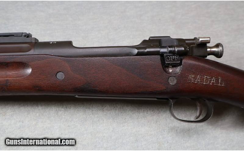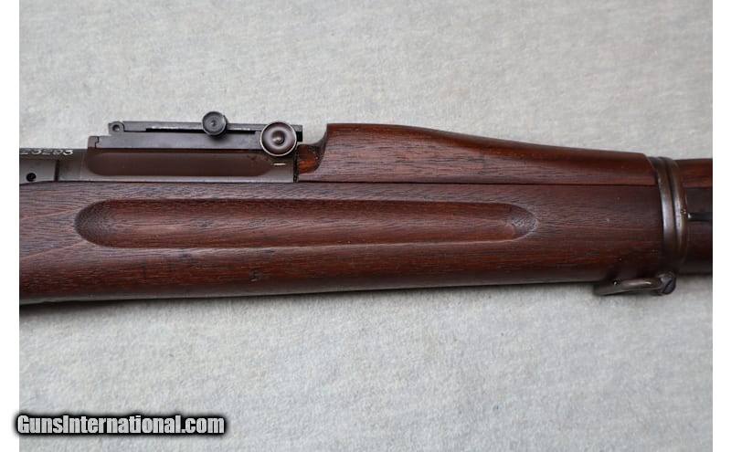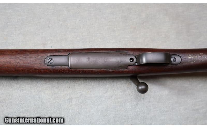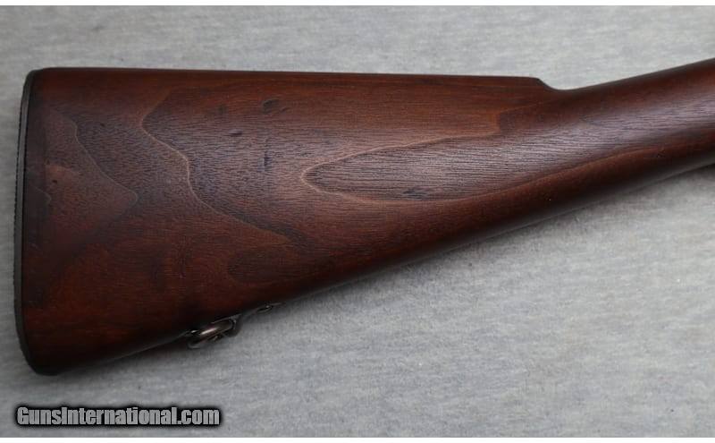 Description: U.S. SPRINGFIELD NATIONAL MATCH MODEL 1903 BOLT ACTION MILITARY RIFLE. All markings on the rifle, including stock, have been enhanced w/ white. Marked behind front sight "SA / flaming bomb / 2-21-A". Muzzle is star gauged in the 6 o'clock position. The receiver manufactured in 1921 has the polished rails & punch mark of a National Match rifle. The rib on the follower has been polished, however the feed ramp is unpolished. The ladder rear sight w/ volley notch has a polished face & is equipped w/ dished windage & elevation knobs. The front sight movable base does not match the rifle finish & has been equipped w/ a Marbles No.11 bead type sporting sight. The bolt has the single gas hole on the bottom. Bolt handle is marked on top w/ "7" & what appears to be a punch mark. Bolt cams have not been polished. Safety has standard function & is polished bright. Cocking piece has been polished. Trigger guard & floorplate are not marked. S type straight grip walnut stock w/ grasping grooves. Two recoil bolts. All milled furniture including coarse checkered trap buttplate. Buttstock is marked on left side over trigger guard w/ unboxed "S.A. D.A.L.". Marked in cutoff recess w/ "4 / S". Forend tip marked w/ "S". Marked under pistol grip w/ assembly number, two encircled "P" proofs & partial illegible boxed marking. CONDITION: stock set retains a large degree of its lightly worn original finish w/ scattered handling marks throughout. Small rectangular vice marking ahead of cutoff recess. Receiver, bbl. & bolt retain a large degree of the original Parkerizing, except where noted as being polished. Furniture has a mix of worn blue & faded Parkerizing. Very good shiny bore w/ strong lands. .30-06 Springfield Curio/Relic: Yes Metal Condition: good Wood Condition: very good Bore Condition: Very good shiny bore w/ strong lands. Barrels: 24" barrel Stock Dimensions: 13 Fore End: smooth wood Butt Pad: metal Weight: 8 lbs 8 oz Sights: The ladder rear sight w/ volley notch has a polished face & is equipped w/ dished windage & elevation knobs. The front sight movable base does not match the rifle finish & has been equipped w/ a Marbles No.11 bead type sporting sight. Item Location: La Vista, NE Price: $3,199.99 Contact Seller |