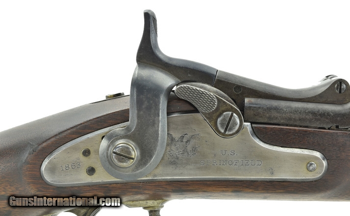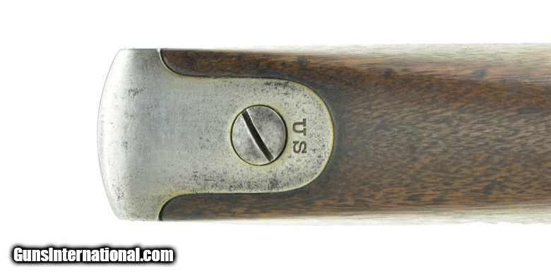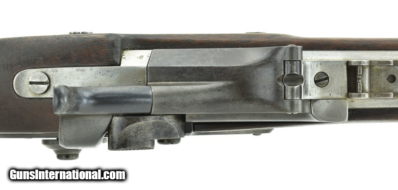 1865 First Allin Conversion 2-Band Springfield Trapdoor .58 RF caliber rifle. First Allin Conversion 1865 2-band Springfield Trapdoor rifle, that looks to have been converted to a cadet model. About 270 out of 5000 First Allin Conversation rifles were cutdown and made into cadet rifles. Barrel is armory bright, bore has areas of pitting. Lock plate is dated 1863. Breech block and hammer are still in original black. Wood is great and has two cartouche stamps one is “ESA” and the other is a faint “SWP”, this would have been added after the alteration from the 3-band to 2-band. Barrel is 36” to the breech face. This is a very nice and rare rifle that shows evidence of being altered at Springfield Armory! Hard to find.