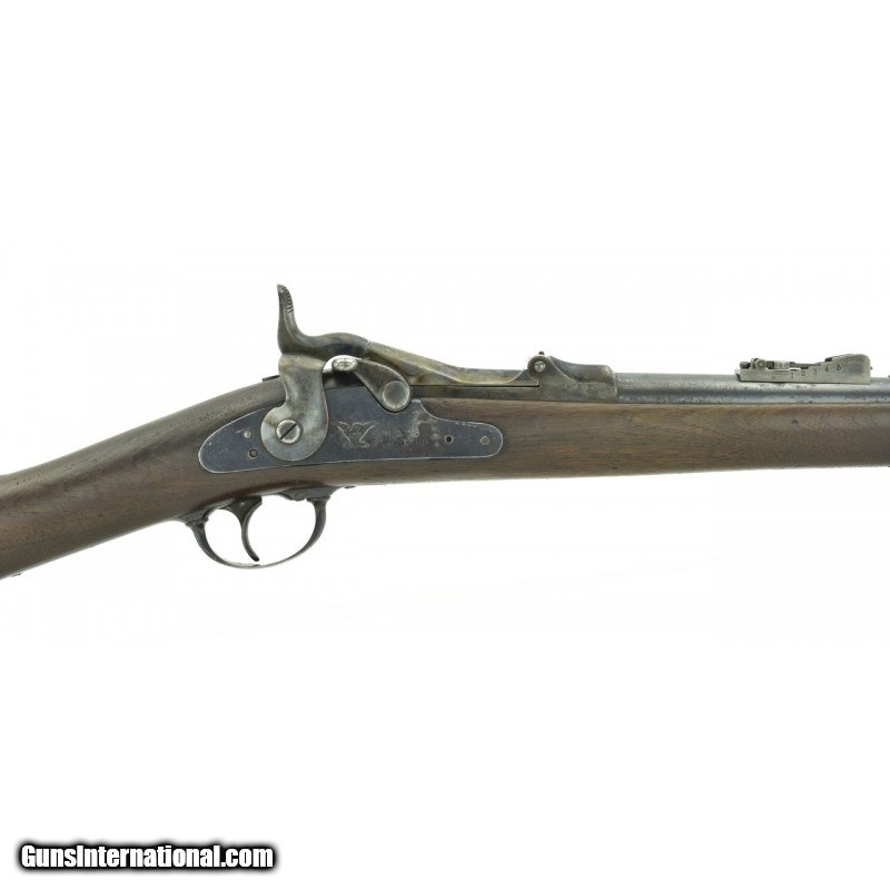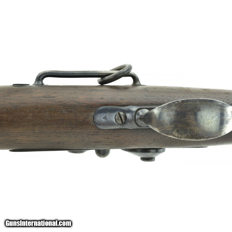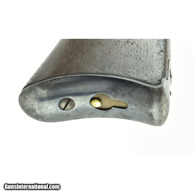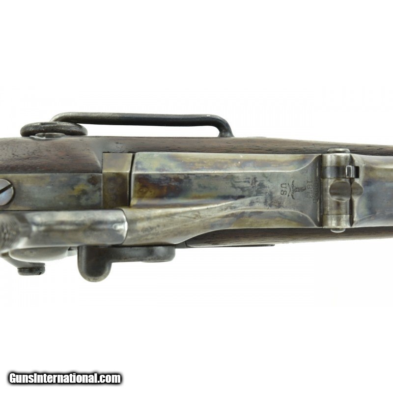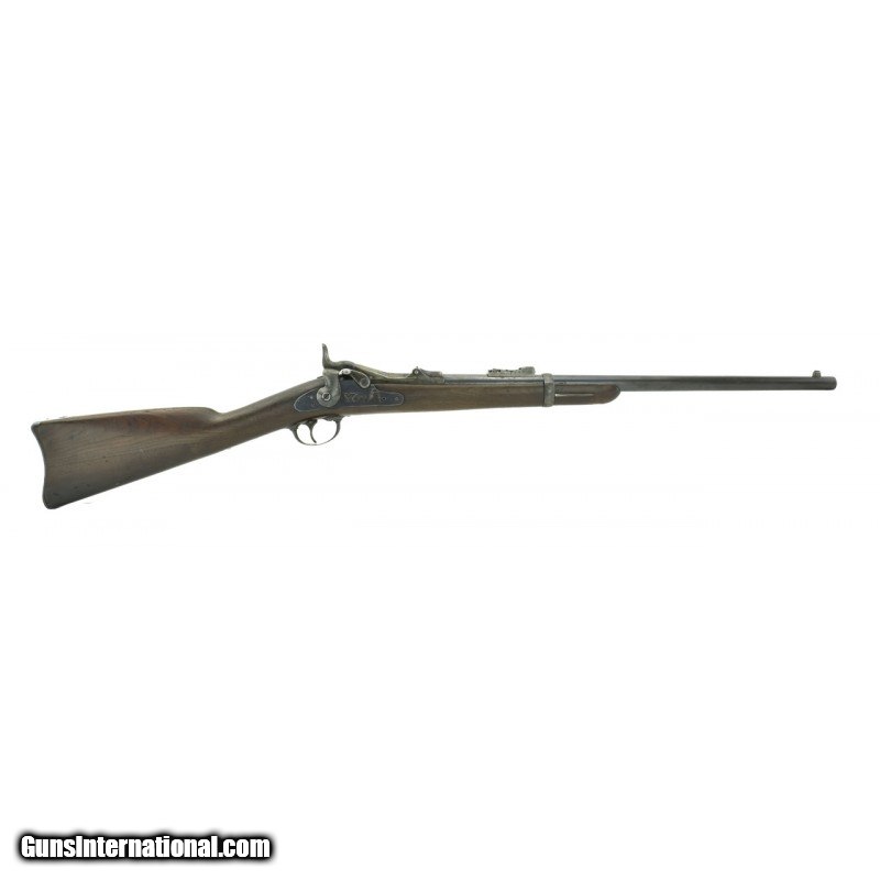 Description: "U.S. Springfield 1873 1st Model Carbine .45-70. A very nice 1st Model Trapdoor carbine with beautiful case coloring on the breech block. Bore is good, shows some minor pitting in one area. Barrel finish is a gray patina. Stock is excellent with strong cartouche. Buttplate has a custom trap and brass door built in. That feature is sometimes seen on surplus guns that went to the civilian market. Very nice carbine! SOLD Antique: Yes |