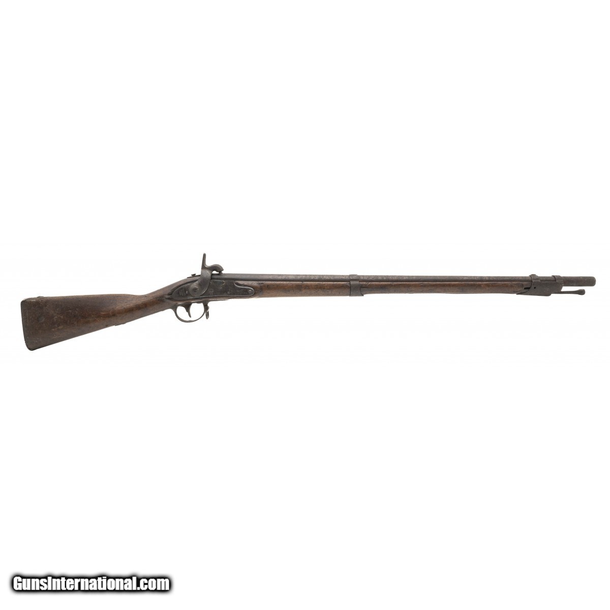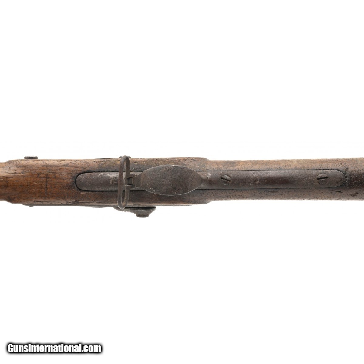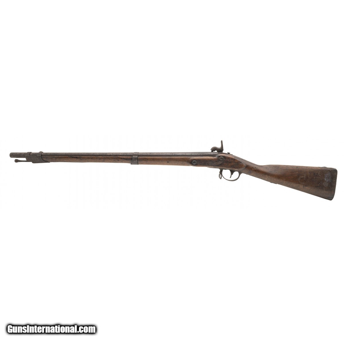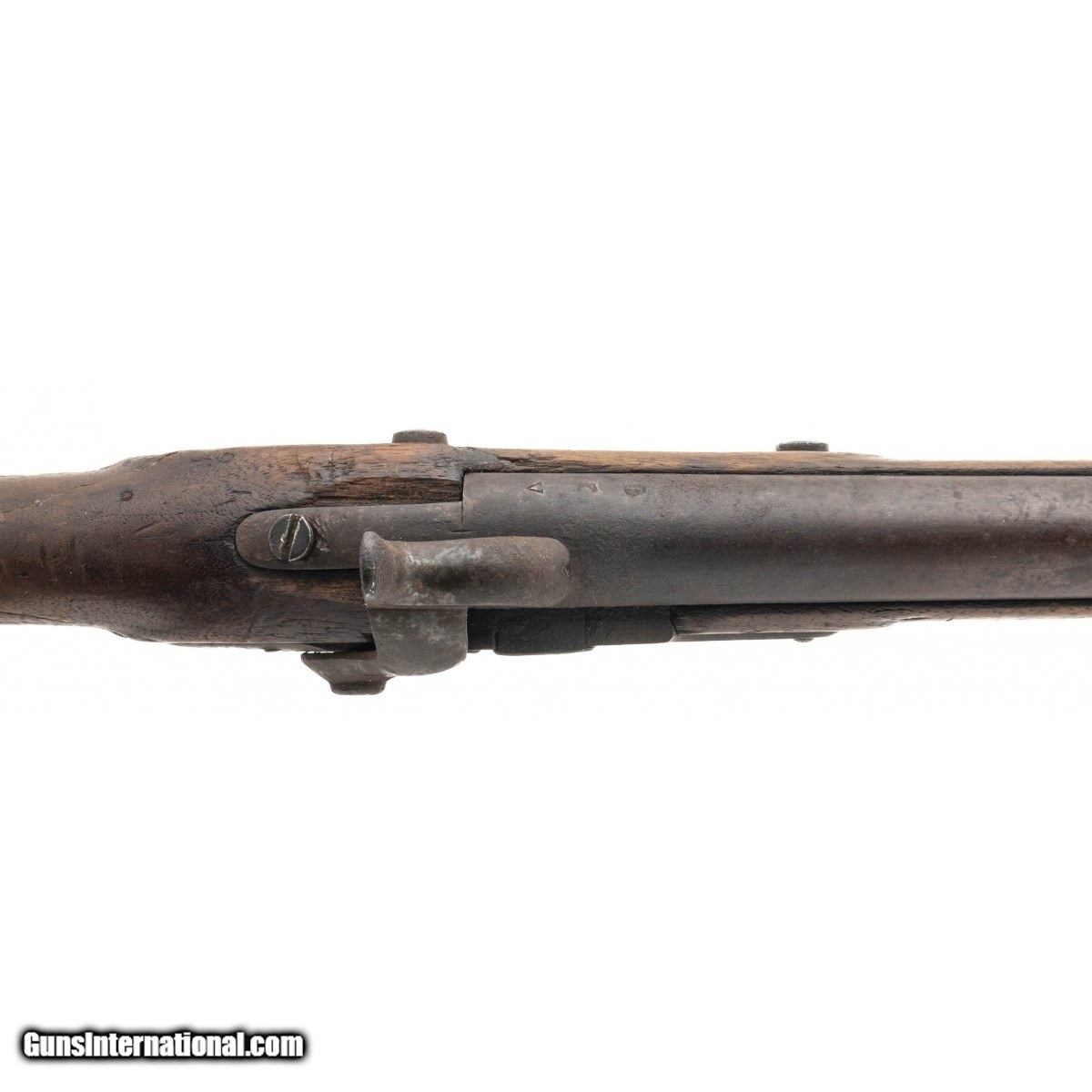 Description: " NSN, made in 1823, .69 caliber, 31"" round proofed barrel. Metal and other iron parts are a dark brown/grey patina with oxidation visible throughout. Lock plate is marked with ""EAGLE/US"",rear is marked ""SPRING/FIELD/1823"". Stock shows a bit of handling and usage wear with faint cartouches visible. Middle barrel band spring which has now become front barrel band spring is missing. Wrist has a repaired crack that wraps around from the side plate to the rear of the lock plate.Butt stock has various initials carved into the wood. Action functions correctly. SOLD Antique: Yes |