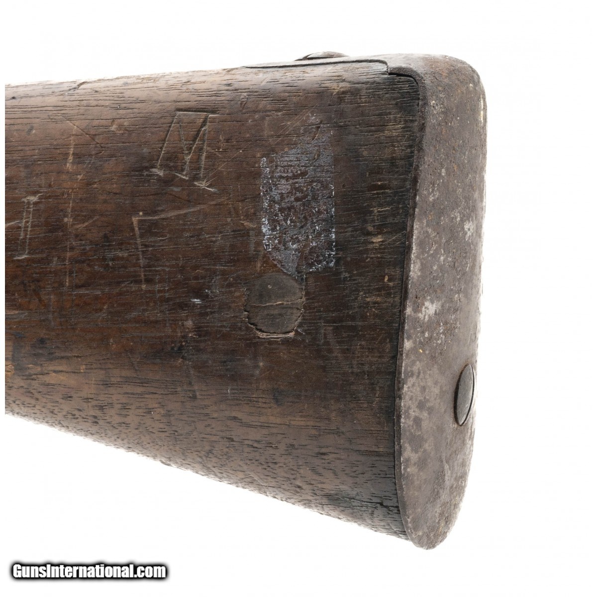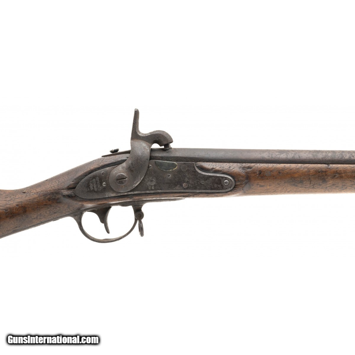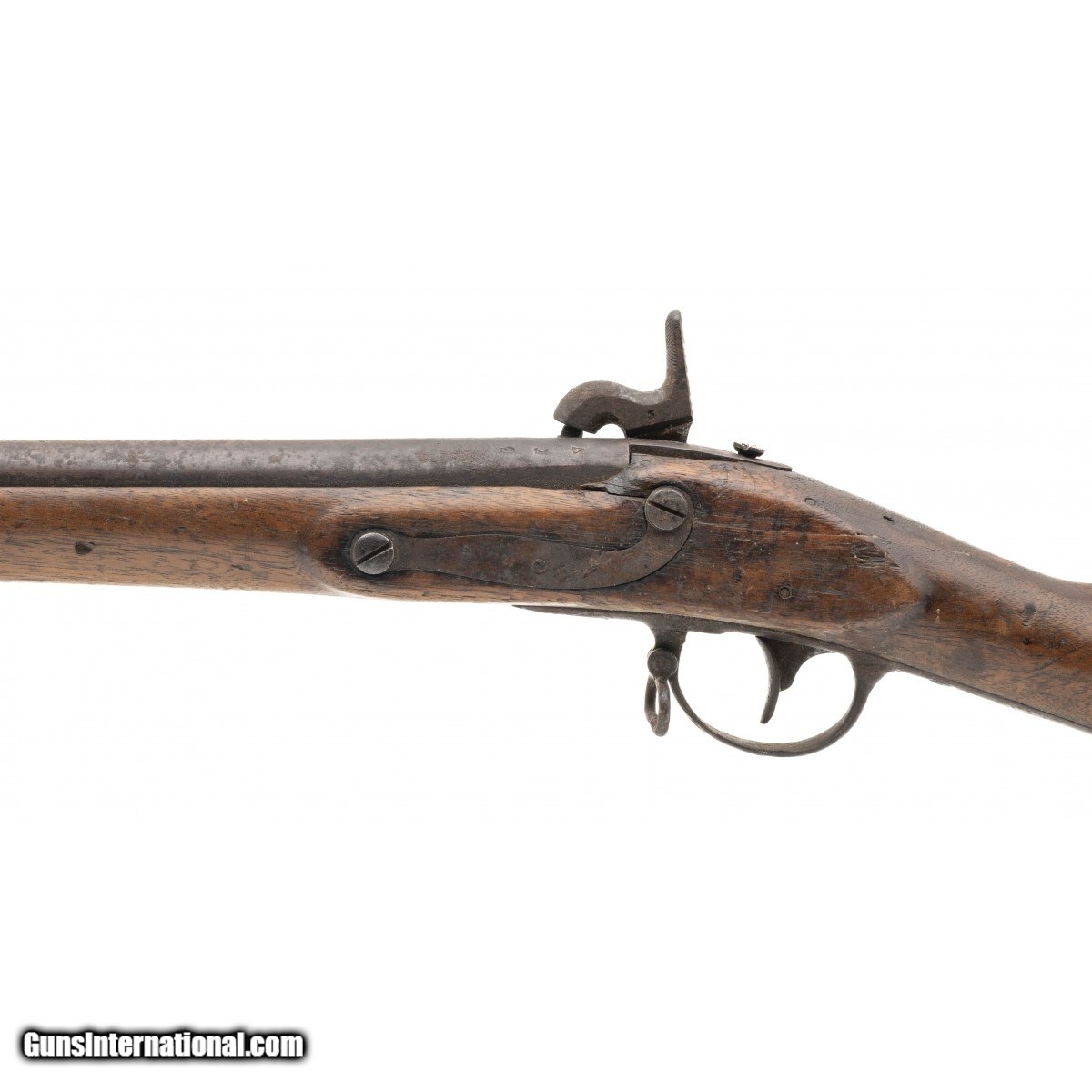 NSN, made in 1823, .69 caliber, 31"" round proofed barrel. Metal and other iron parts are a dark brown/grey patina with oxidation visible throughout. Lock plate is marked with ""EAGLE/US"",rear is marked ""SPRING/FIELD/1823"". Stock shows a bit of handling and usage wear with faint cartouches visible. Middle barrel band spring which has now become front barrel band spring is missing. Wrist has a repaired crack that wraps around from the side plate to the rear of the lock plate.Butt stock has various initials carved into the wood. Action functions correctly.