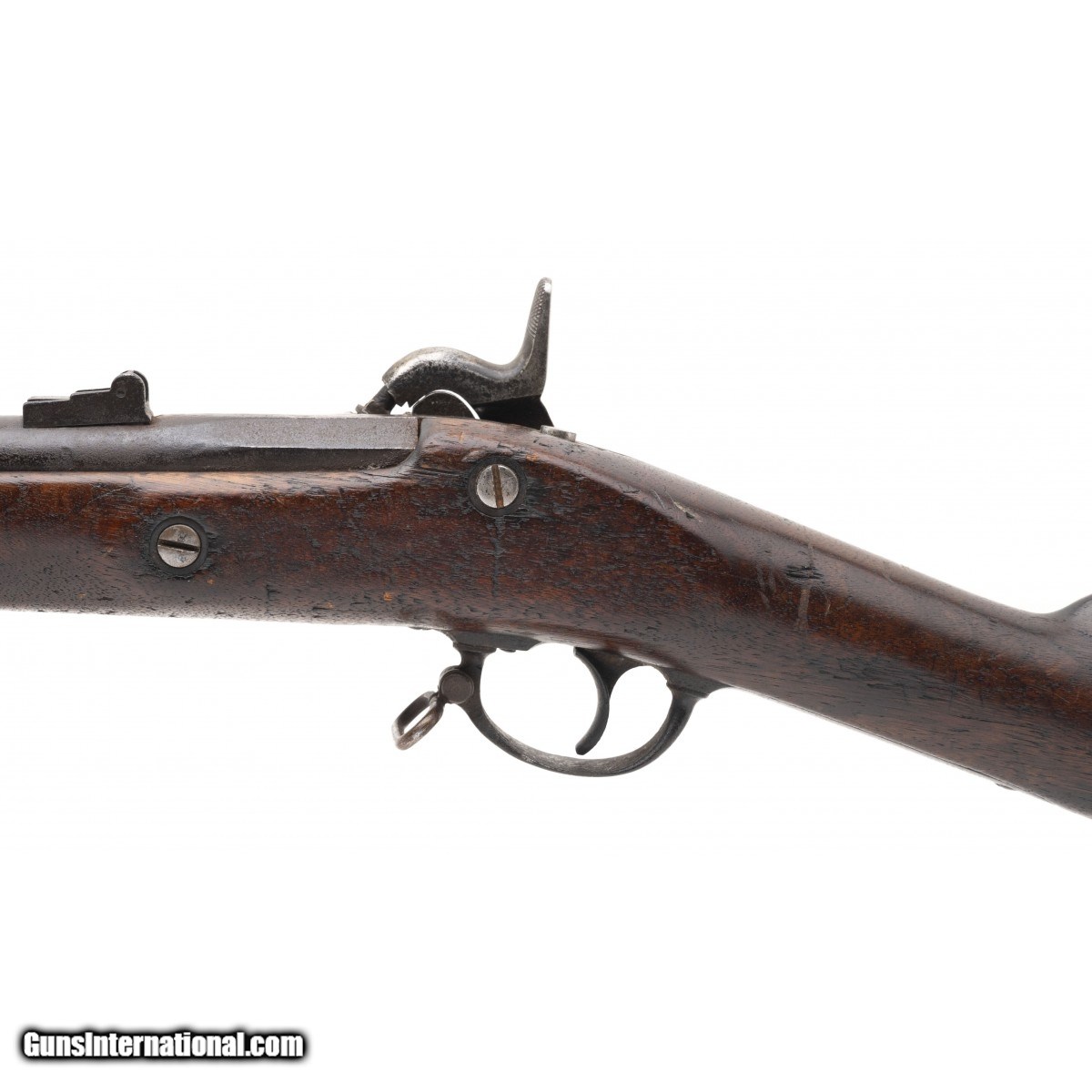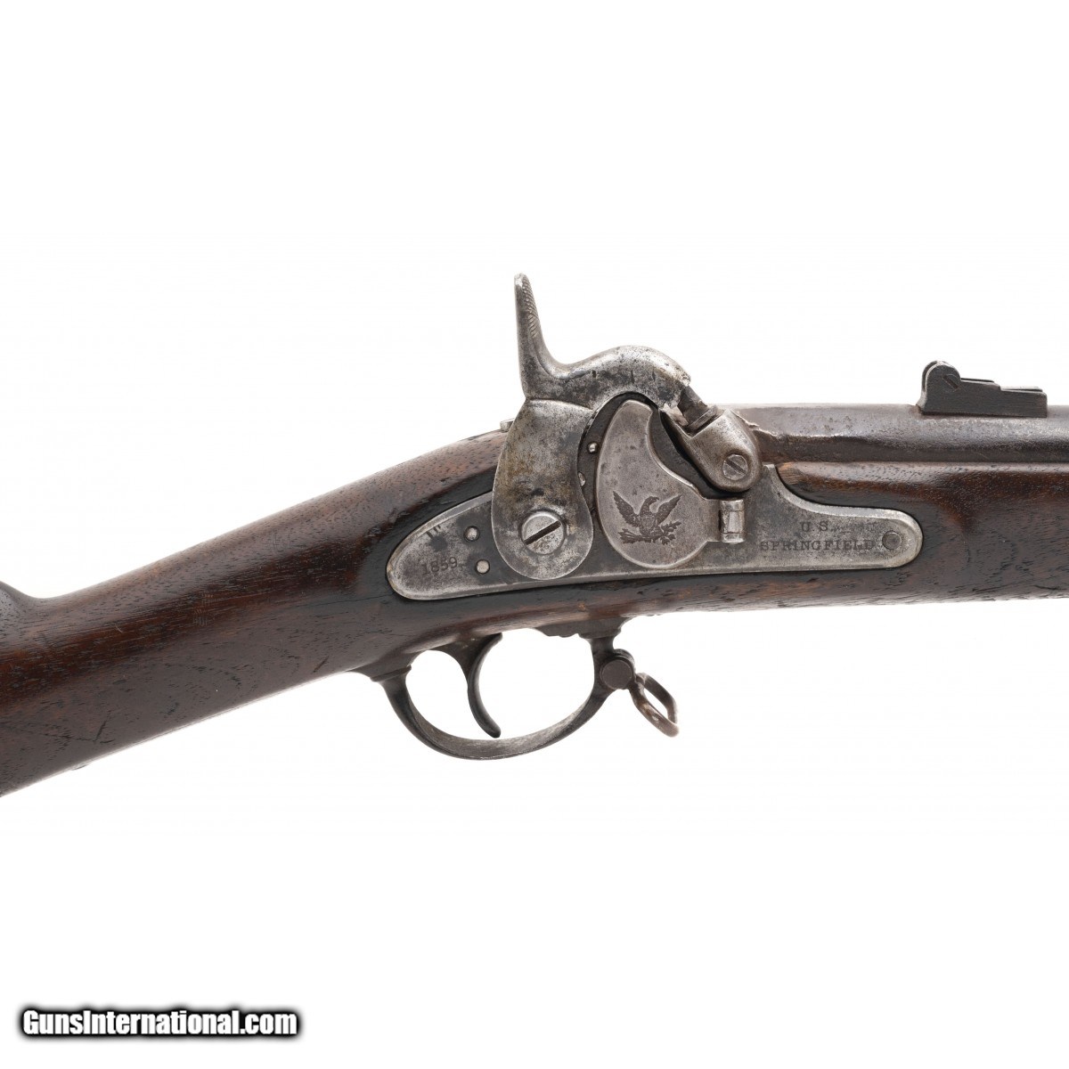 NSN, circa 1859, .58 caliber, 40"" round barrel. Barrel and other iron parts are a dark grey patina with scattered pin-prick oxidation visible. Lock plate is marked ""US/SPRINGFIELD, ""Eagle Motif"" on tape primer lid compartment. Rear of lock plate has ""1859"". Walnut stock has expected gouges, nicks and scratches. Wood loss is visible between hammer and barrel tang, this indicates a lot of firing. The bore shows faint rifling visible, validating this rifles use, possibly during the early battles of the Civil War!