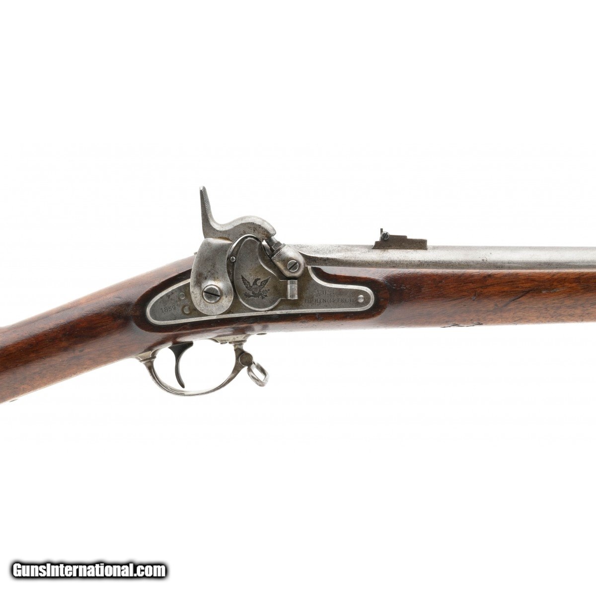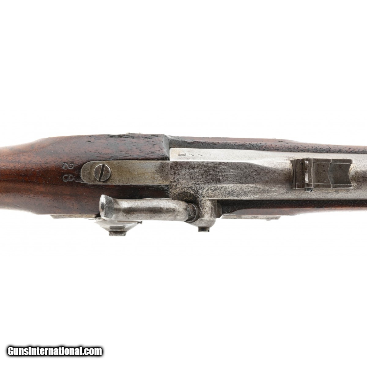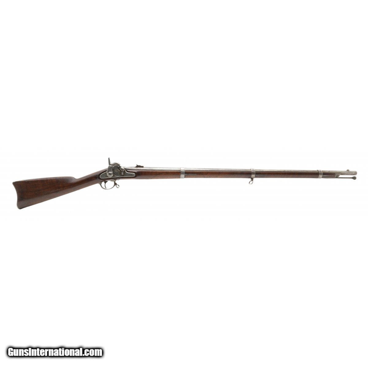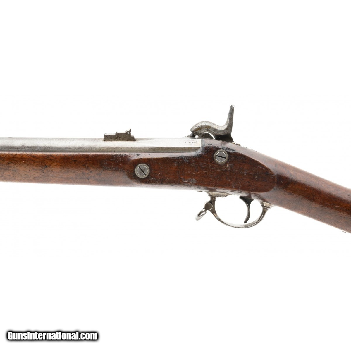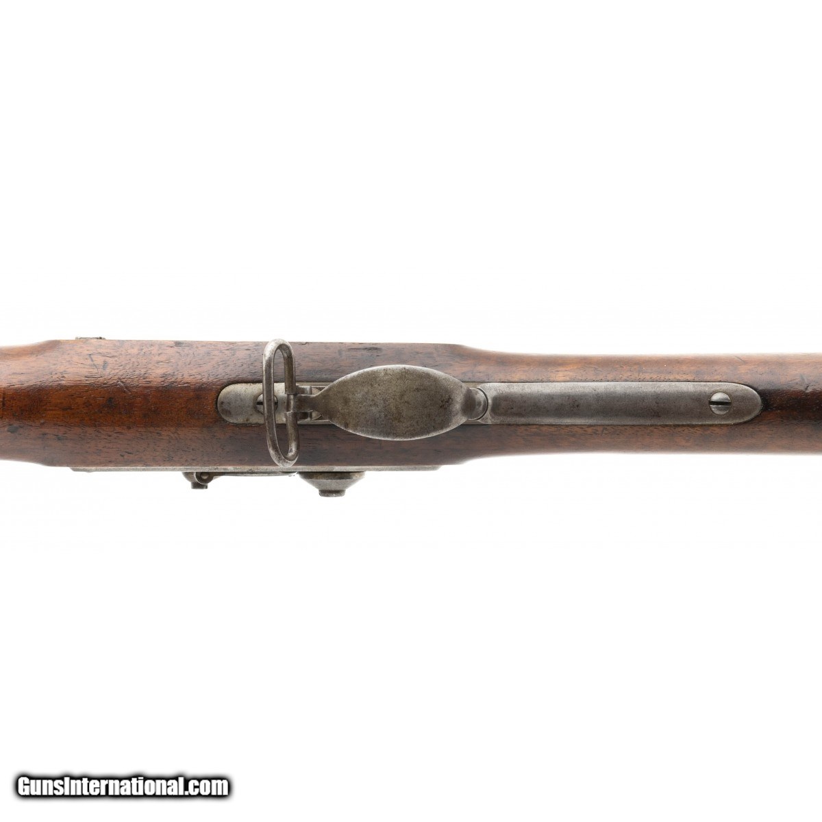 Description: " NSN, made in 1859, .58 caliber, 40"" round proofed barrel. First martial long arm to fire the .58 Minie ball with the Maynard tape primer system. Barrel and other iron furniture are a smooth light grey patina, lock plate is dated 1859. Stock is in very good plus condition with minor nicks, Action functions correctly, Bore is bright with some frosting visible in the grooves. SOLD Antique: Yes |