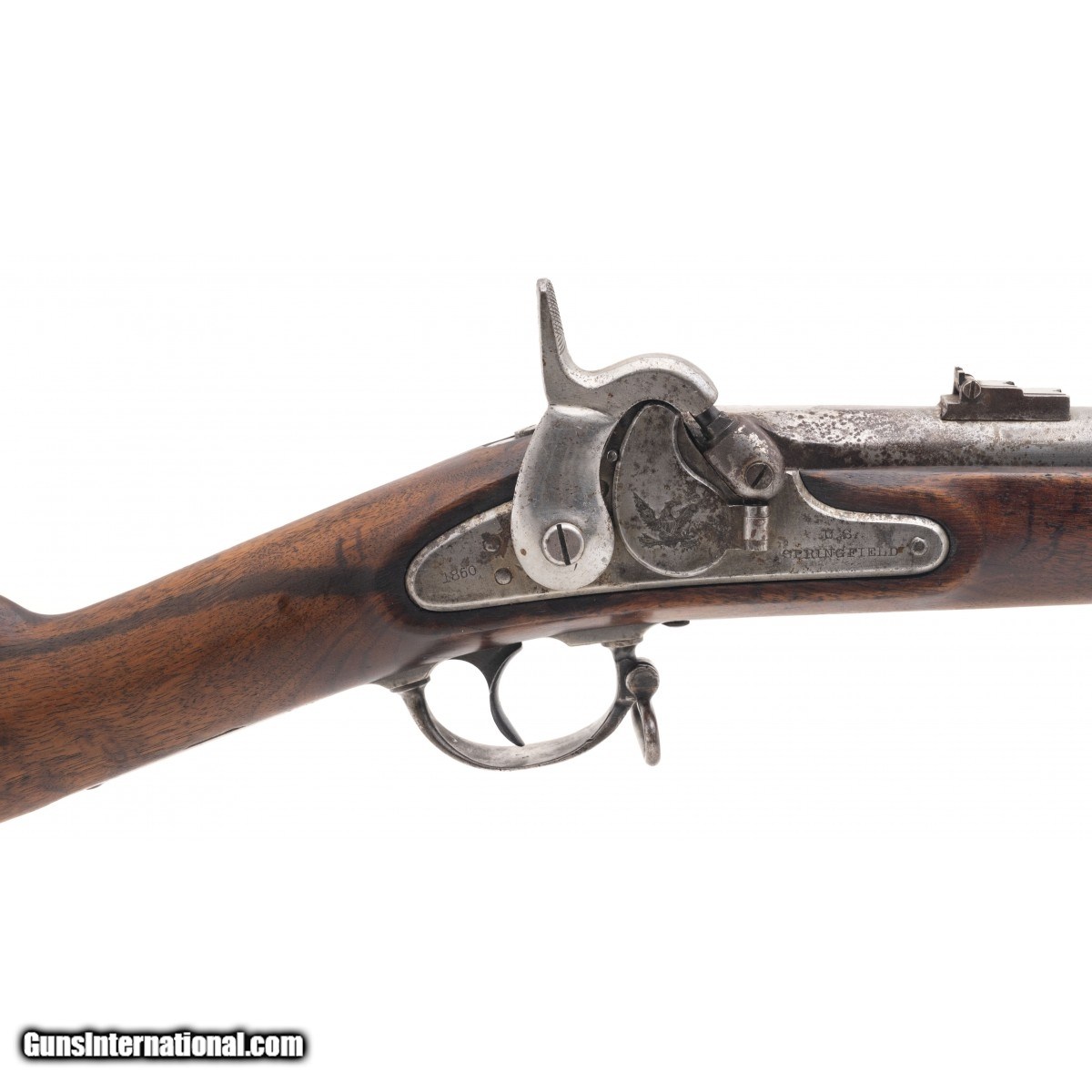 NSN, made in 1860, .58 caliber, 40"" round barrel. Barrel is a light grey patina with most of the oxidation visible at the bolster and nipple. Beautiful Eagle motif is stamped on compartment door with ""U.S./Springfield"" forward of hammer. ""1860"" stamped rear of lock plate. Stock lightly sanded with expected usage and handling wear visible. Bore is good with strong rifling remaining. Action holds at half and full cock. ConsignmentÂ