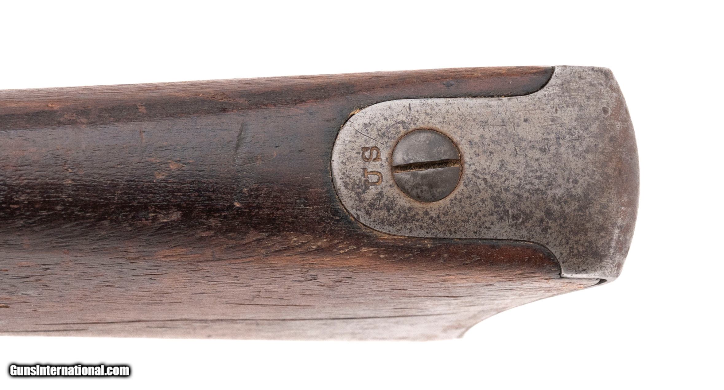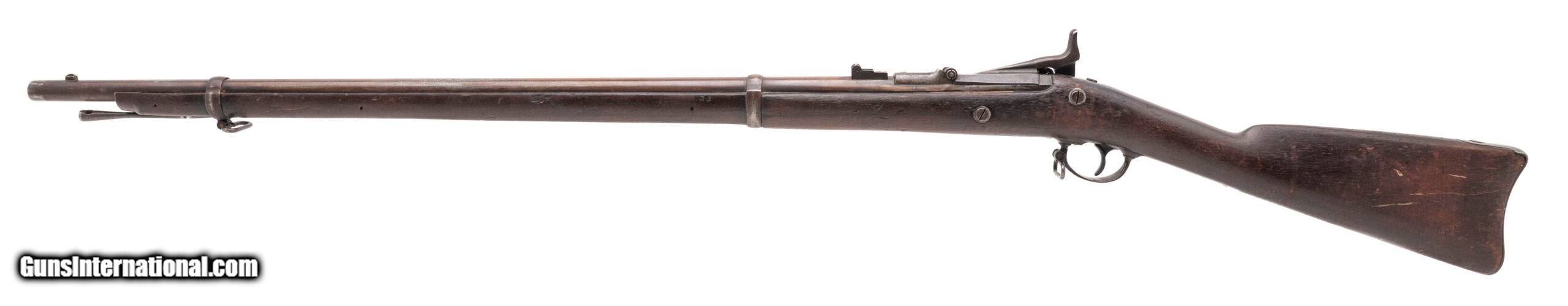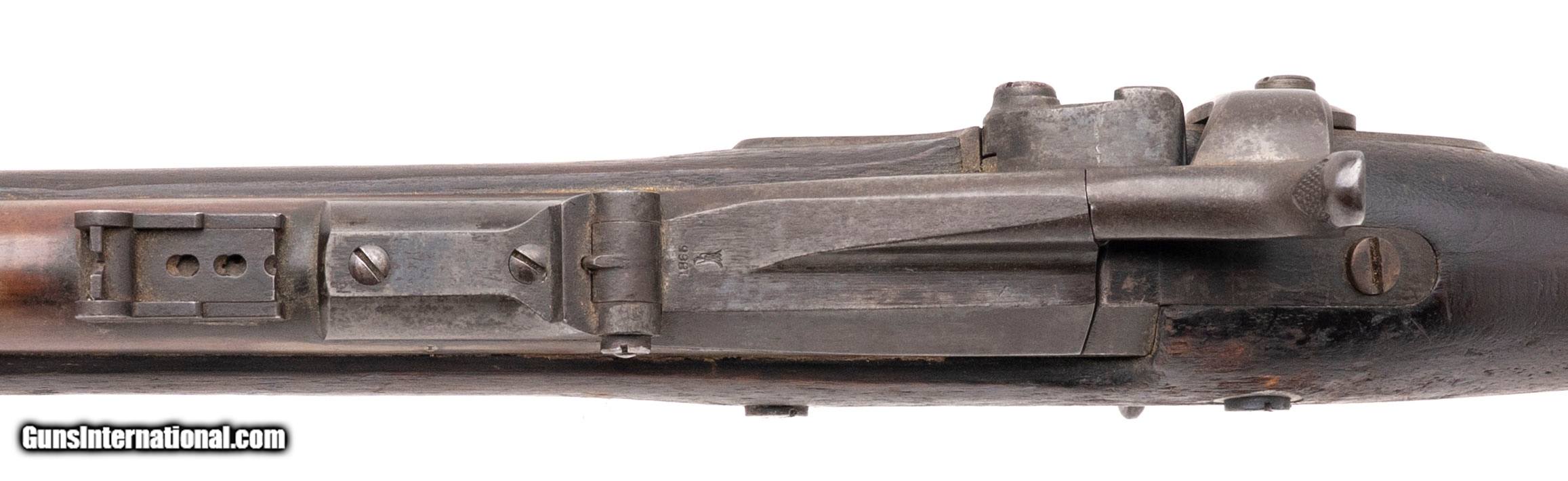 "No Serial Number, manufactured circa late 1860s, chambered in .50-70 Government, featuring a 32 ½" round barrel. This two-band rifle represents the second iteration of the Allin Conversion, utilizing modified Civil War-era muzzleloaders adapted for metallic cartridge use. Metal surfaces exhibit an even brown/grey patina, with light surface oxidation noted, consistent with age. The stock shows expected wear from handling and field use, including dings and pressure marks. Factory markings remain visible. The action is tight and functions correctly.