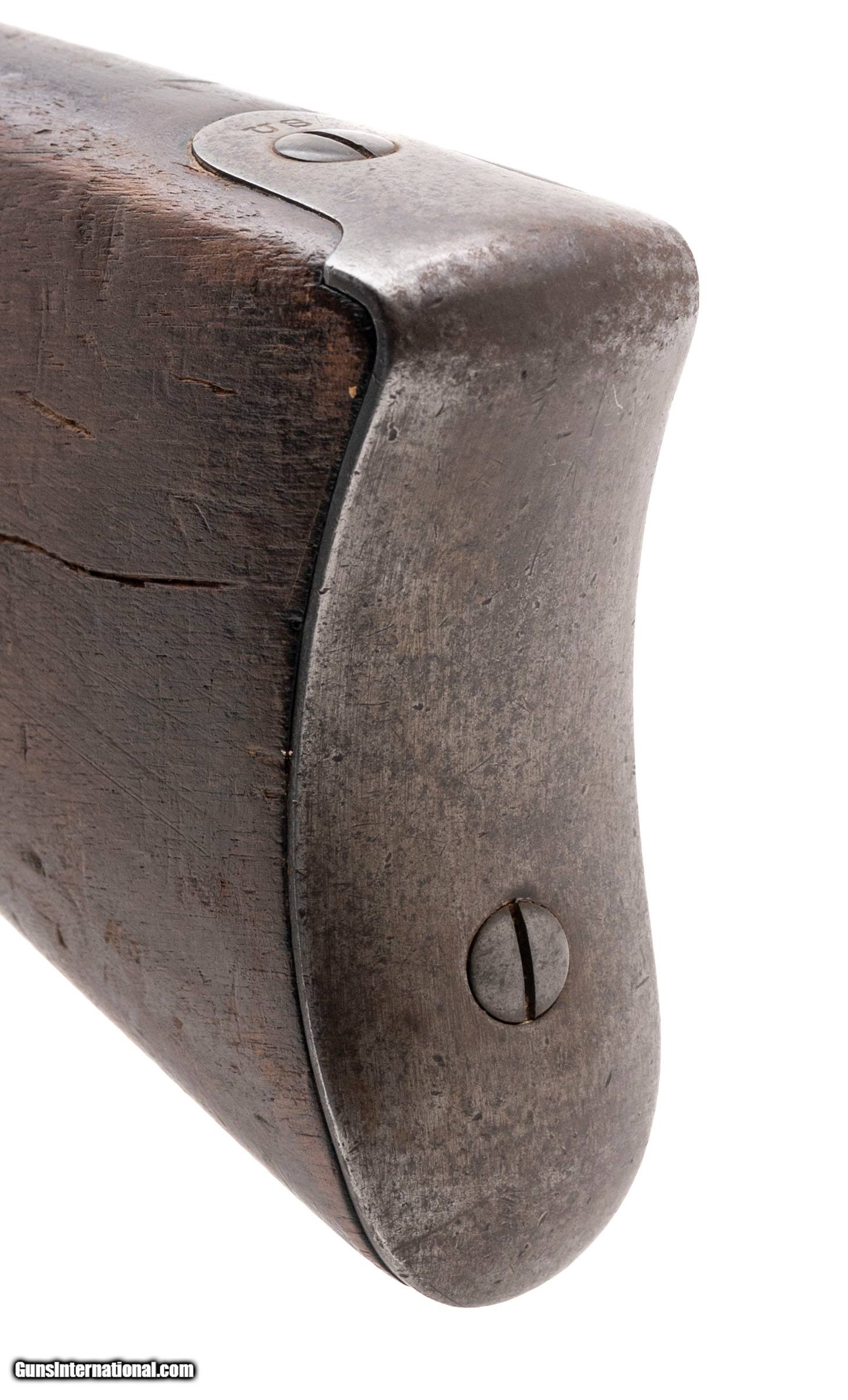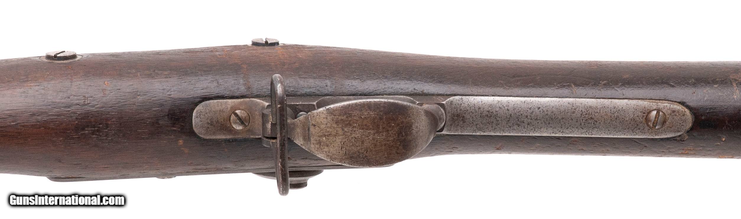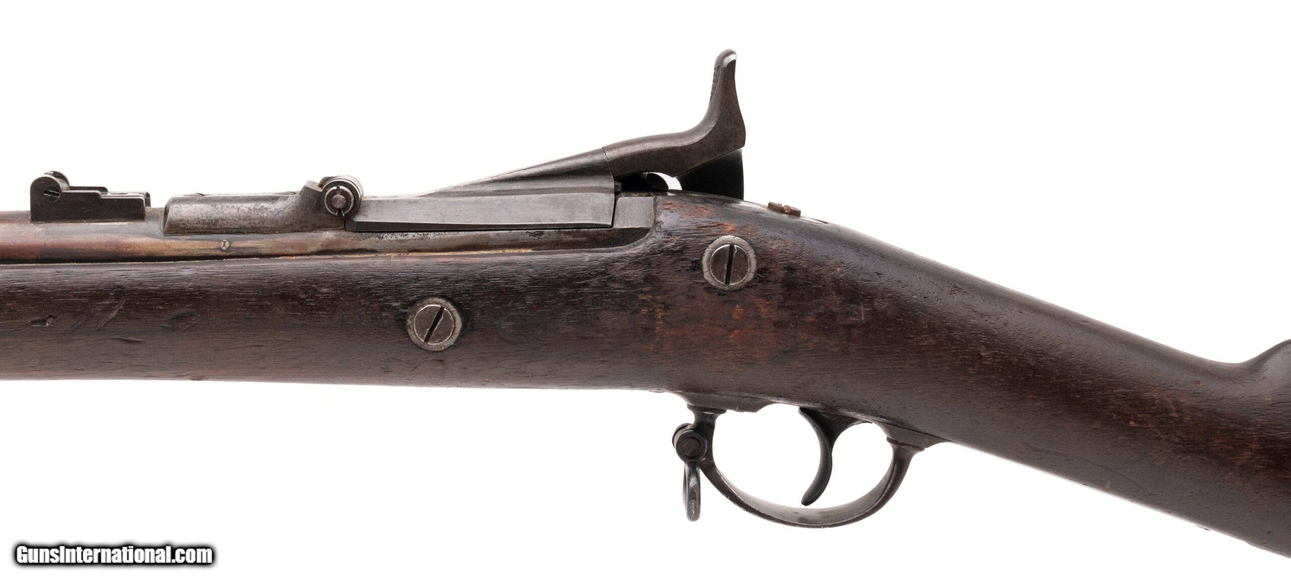 "No Serial Number, manufactured circa late 1860s, chambered in .50-70 Government, featuring a 32 ½" round barrel. This two-band rifle represents the second iteration of the Allin Conversion, utilizing modified Civil War-era muzzleloaders adapted for metallic cartridge use. Metal surfaces exhibit an even brown/grey patina, with light surface oxidation noted, consistent with age. The stock shows expected wear from handling and field use, including dings and pressure marks. Factory markings remain visible. The action is tight and functions correctly.
