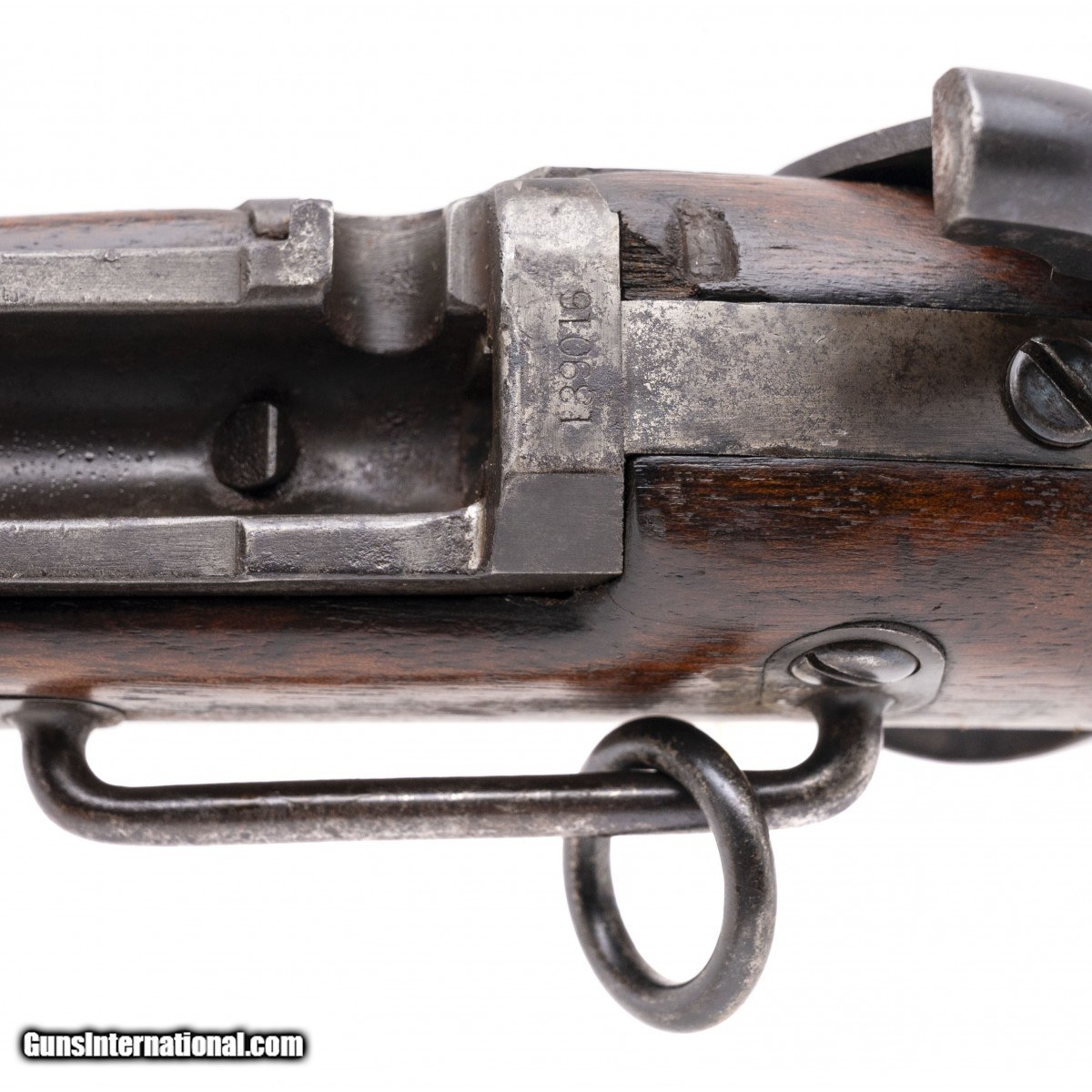 Description: " Serial No. 139016, made late 1880, .45-70, 22"" round proofed barrel. Metal is a mottled brown/grey patina with light surface oxidations visible. Bore has frosting and light pitting noted in the grooves. Rifling remains strong. Carbine has the model 1884 Buffington rear sight with serrated trigger. Stock has an old repaired crack right side of the wrist coming from the rear lock plate. Expected nicks and dings are present with the right side of the butt stock having a few gouges. Faint circle ""P"" is stamped rear of trigger guard. Action functions correctly. Consignment SOLD Antique: Yes |