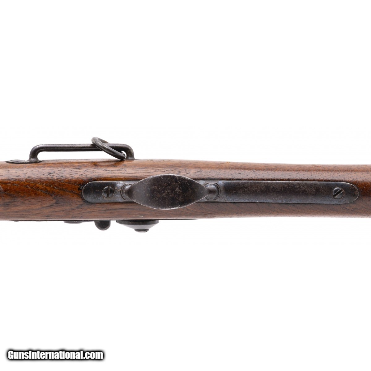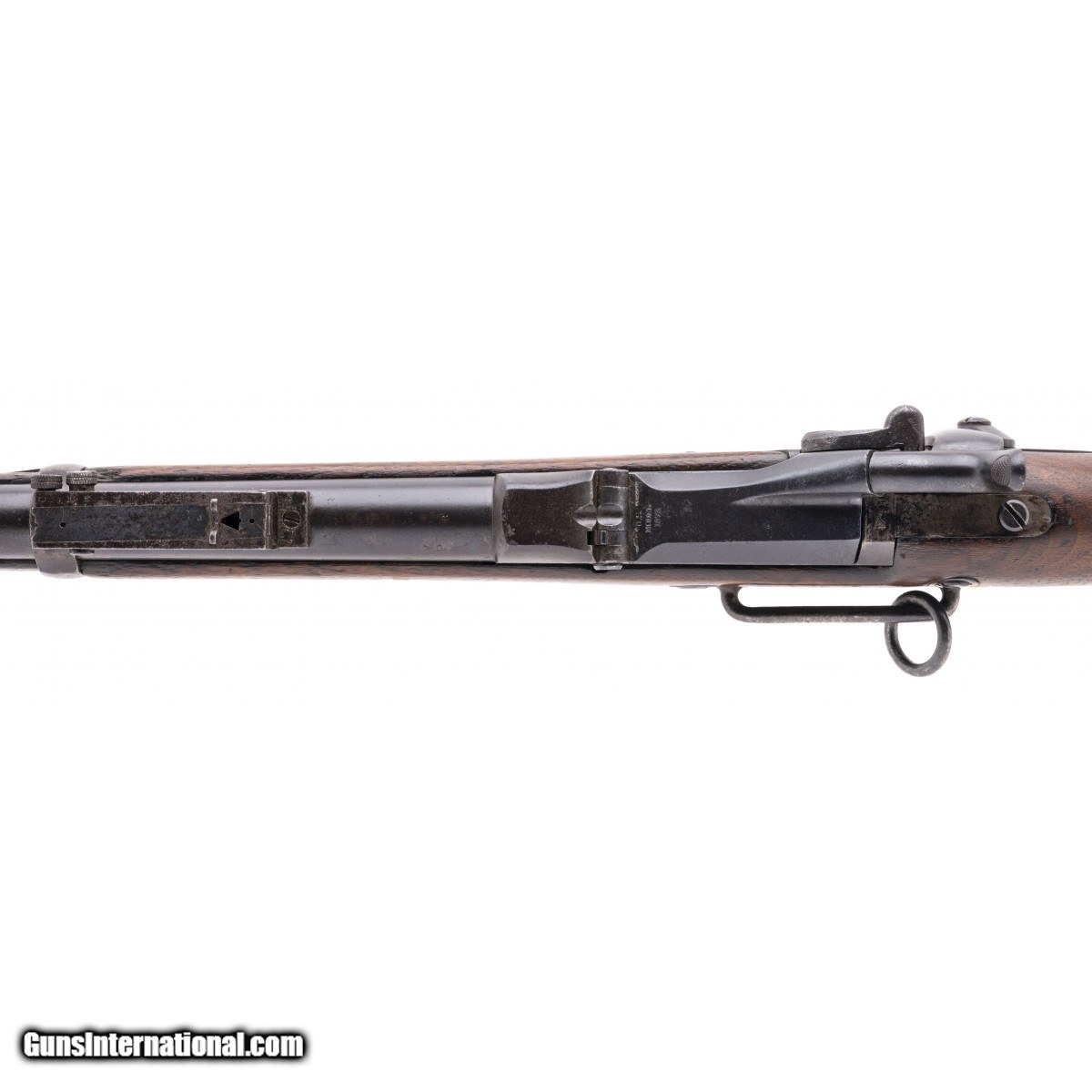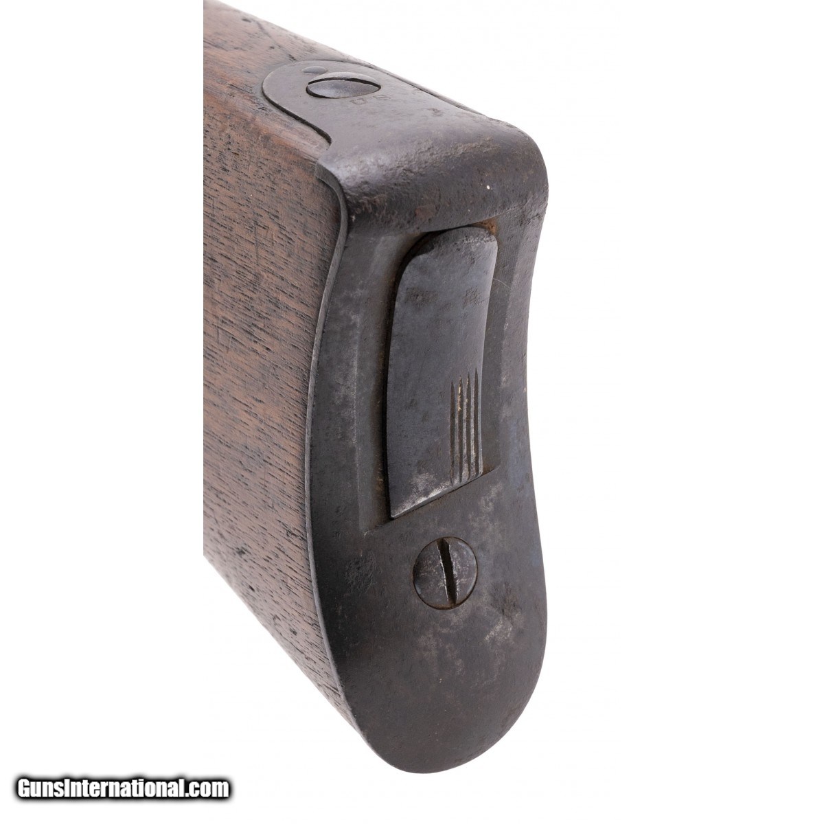 Description: " Serial No. 139016, made late 1880, .45-70, 22"" round proofed barrel. Metal is a mottled brown/grey patina with light surface oxidations visible. Bore has frosting and light pitting noted in the grooves. Rifling remains strong. Carbine has the model 1884 Buffington rear sight with serrated trigger. Stock has an old repaired crack right side of the wrist coming from the rear lock plate. Expected nicks and dings are present with the right side of the butt stock having a few gouges. Faint circle ""P"" is stamped rear of trigger guard. Action functions correctly. Consignment SOLD Antique: Yes |