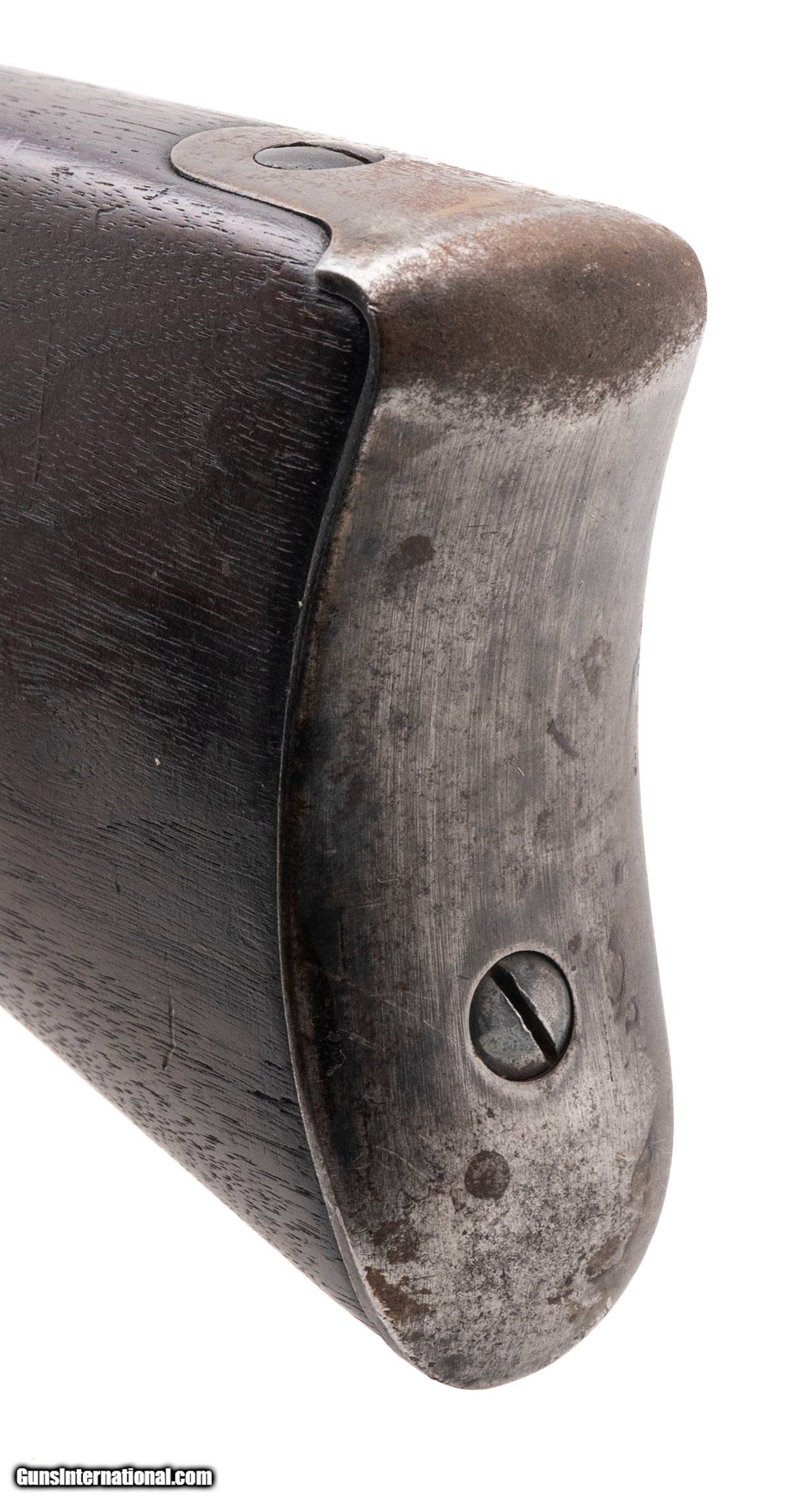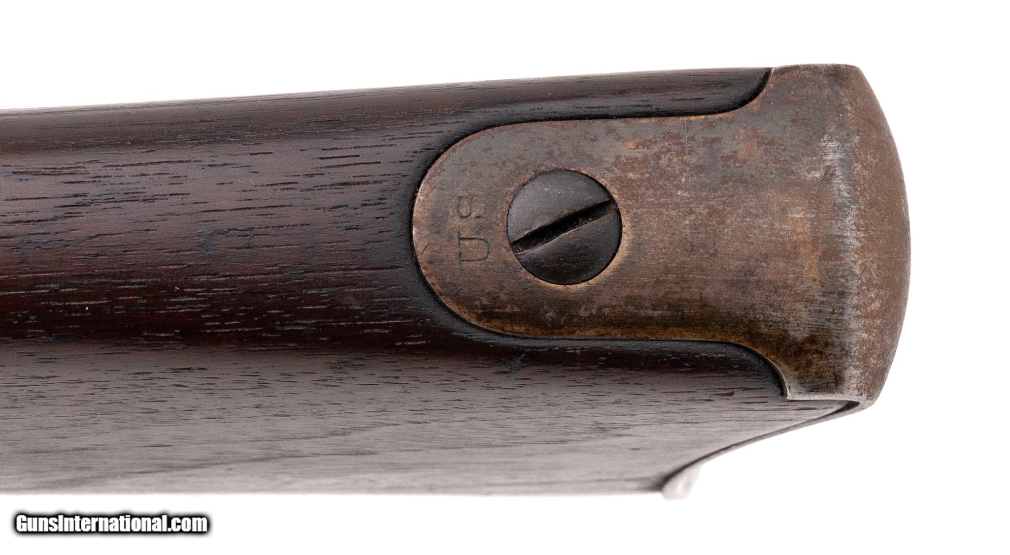 "Serial No. 286465, manufactured in 1885, chambered in .45-70 Government with a 32 ½" round barrel. Metal surfaces have turned to an attractive and even brown/grey patina with traces of original blue finish visible in protected areas. Factory markings on the barrel, breech, and lock plate remain sharp and legible. Stock is very good overall, showing light handling impressions consistent with age and use. The action is tight and functions correctly. A solid example of a late 19th-century U.S. military rifle from the Indian Wars and Spanish American War era