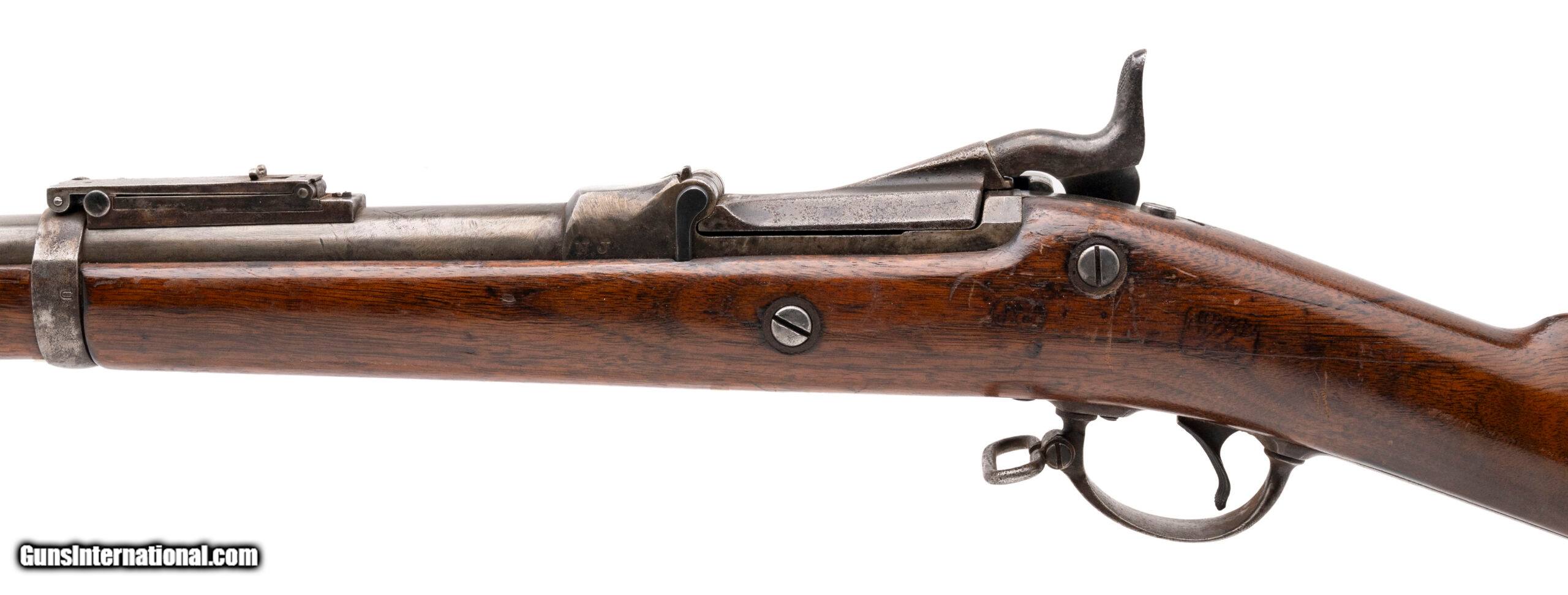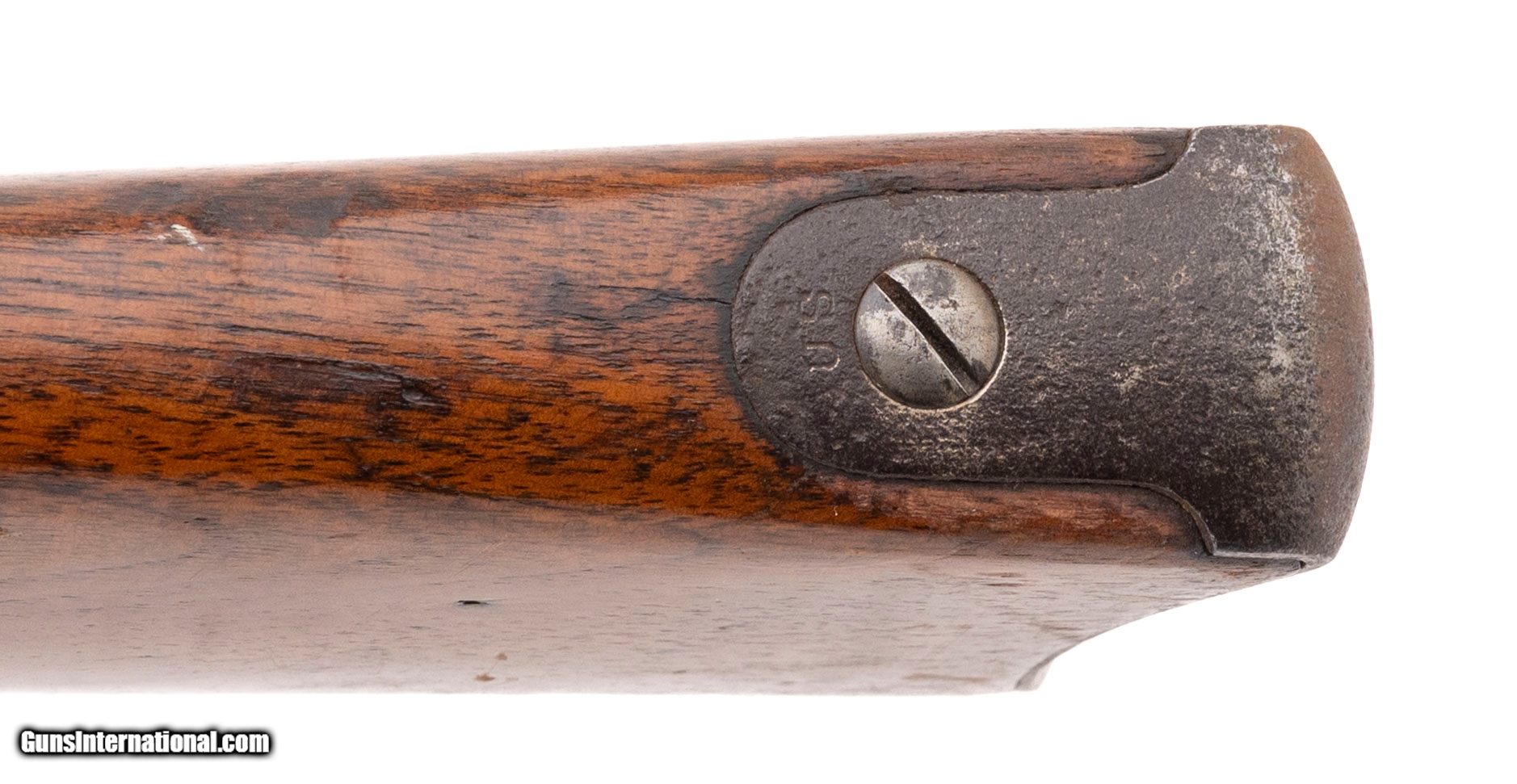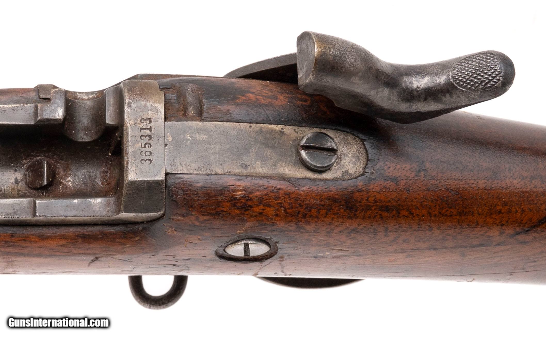 "Serial No. 365313, manufactured in the spring of 1887, chambered in .45-70 Government with a 32 ½" round barrel. Metal surfaces have aged to a smooth grey patina, with factory markings remaining visible. The stock shows light handling impressions consistent with service use, and a faint government inspector’s cartouche is still discernible. Action is tight and functions correctly. A solid example of a late 19th-century U.S. infantry rifle from the Indian Wars period.