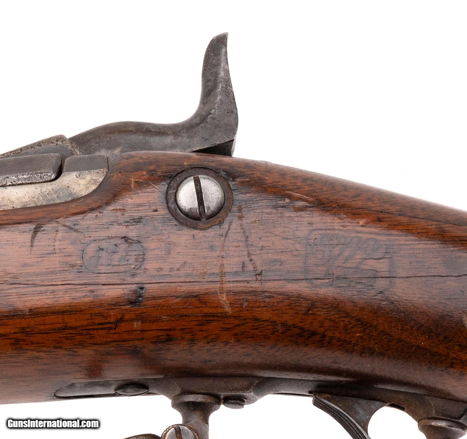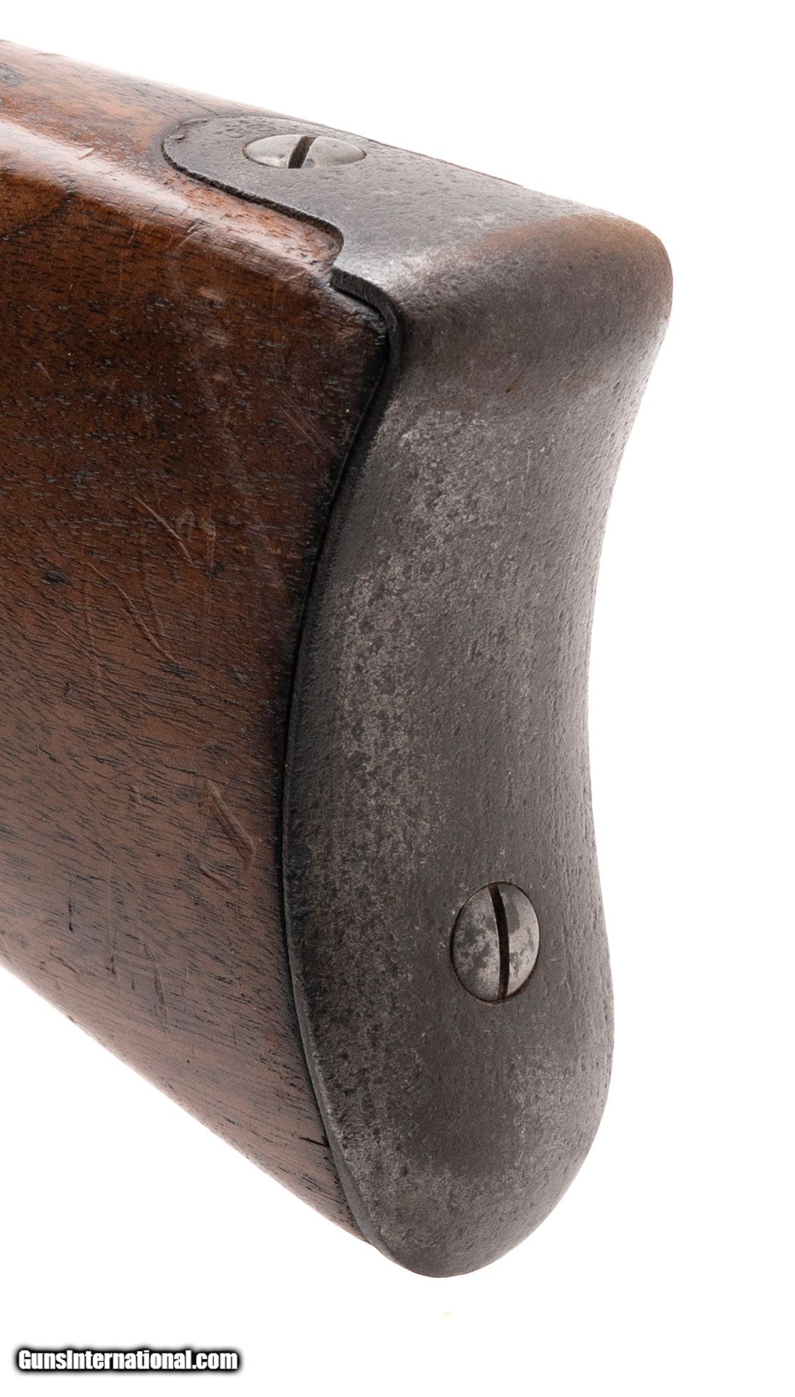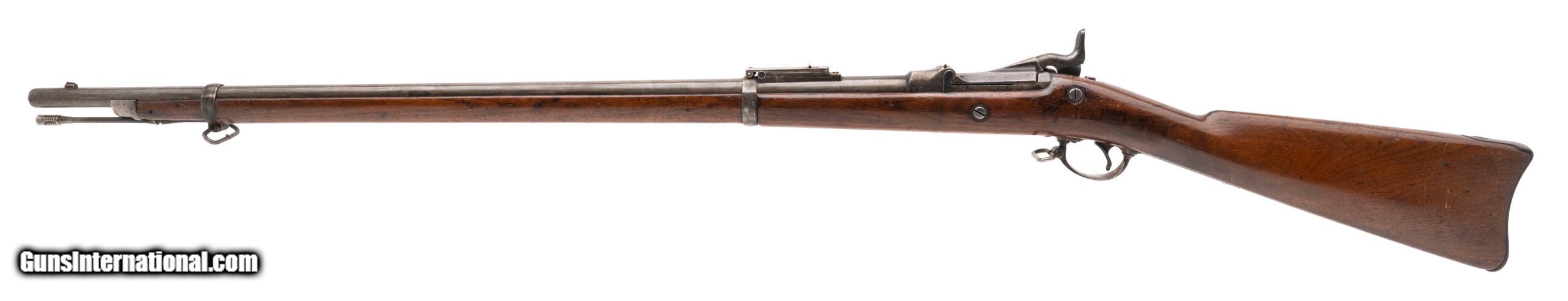 "Serial No. 365313, manufactured in the spring of 1887, chambered in .45-70 Government with a 32 ½" round barrel. Metal surfaces have aged to a smooth grey patina, with factory markings remaining visible. The stock shows light handling impressions consistent with service use, and a faint government inspector’s cartouche is still discernible. Action is tight and functions correctly. A solid example of a late 19th-century U.S. infantry rifle from the Indian Wars period.