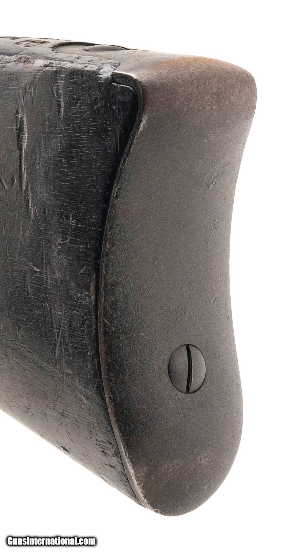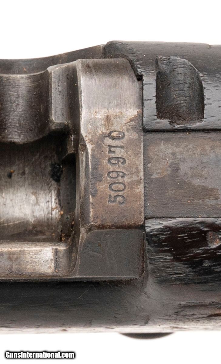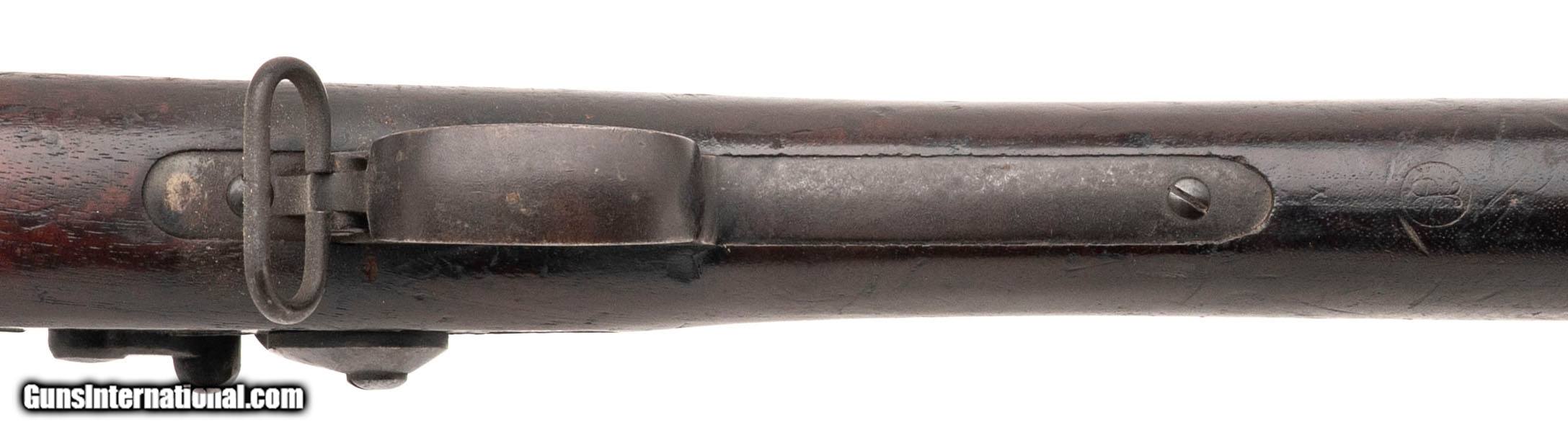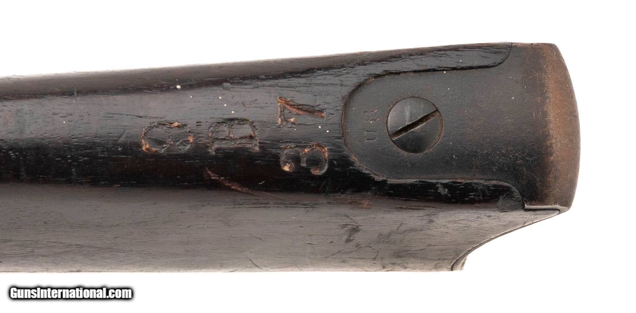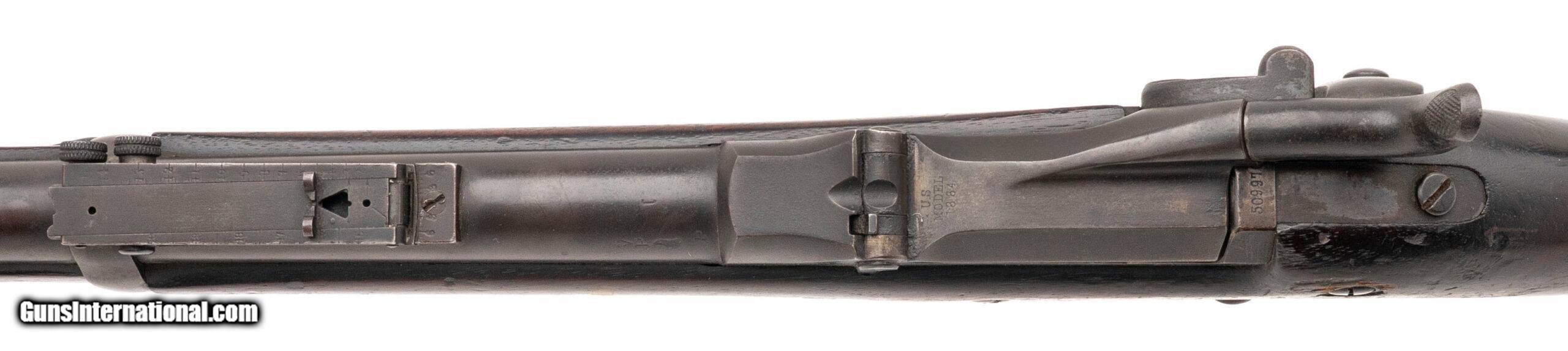 "Serial No. 509970, manufactured early 1891, chambered in .45-70 Government, featuring a 32 ½" round barrel. This rifle presents with a classic dark plum patina, complemented by scattered traces of original blue in protected areas. Factory markings on the barrel, breechblock, and lock plate remain clear and well-defined. The stock shows expected handling wear, with some wood loss along the right edge measuring approximately 3½ inches. A handsome 1891-dated cartouche is sharply visible on the right flat. The comb is marked “9/B/37," indicating a likely unit and rack number, offering insight into its service life. Mechanically, the action is tight and functions correctly, and the rifle retains its distinctive integral ramrod bayonet. As the final variant of the Springfield Trapdoor series.
