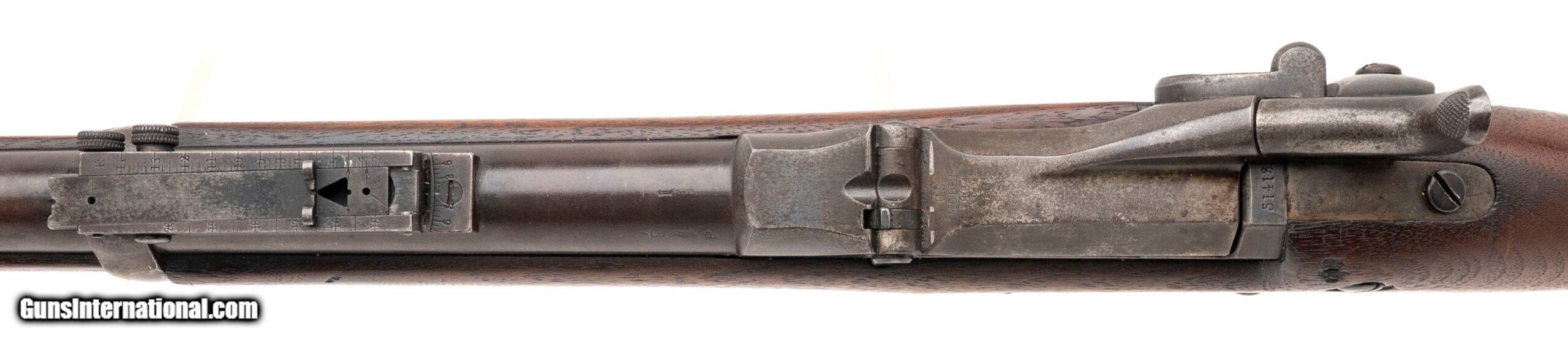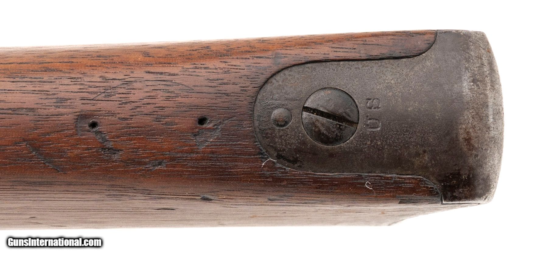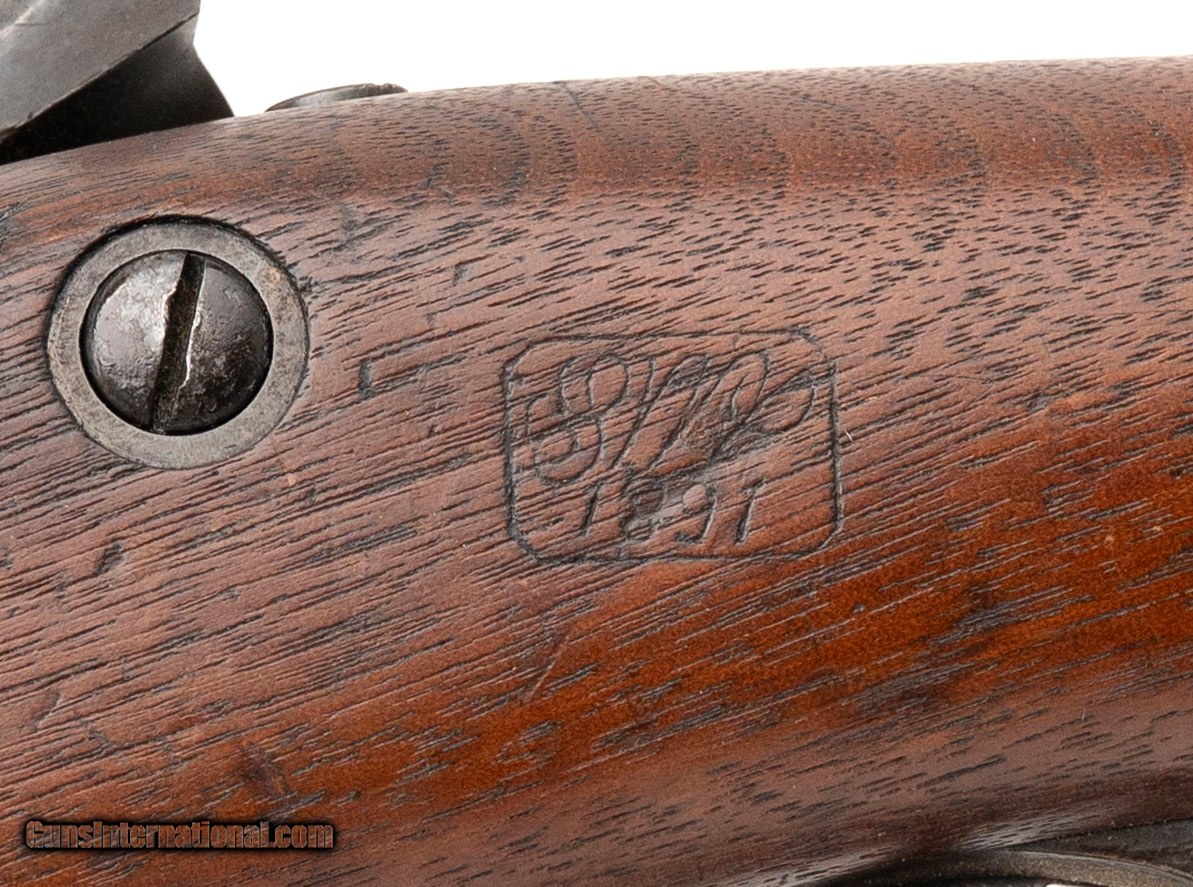 "Serial No. 514133, manufactured in 1891, chambered in .45-70 Government, with a 32 ½" round barrel. This rifle features the final iteration of the Springfield “trapdoor" series, incorporating the distinctive integral ramrod bayonet—a dual-purpose design aimed at simplifying field gear for infantry troops. The barrel has developed a smooth brown patina from age, while the breech and lock plate retain traces of original blue with vibrant case coloring visible within the breech. The rifle is equipped with a detachable pistol grip and original front sight protector. The walnut stock remains in very good condition, bearing a crisp 1891 inspection cartouche on the left wrist. Action is mechanically sound and functions correctly. This is a well-preserved example of a transitional U.S. military rifle that bridged the gap between single-shot arms and the advent of repeating service rifles.
