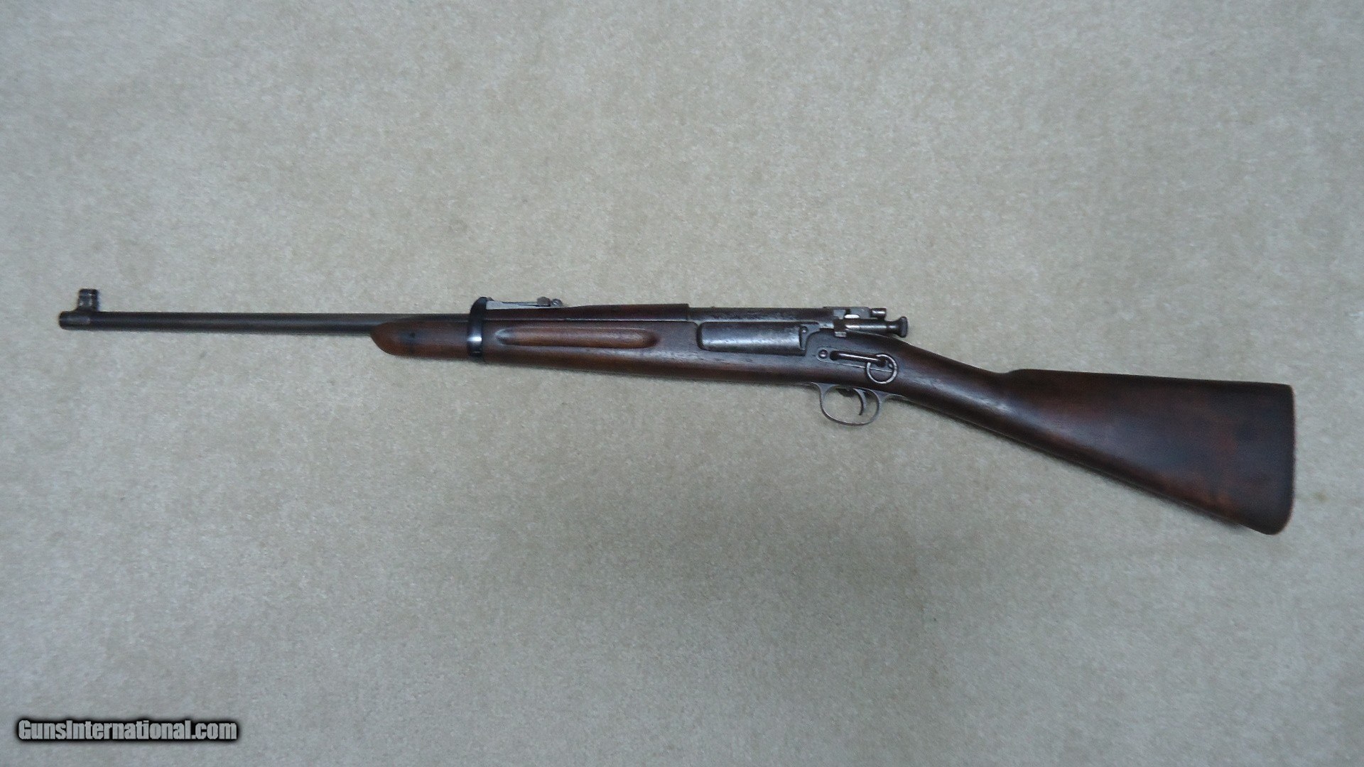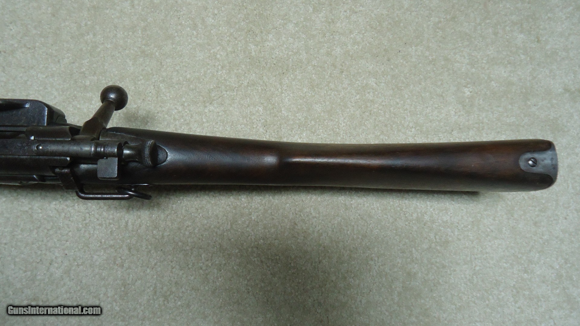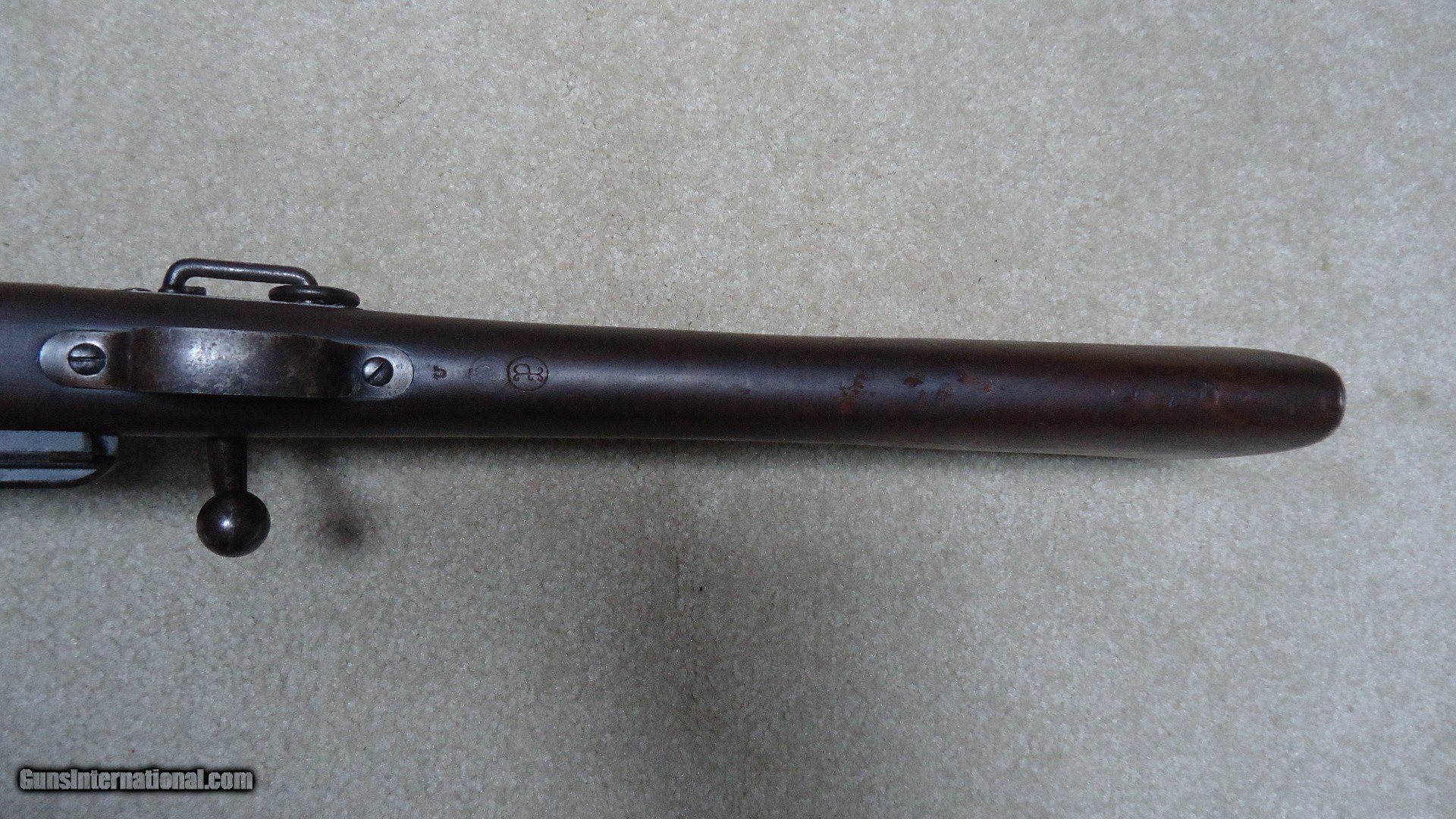 Description: 1896 KRAG SADDLE RING CARBINE, #100XXX, MADE 1898. This is a good solid example of one of the the last U.S. carbines to have a saddle ring- by 1899 they were gone. This example is correctly marked "MODEL 1896 SPRINGFIELD ARMORY" on the left side of the receiver with the serial number. It retains the saddle ring and bar along with the correct sight protector barrel band. The rear sight is the 1896 rifle sight with ladder and slide intact. The barrel shows good thinning blue and has the front sight protector hood. The stock is solid with one small crack coming back from the forend tip for an inch or so. The stock is marked with double circle P inspector cartouches with the letter "U" behind the trigger guard and no visible cartouche on the side of the stock indicating that this was probably a field replaced stock during its time of use. Fine handguard matches the stock. Fine action with the receiver an uncleaned freckled gray/brown patina. bore is excellent, sharp and bright. All Krags are getting hard to find especially carbines and those with antique serial numbers. SOLD Antique: Yes Rifle Caliber: .30-40 Krag Manufacturer: SPRINGFIELD Model: 1896 KRAG CARBINE Serial Number: 100XXX Barrel Length: 22 Condition: FINE Bore Condition: EXCELLENT |