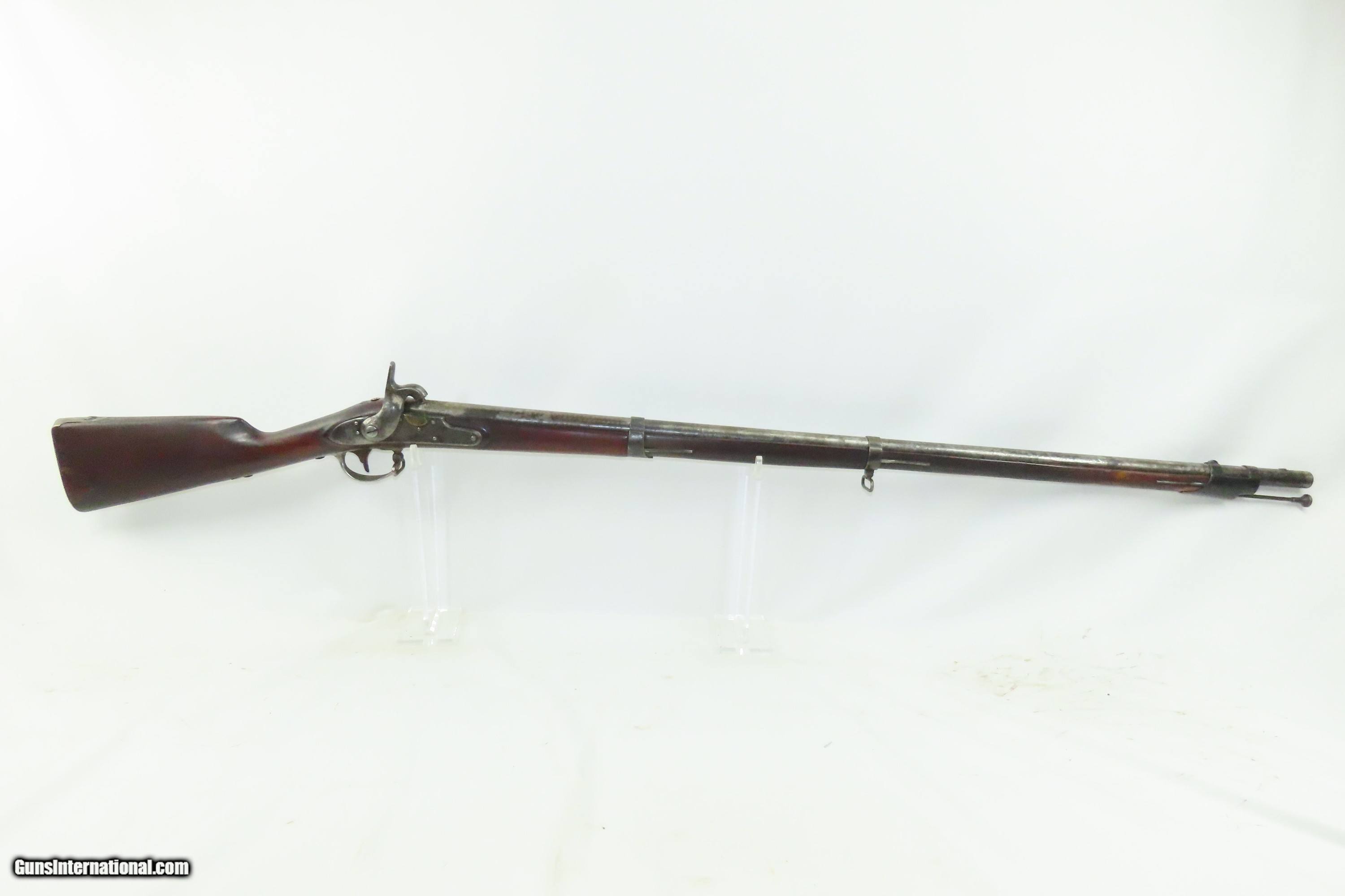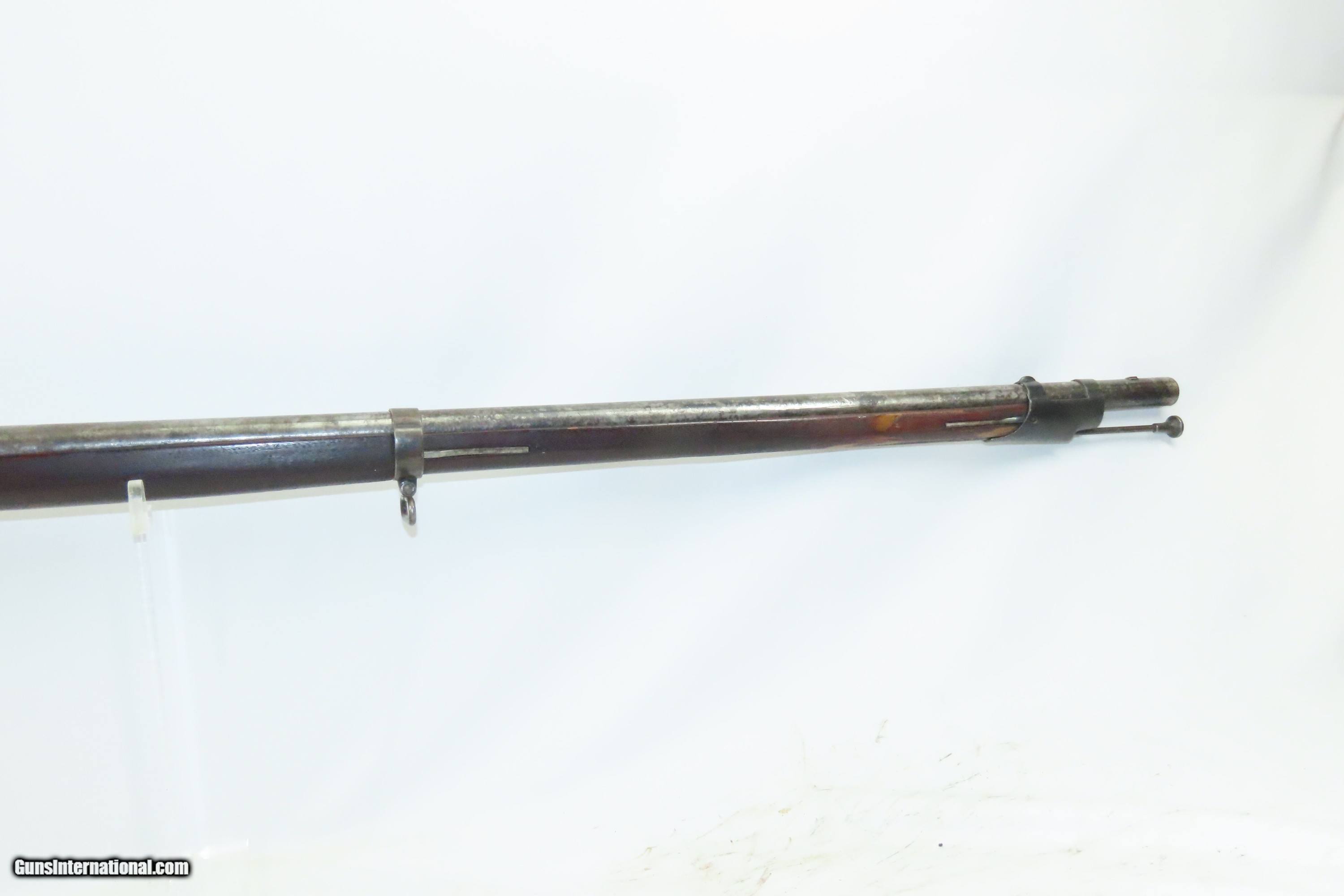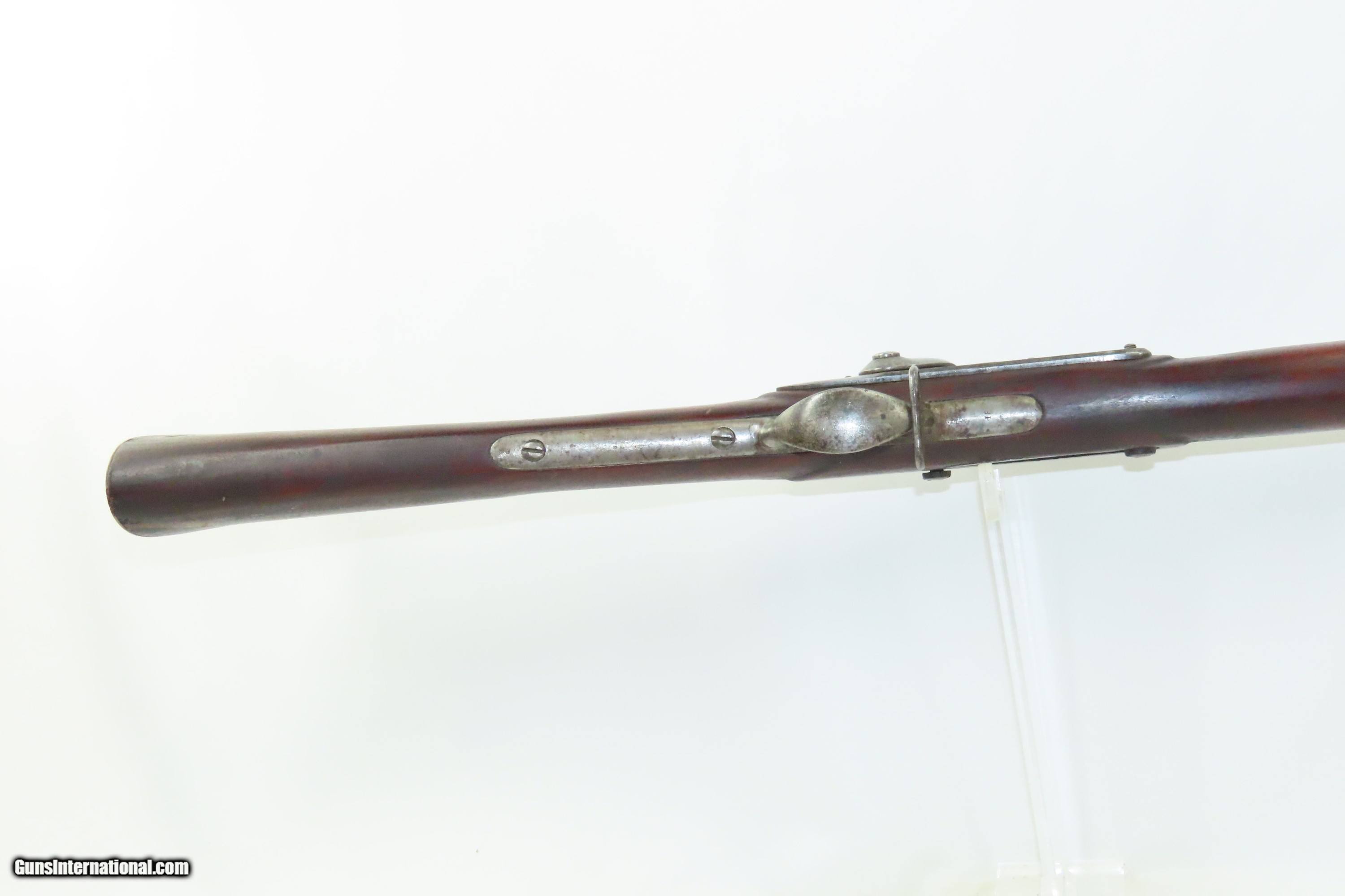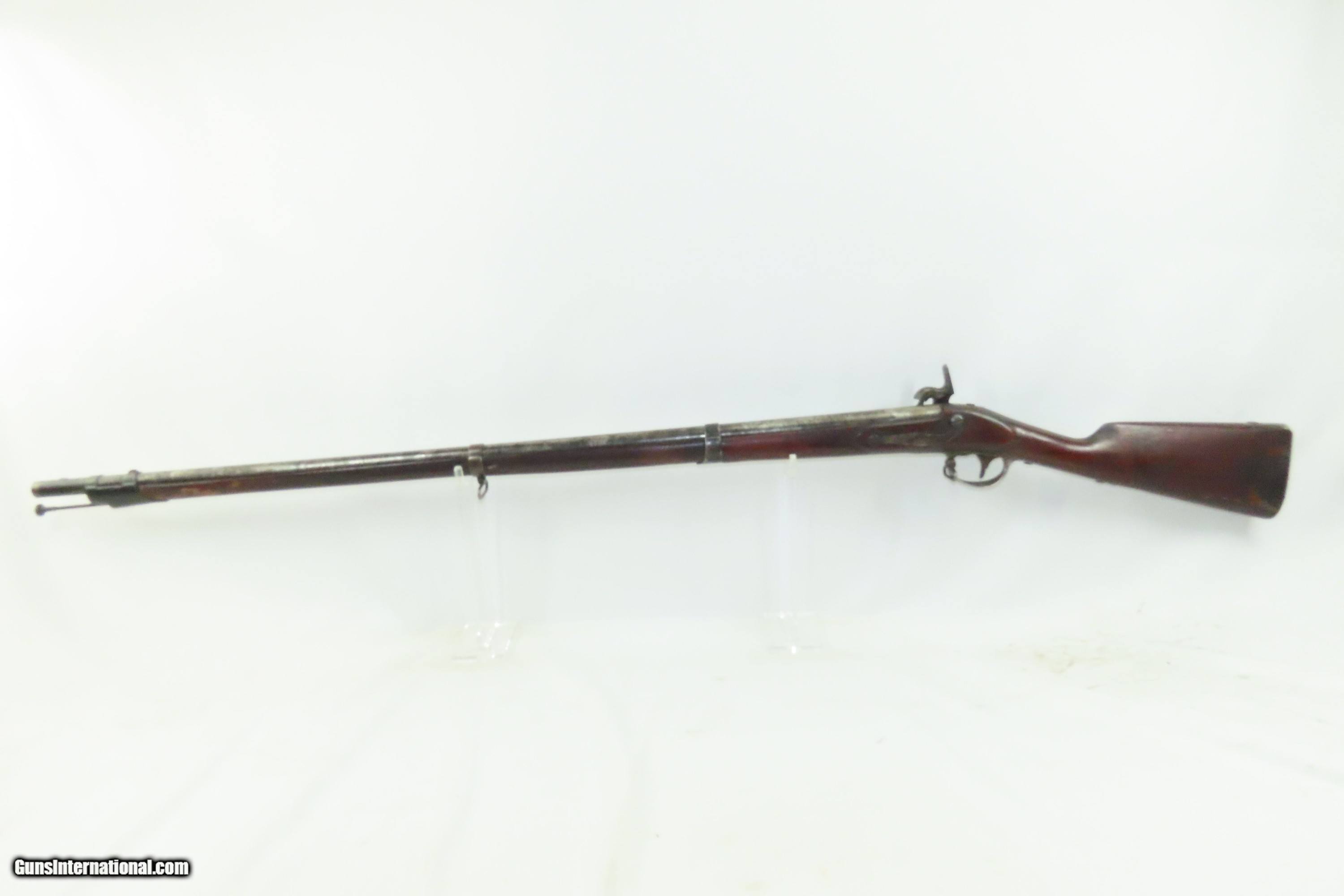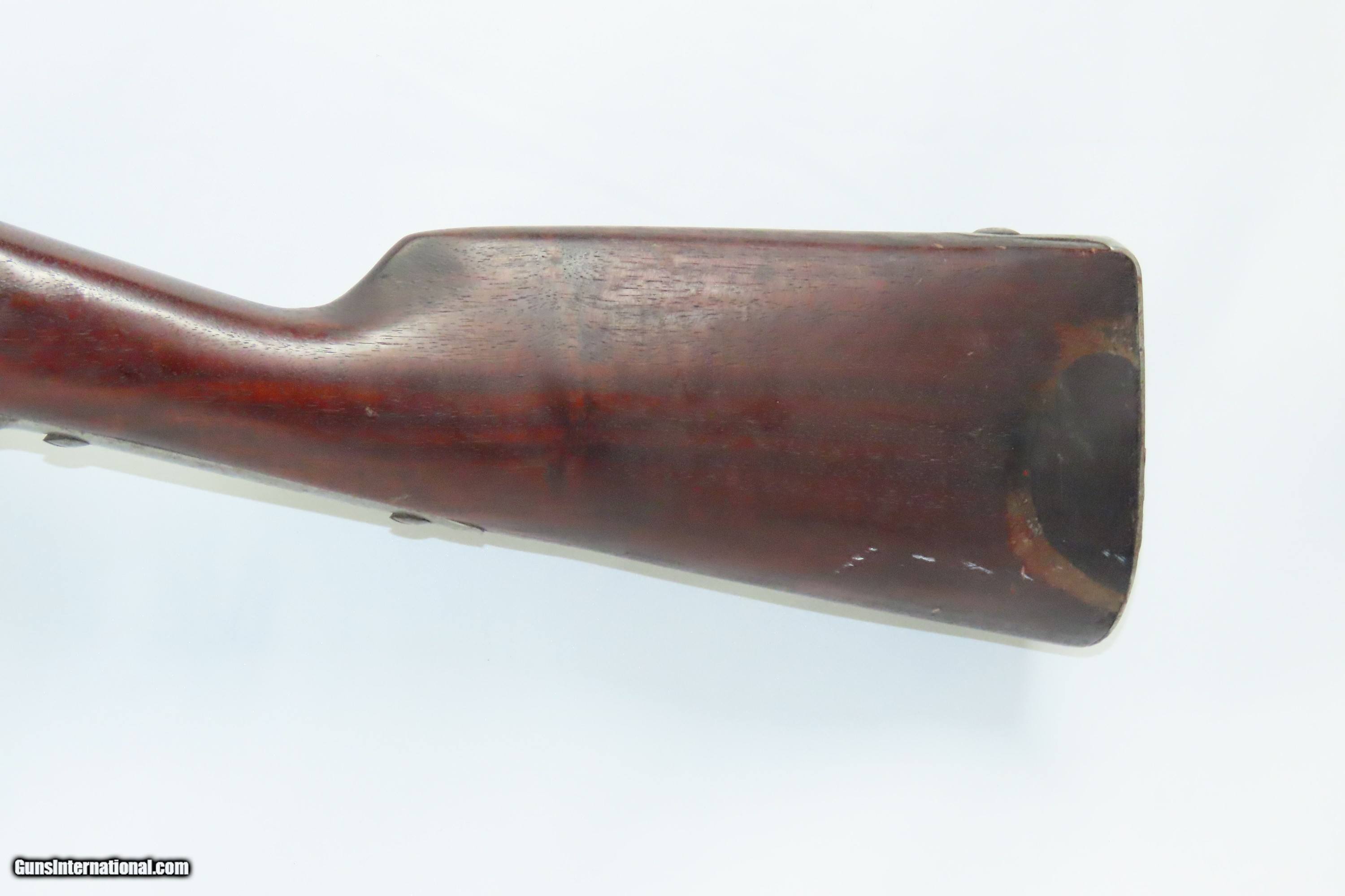 Description: Antique U.S. SPRINGFIELD ARMORY M1816 Percussion “CONE” Conversion Musket Flintlock to Percussion U.S. Military LONGARM Here we present an antique Springfield U.S. Model 1816 Conversion Musket, manufactured at the armory at Springfield, Massachusetts, circa 1839. This musket would have started out life as a smoothbore flintlock and likely converted around the start of the American Civil War. The War of 1812 revealed many weaknesses in American muskets. In an attempt to improve both the design and manufacture of the musket, the Model 1812 musket was created. The Model 1816 made further improvements and replaced the Model 1812. Harpers Ferry became America’s second national armory after the site was personally selected by George Washington, with the Springfield Armory being the first. The U.S. Congress authorized the building of the new foundry in 1794, and by the following year, was producing hundreds of arms for the national army, which was primarily flintlock muskets and pistols. Inspired largely by the French Charleville Model 1777 musket, Harpers Ferry began producing the Model 1816. The M1816 was a smoothbore, muzzle loading weapon which used a .69 caliber musket ball. A trained shooter could fire between two and three rounds at a range of up to 200 yards per minute. The Model 1816 was in production at Springfield (325,000) and Harpers Ferry (350,000) between 1816 to 1844 with around 675,000 muskets produced during this run. It saw service during the Mexican-American War and was even pressed into service during the Civil War in both the updated percussion and the old flintlock format. In the 1850’s, many 1816’s, just as this one is, went through the conversion from flintlock to the more reliable percussion system. The advent of the Model 1842 Musket made the M1816 obsolete, but not unserviceable. Eventually, most made their way to storehouses and armories. Beginning in 1848, when more than 700,000 of all types of flintlock muskets were reported in storage, the most serviceable were converted to percussion ignition. Three types of alteration were performed. All alterations involved grinding the flash pan down and replacing the hammer. The "French Style" conversion added a drum and nipple to the flashhole. The "Belgian Style" involved plugging the vent hole with a weld and tapping a nipple directly into the barrel. This is the type of conversion that was only done at Harper's Ferry and Springfield and is sometimes referred to as an "Armory” or “Cone” conversion. The last type of conversion was used late in the renovation process, beginning about 1852, and involved adding a bolster to the breech of the barrel, so it is termed the "Bolster Style" of conversion. This musket was converted to percussion using the Belgian Style Alteration method, more commonly known as the “Cone Type” conversion. All external lock parts were removed with the screw hole plugged, the pan ground flush with lock plate (leaving the remnants intact) and the small existing cavity in the pan filled with brass to give it a level or squared off profile along the top. The vent hole of the barrel was plugged with a nipple screwed into the threaded receptacle at the top of the barrel, set off center towards the lock side. Then, adding the distinctive arsenal military hammer. The overall condition is fair to good. The action is not presently functional and the hammer is very difficult but possible to move. The bore is smooth and dim. The stock shows repairs on both sides near the butt plate and remains solid throughout. Own the original! This is a legitimate antique and not a reproduction. Barrel is 42 inches. Caliber: .69 Percussion Overall condition as seen in photos. Very Fast. Very Safe. FREE SHIPPING WORLDWIDE. Delivered directly to your door by express mail! Guaranteed AUTHENTIC & Includes CERTIFICATE OF AUTHENTICITY. ancestryguns $1200 #240124 SOLD Antique: Yes |