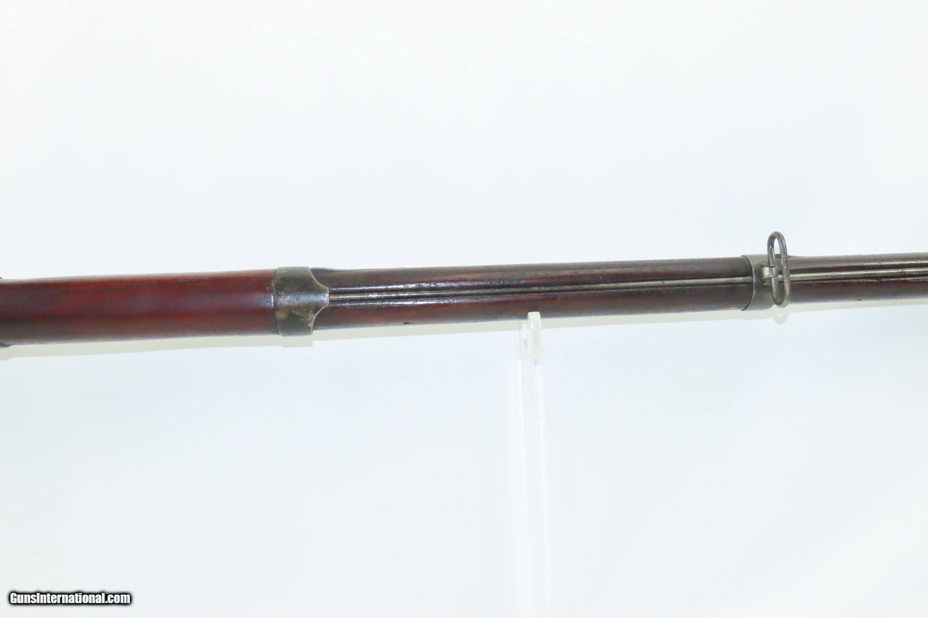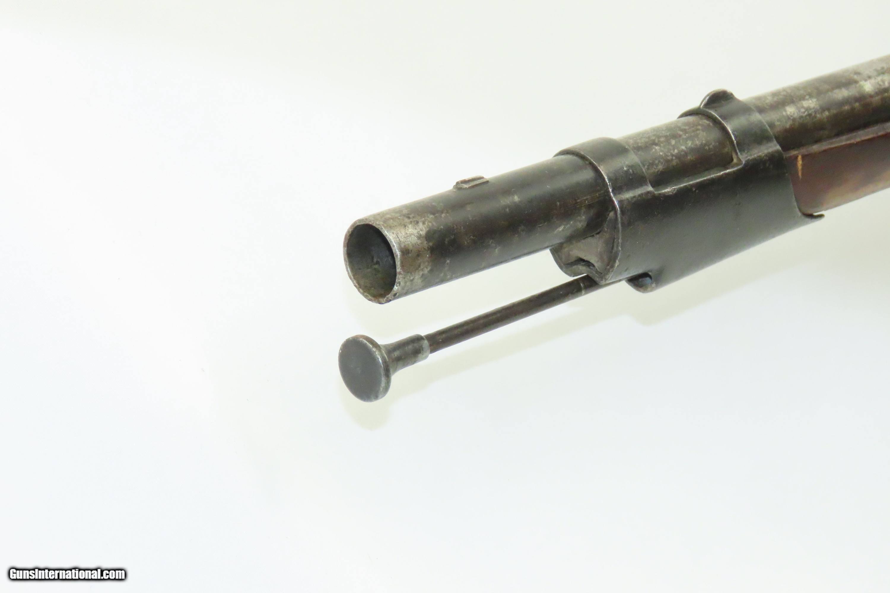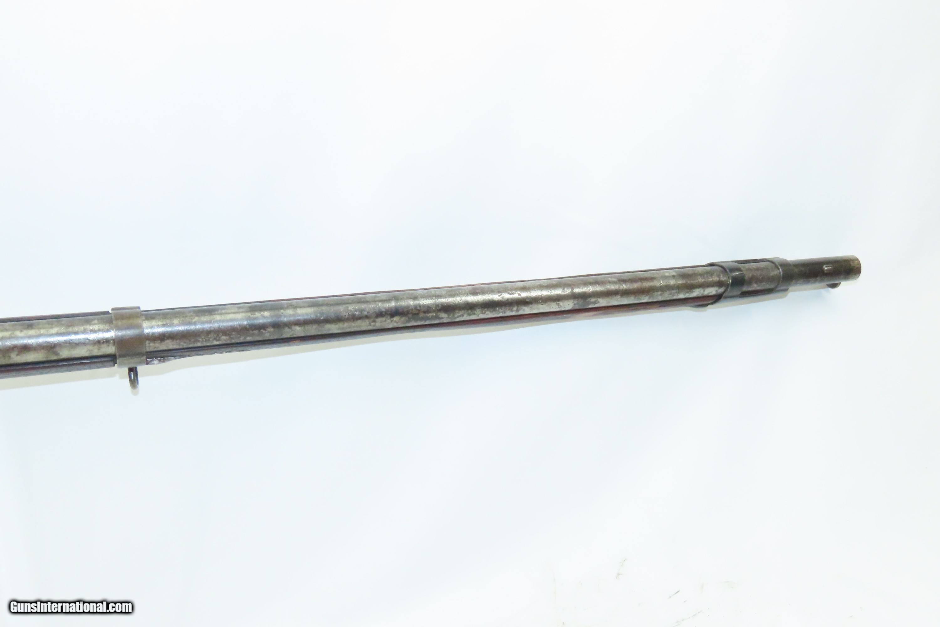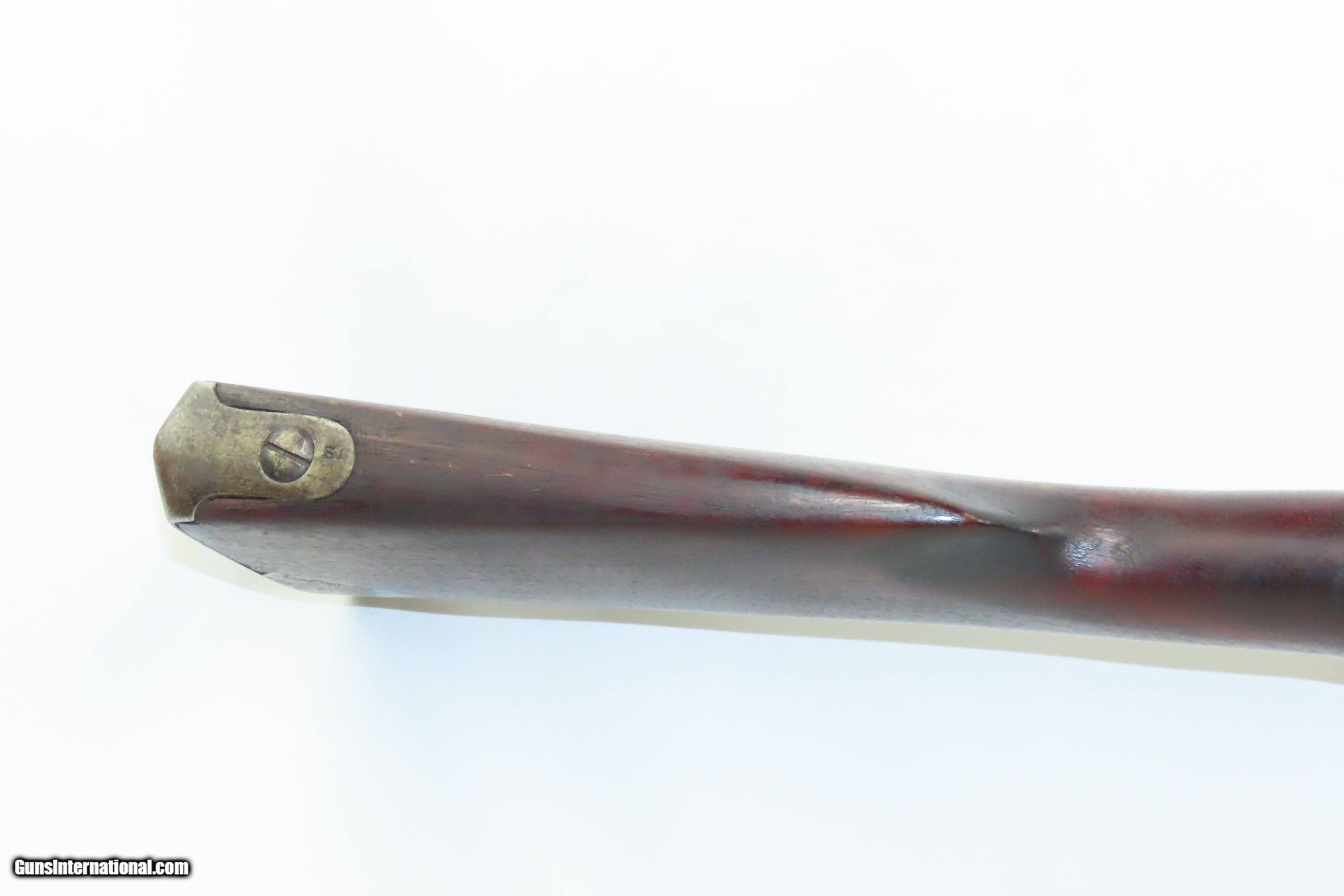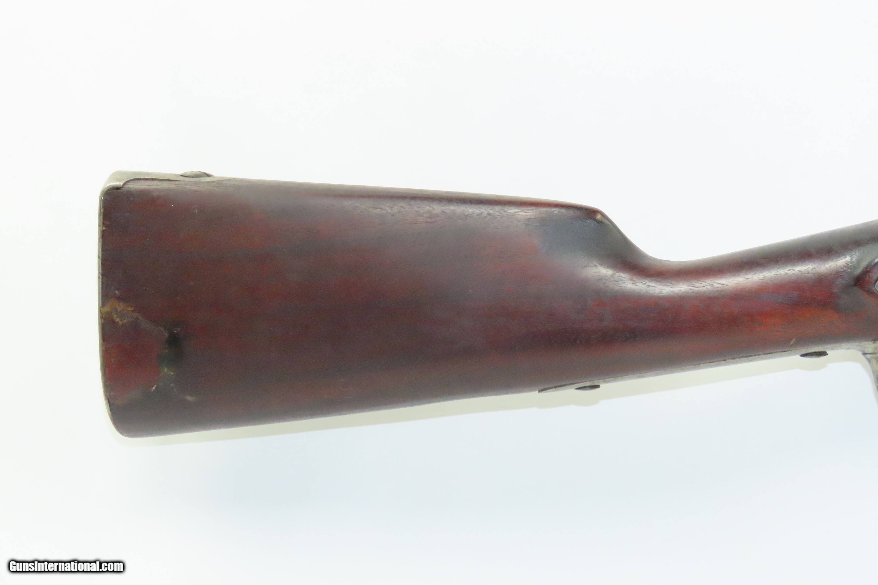Description: Antique U.S. SPRINGFIELD ARMORY M1816 Percussion “CONE” Conversion Musket Flintlock to Percussion U.S. Military LONGARM Here we present an antique Springfield U.S. Model 1816 Conversion Musket, manufactured at the armory at Springfield, Massachusetts, circa 1839. This musket would have started out life as a smoothbore flintlock and likely converted around the start of the American Civil War. The War of 1812 revealed many weaknesses in American muskets. In an attempt to improve both the design and manufacture of the musket, the Model 1812 musket was created. The Model 1816 made further improvements and replaced the Model 1812. Harpers Ferry became America’s second national armory after the site was personally selected by George Washington, with the Springfield Armory being the first. The U.S. Congress authorized the building of the new foundry in 1794, and by the following year, was producing hundreds of arms for the national army, which was primarily flintlock muskets and pistols. Inspired largely by the French Charleville Model 1777 musket, Harpers Ferry began producing the Model 1816. The M1816 was a smoothbore, muzzle loading weapon which used a .69 caliber musket ball. A trained shooter could fire between two and three rounds at a range of up to 200 yards per minute. The Model 1816 was in production at Springfield (325,000) and Harpers Ferry (350,000) between 1816 to 1844 with around 675,000 muskets produced during this run. It saw service during the Mexican-American War and was even pressed into service during the Civil War in both the updated percussion and the old flintlock format. In the 1850’s, many 1816’s, just as this one is, went through the conversion from flintlock to the more reliable percussion system. The advent of the Model 1842 Musket made the M1816 obsolete, but not unserviceable. Eventually, most made their way to storehouses and armories. Beginning in 1848, when more than 700,000 of all types of flintlock muskets were reported in storage, the most serviceable were converted to percussion ignition. Three types of alteration were performed. All alterations involved grinding the flash pan down and replacing the hammer. The "French Style" conversion added a drum and nipple to the flashhole. The "Belgian Style" involved plugging the vent hole with a weld and tapping a nipple directly into the barrel. This is the type of conversion that was only done at Harper's Ferry and Springfield and is sometimes referred to as an "Armory” or “Cone” conversion. The last type of conversion was used late in the renovation process, beginning about 1852, and involved adding a bolster to the breech of the barrel, so it is termed the "Bolster Style" of conversion. This musket was converted to percussion using the Belgian Style Alteration method, more commonly known as the “Cone Type” conversion. All external lock parts were removed with the screw hole plugged, the pan ground flush with lock plate (leaving the remnants intact) and the small existing cavity in the pan filled with brass to give it a level or squared off profile along the top. The vent hole of the barrel was plugged with a nipple screwed into the threaded receptacle at the top of the barrel, set off center towards the lock side. Then, adding the distinctive arsenal military hammer. The overall condition is fair to good. The action is not presently functional and the hammer is very difficult but possible to move. The bore is smooth and dim. The stock shows repairs on both sides near the butt plate and remains solid throughout. Own the original! This is a legitimate antique and not a reproduction. Barrel is 42 inches. Caliber: .69 Percussion Overall condition as seen in photos. Very Fast. Very Safe. FREE SHIPPING WORLDWIDE. Delivered directly to your door by express mail! Guaranteed AUTHENTIC & Includes CERTIFICATE OF AUTHENTICITY. ancestryguns $1200 #240124 SOLD Antique: Yes |