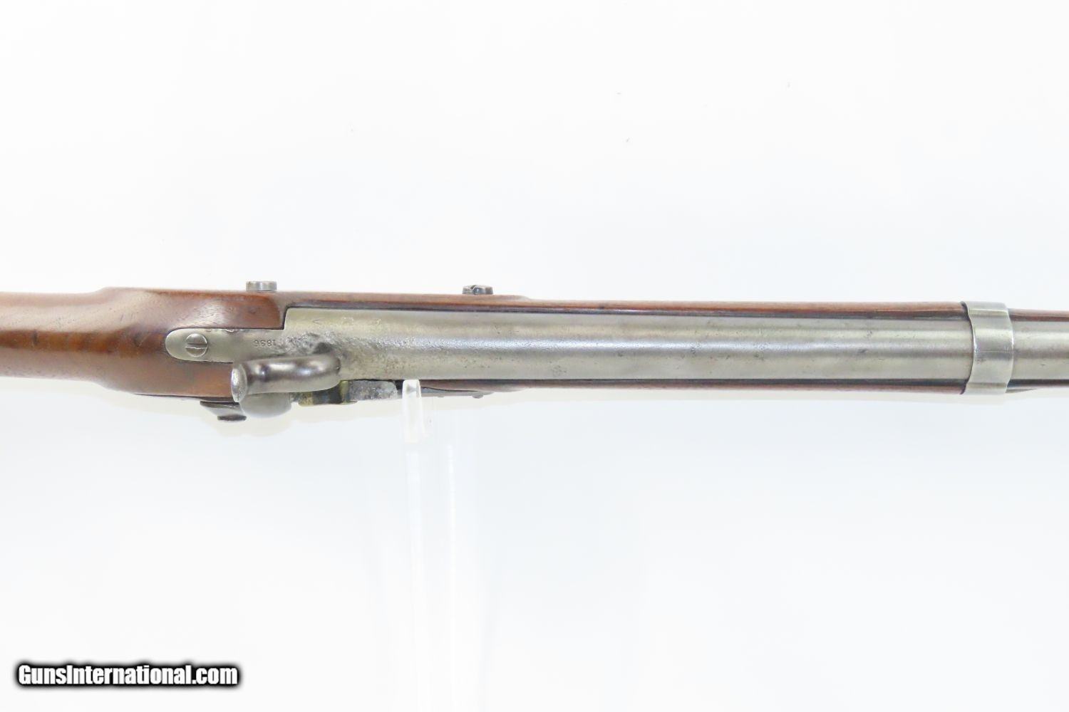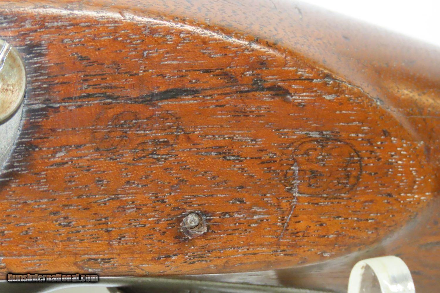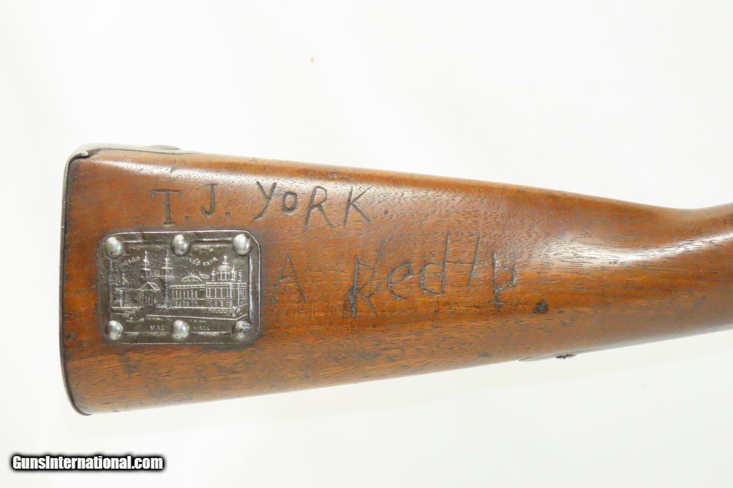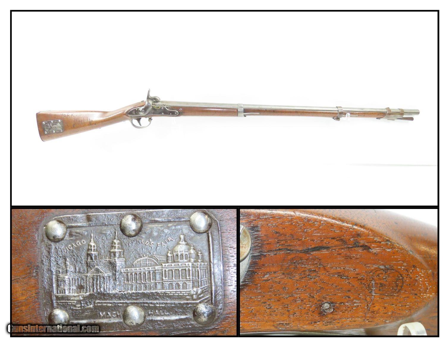 Description: Antique U.S. SPRINGFIELD ARMORY M1816 Percussion “CONE” Conversion Musket With CHICAGO WORLD’S FAIR Plaque & Graffiti Here we present an antique Springfield U.S. Model 1816 Conversion Musket, manufactured at the armory at Springfield, Massachusetts, circa 1836. This one has an interesting old placard regarding the Chicago World’s Fair depicting Machinery Hall of 1893, as well as various names carved into the stock. Both sides of the butt stock are hand carved with “SL HINE” on the left and “T.J. YORK” and “A ReeHb” on the right. There is a very good chance that these were not simply prior owners but various users of this musket though it is difficult to be sure without full names, but matches to last names and initials can be made in the roles from the Civil War. The advent of the Model 1842 Musket made the M1816 obsolete, but not unserviceable. Eventually, most made their way to storehouses and armories. Beginning in 1848, when more than 700,000 of all types of flintlock muskets were reported in storage, the most serviceable were converted to percussion ignition. Three types of alteration were performed. All alterations involved grinding the flash pan down and replacing the hammer. This Model 1816 flintlock musket has been converted to percussion using the Belgian Style Alteration method, more commonly known as the “Cone Type” conversion. All external lock parts were removed with the screw hole plugged, the pan ground flush with lock plate (leaving the remnants intact) and the small existing cavity in the pan filled with brass to give it a level or squared off profile along the top. The vent hole of the barrel was plugged with a nipple screwed into the threaded receptacle at the top of the barrel, set off center towards the lock side. Then, adding the distinctive arsenal, military hammer. The overall condition is very good. The action is strong. Good smooth bore. The walnut stock is solid overall. There is an old chip missing just in front of the trigger guard though which you can see the ramrod. “US” stamped lock and buttplate. The lock is dated “1835” while the barrel reads “1836”. Here is a wonderful musket with some interesting features! Own the original! This is a legitimate antique and not a reproduction. Barrel is 36-1/2 inches. Caliber: .69 Percussion Overall condition as seen in photos. Very Fast. Very Safe. FREE SHIPPING WORLDWIDE. Delivered directly to your door by express mail! Guaranteed AUTHENTIC & Includes CERTIFICATE OF AUTHENTICITY. ancestryguns $1785 #210857 SOLD Antique: Yes |