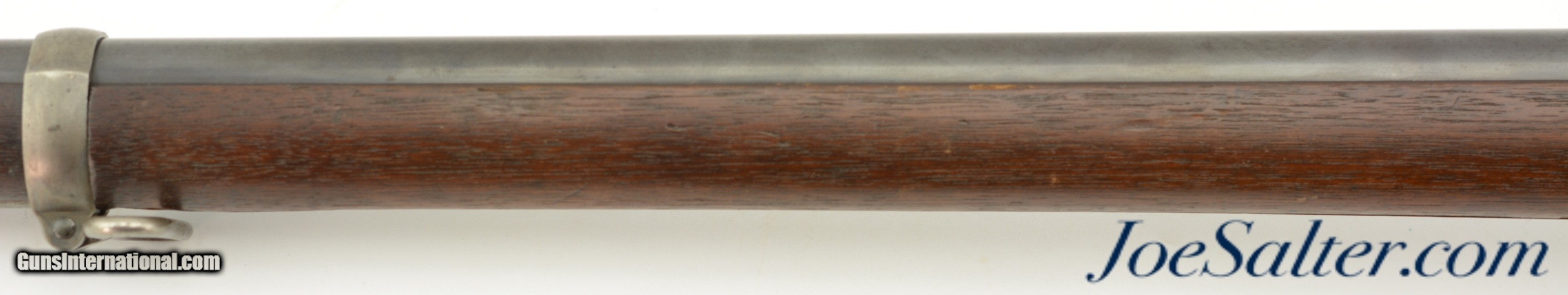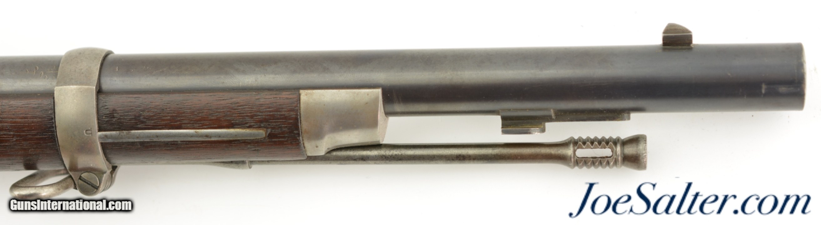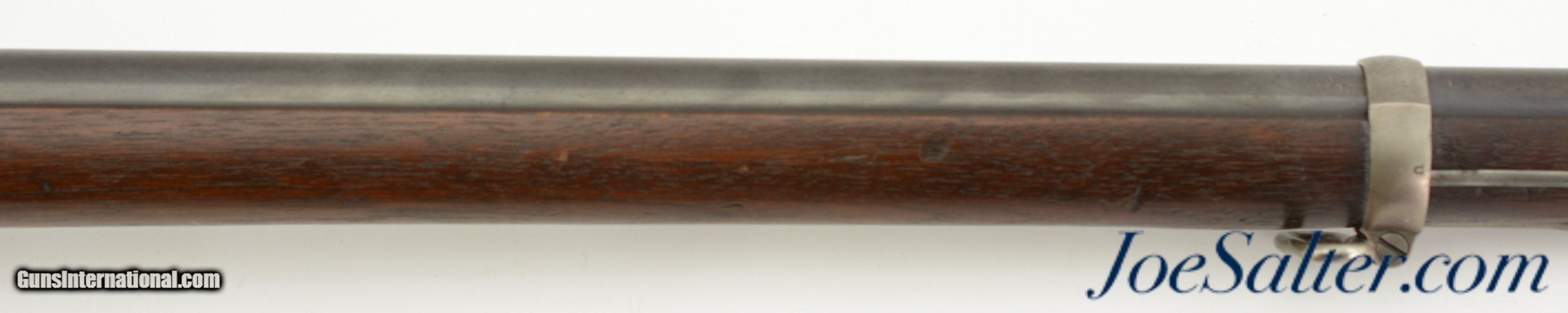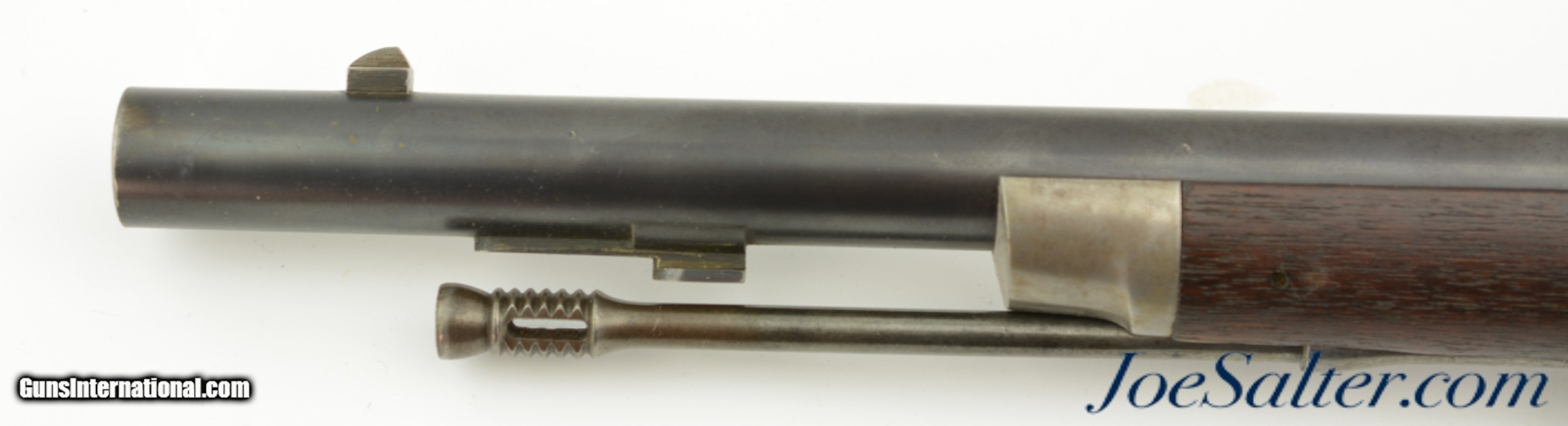 Description: NSN, .50 CF, 32 5/8" barrel with an excellent, bright bore. This is one of the production USN Rolling Blocks with rear sight about midway between the rear band and the receiver. The barrel has retained 95-97% of the original blue finish with only some trace silvering at the muzzle, and faint specks of surface freckling barely visible along the top of the barrel. The frame has crisp markings with slightly muted original color case-hardening throughout. There are some further spots of very mild freckling on the hammer and breechblock, but with armory bright metal along the sides. The walnut forend and buttstock are in fine condition with a few minor handling marks and small surface blemishes in the original military oil finish. The "ESA" cartouche on the left side of the wrist is crisp and clear. The rifle comes with a correct metal ramrod, as well as an original Ames-made saber bayonet measuring 24 7/8" overall with a 20" straight, double-edged blade with central fullers. The blade is in excellent condition with bright steel and crisp "USN / CGS / 1870" markings on the ricasso reverse. The cast brass hilt has a dull yellow-orange patina and functional press-stud, while the scabbard has darkly tarnished throat and chape, and an intact black leather body. This is a simply splendid example of a rare USN rifle, complete with original bayonet, and rates excellent condition overall. Antique; SOLD Antique: Yes |