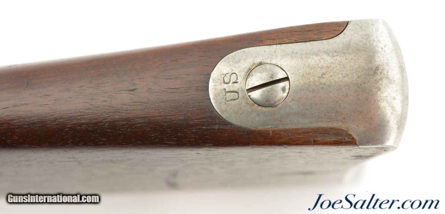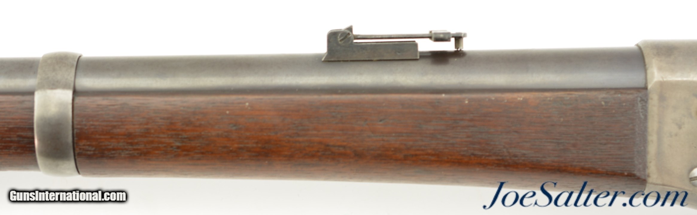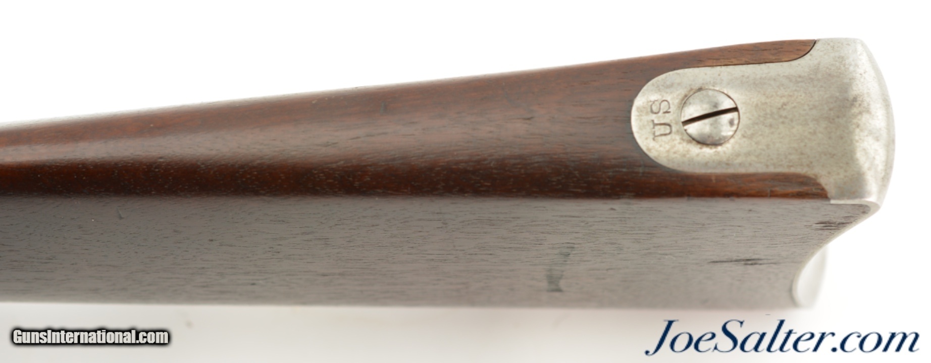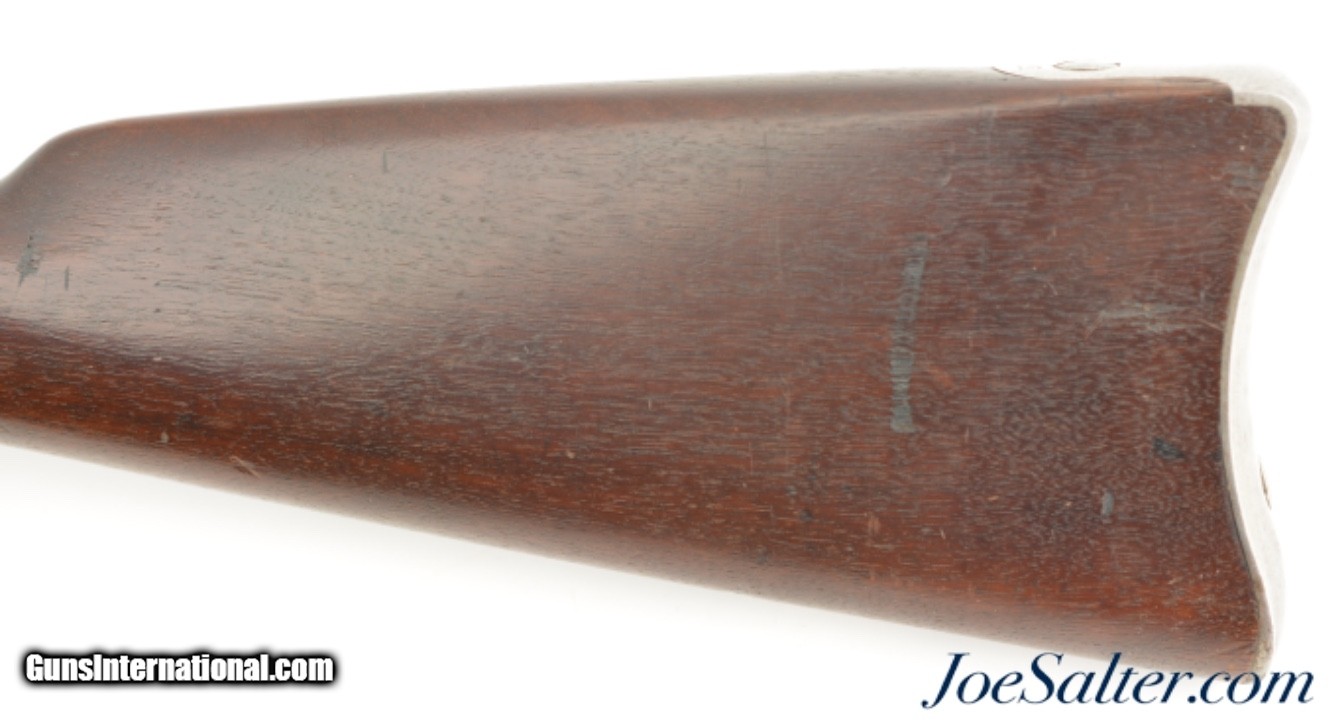 Description: NSN, .50 CF, 32 5/8" barrel with an excellent, bright bore. This is one of the production USN Rolling Blocks with rear sight about midway between the rear band and the receiver. The barrel has retained 95-97% of the original blue finish with only some trace silvering at the muzzle, and faint specks of surface freckling barely visible along the top of the barrel. The frame has crisp markings with slightly muted original color case-hardening throughout. There are some further spots of very mild freckling on the hammer and breechblock, but with armory bright metal along the sides. The walnut forend and buttstock are in fine condition with a few minor handling marks and small surface blemishes in the original military oil finish. The "ESA" cartouche on the left side of the wrist is crisp and clear. The rifle comes with a correct metal ramrod, as well as an original Ames-made saber bayonet measuring 24 7/8" overall with a 20" straight, double-edged blade with central fullers. The blade is in excellent condition with bright steel and crisp "USN / CGS / 1870" markings on the ricasso reverse. The cast brass hilt has a dull yellow-orange patina and functional press-stud, while the scabbard has darkly tarnished throat and chape, and an intact black leather body. This is a simply splendid example of a rare USN rifle, complete with original bayonet, and rates excellent condition overall. Antique; SOLD Antique: Yes |
