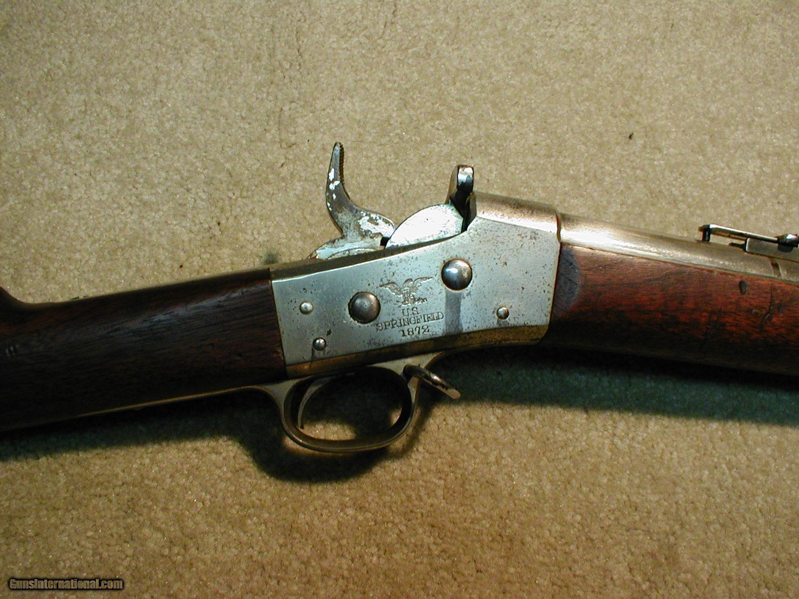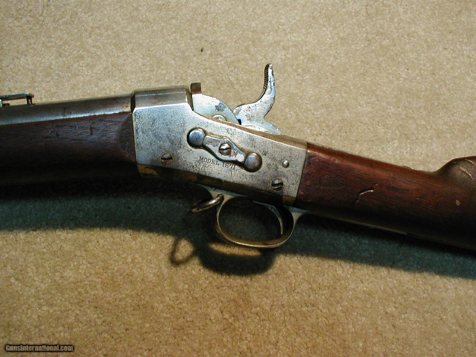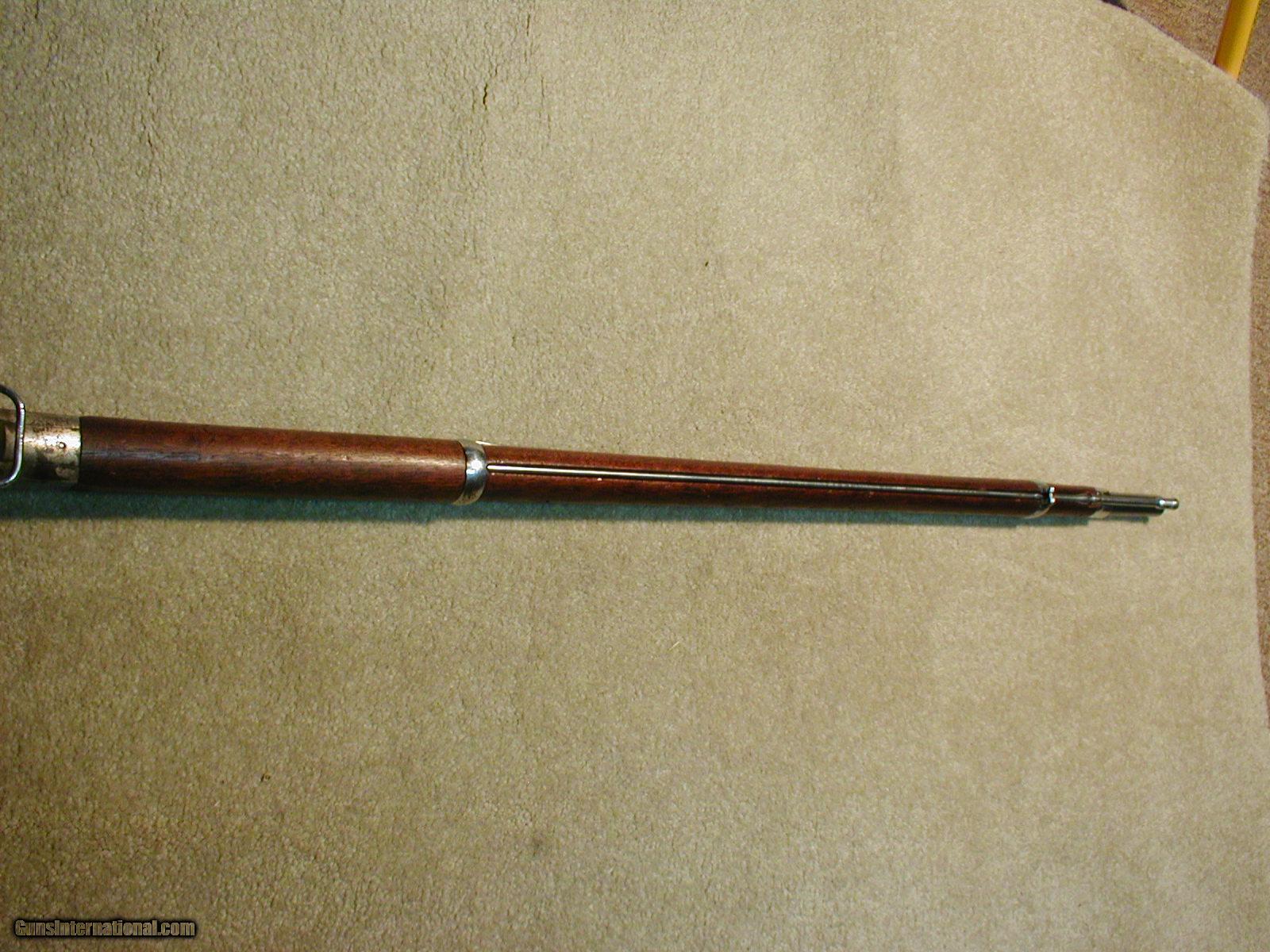 Description: REMINGTON/SPRINGFIELD RARITY! THIS IS A MODEL 1871 U.S. ARMY .50-70 ROLLING BLOCK MUSKET WITH ORIGINAL SPRINGFIELD FULL NICKEL FINISH! AND ALL IN EXC. OVERALL CONDITION! According to the relatively new book REMINGTON ROLLING BLOCK MILITARY RIFLES OF THE WORLD by Layman, in the early 1870s Springfield was experimenting with nickel plating and tin plating of arms and obviously this was one! I have seen a few others, but mostly they were commercial Rolling Blocks nickel plated by Remington- they were popular in the Southwest and south of the border (interesting to note that most of the .44-40 Baby Rolling Block carbines were full nickel plated). This one retains excellent very slightly cloudy nickel on the barrel (from age) but nearly full coverage including the rear sight, barrel bands and rear swivel (needs front swivel only, receiver shows most of the nickel intact with some normal freckling and some light wear mainly to the left side and bottom front section, exc.+ wood with sharp and clear "ESA" cartouche, Exc. and sharp Rem. markings on the upper tang, U.S. marked butt plate, left side of the receiver correctly marked with "MODEL 1871" and right side has the eagle motif with correct sharp "U.S. Springfield 1872" markings, minty bright bore, tight action with correct "safety" in which the hammer falls slightly to a safety notch when the breech block is closed (found only on this model and the New York contract .50-70 rifles- it was a great feature that should have been included in ALL Rolling Blocks). This one has it all: Rarity , historical U.S. Military issue during the Indian Wars period, condition, great caliber etc. SOLD Antique: Yes Manufacturer: REMINGTON & SPRINGFIELD Model: 1871 U. S. ARMY ROLLING BLOCK Serial Number: N/A Caliber Info: .50-70 Condition: EXC Barrels: 36 |