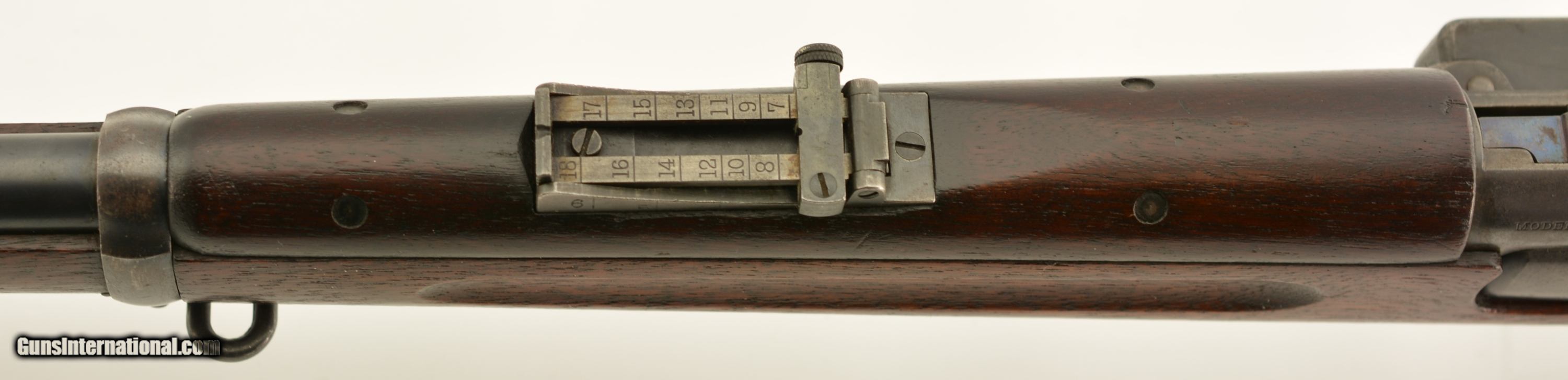 Description: Serial #79924, .30-40 Krag, 30" barrel with an excellent, bright bore. This is a handsome rifle that retains 92-95% of the original blue finish, with some mild silvering at the muzzle, as well as a few small spots of fading along the exposed portion of the barrel, and on some of the high edges and projections. The bolt has a plum-brown patina on the handle, with the body having a bright gray patina under a thin coating of protective grease. The extractor has most of the original brilliant fire blue remaining. The magazine cutoff selector was removed at some point. The walnut stock and handguard have not been sanded, and a thin coat of protective varnish added. There are small handling marks and minor blemishes scattered about and some small spots of white paint near the butt, but the cartouche is still quite clear and legible: "ISA / 1896." Additionally, a large "S" was neatly carved into the According to the Springfield Research ledger, this rifle was assigned to Co. I, 4th US Volunteer Infantry Regiment, and was received on September 10, 1898. The 4th was organized and mustered at Washington DC, and environs during June of 1898, comprised of 46 officers and 962 enlisted men and NCOs. The regiment was assigned to 3rd Brigade, 1st Division, 7th Army Corps on August 19, when they arrived at Jacksonville. FL prior to embarking for Cuba. They arrived at Manzanillo, Cuba on October 18, 1898, and performed garrison duties at Manzanillo, Campachuela, Bayamo, Niquero, Jiguani, and Viquetas before embarking for the US aboard the steamer "Dixie" on May 11, 1899. They arrived at New York City five days later and traveled to Camp Meade, PA, on May 17. The regiment mustered out of service on June 8, 1899. This is a great, documented Spanish-American War Krag, and is in fine-near excellent condition. Antique SOLD |