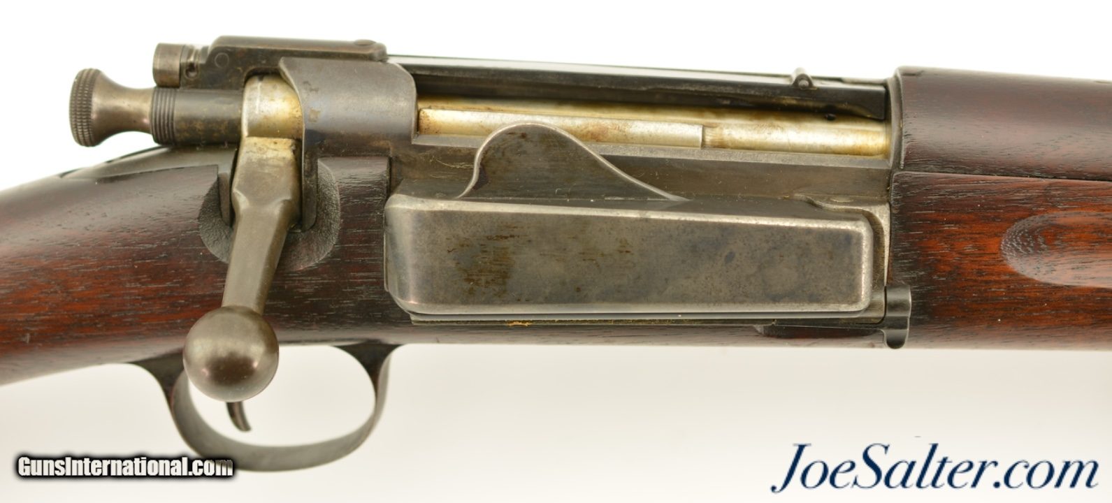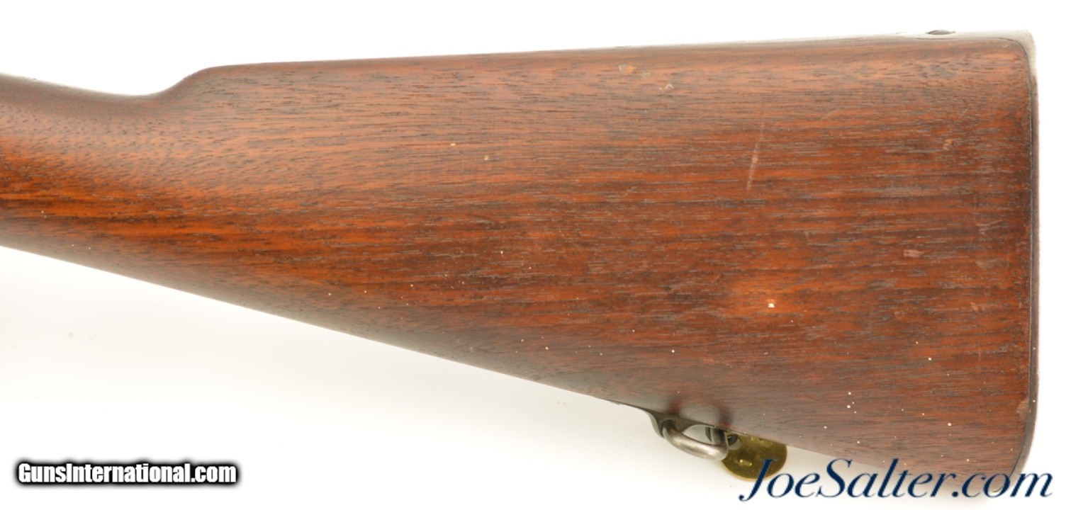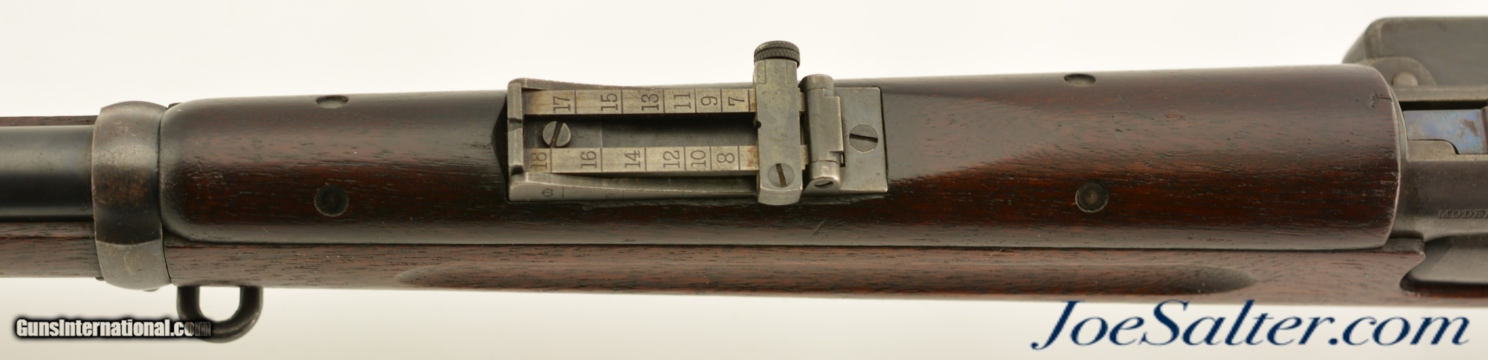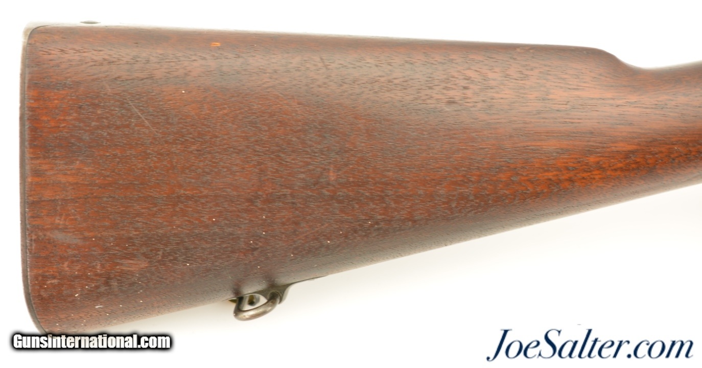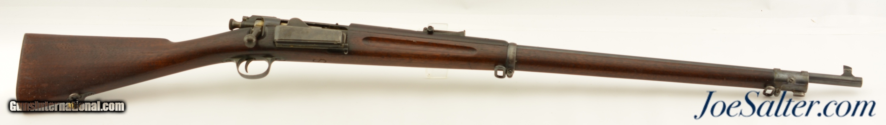 Description: Serial #79924, .30-40 Krag, 30" barrel with an excellent, bright bore. This is a handsome rifle that retains 92-95% of the original blue finish, with some mild silvering at the muzzle, as well as a few small spots of fading along the exposed portion of the barrel, and on some of the high edges and projections. The bolt has a plum-brown patina on the handle, with the body having a bright gray patina under a thin coating of protective grease. The extractor has most of the original brilliant fire blue remaining. The magazine cutoff selector was removed at some point. The walnut stock and handguard have not been sanded, and a thin coat of protective varnish added. There are small handling marks and minor blemishes scattered about and some small spots of white paint near the butt, but the cartouche is still quite clear and legible: "ISA / 1896." Additionally, a large "S" was neatly carved into the According to the Springfield Research ledger, this rifle was assigned to Co. I, 4th US Volunteer Infantry Regiment, and was received on September 10, 1898. The 4th was organized and mustered at Washington DC, and environs during June of 1898, comprised of 46 officers and 962 enlisted men and NCOs. The regiment was assigned to 3rd Brigade, 1st Division, 7th Army Corps on August 19, when they arrived at Jacksonville. FL prior to embarking for Cuba. They arrived at Manzanillo, Cuba on October 18, 1898, and performed garrison duties at Manzanillo, Campachuela, Bayamo, Niquero, Jiguani, and Viquetas before embarking for the US aboard the steamer "Dixie" on May 11, 1899. They arrived at New York City five days later and traveled to Camp Meade, PA, on May 17. The regiment mustered out of service on June 8, 1899. This is a great, documented Spanish-American War Krag, and is in fine-near excellent condition. Antique SOLD Antique: Yes |