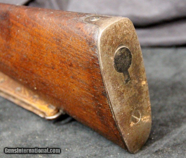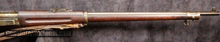 Description: .30-40, #40127, 30 inch arrel, armory blue finish, walnut stock and hand guard, 1901 barrel sight, sling, 1897. Condition: very good bore, 80% finish thinning, excellent wood, no clear cartouche, excellent mechanically, excellent marks. SOLD Antique: Yes |