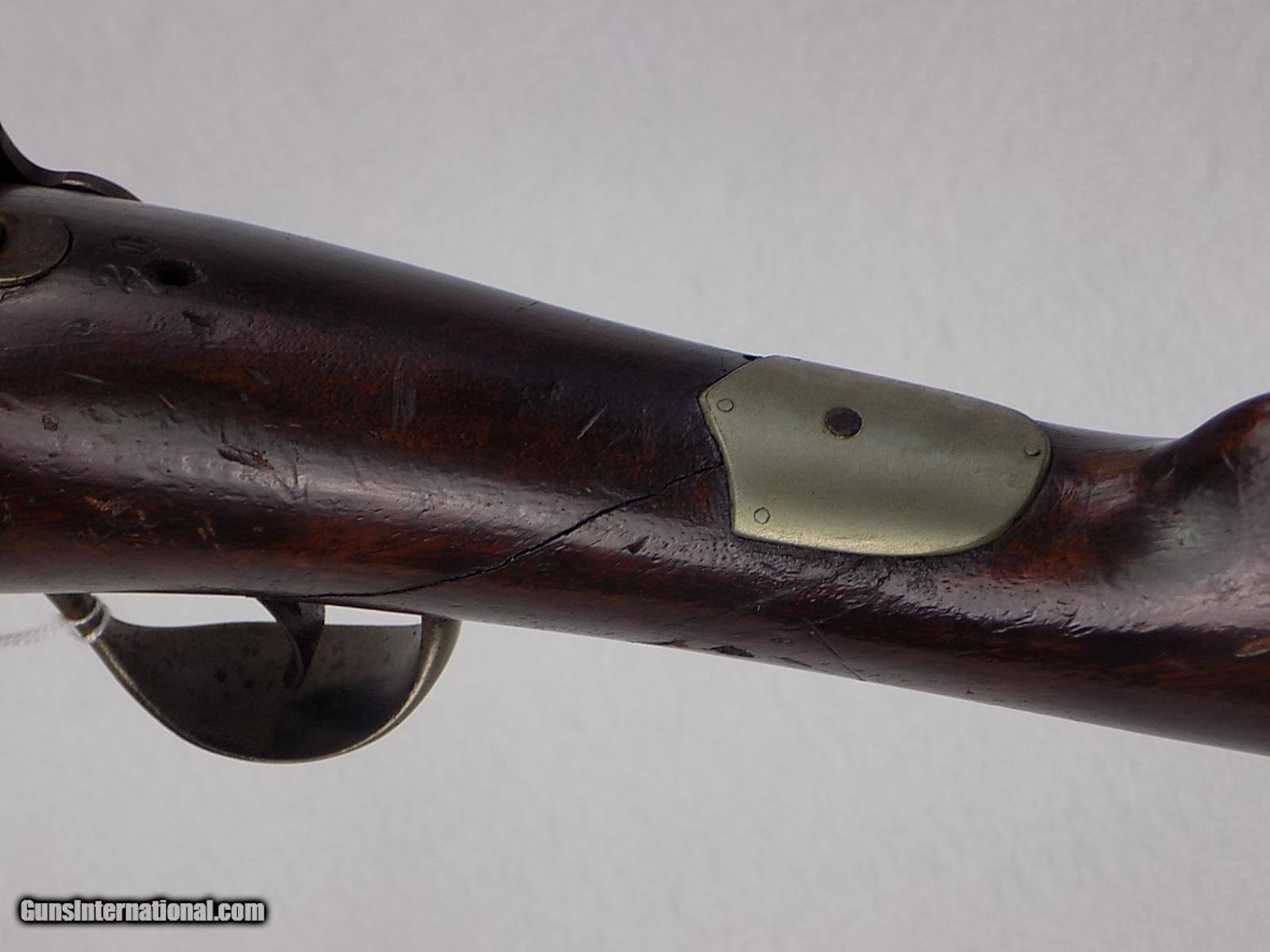 Description: #3142A SPRINGFIELD ALLEN 1ST MODEL CONVERSION, 58 RF, 30 bbl., 2 bbl. bands, ramrod & cleaning rod, typical military flip up rear sight, post front sight, silver shield in top of wrist, probably for someone s initials, repaired crack in wrist area, I believe this may be a model made up for cadet use, VG bore, lock plate stamped 1865, lock plate buttplate & trigger guard are silver plated, possibly the bbl. bands too but most of it is worn off, very unusual piece, very scarce. $1250 SOLD Antique: Yes Rifle Caliber: .58 |