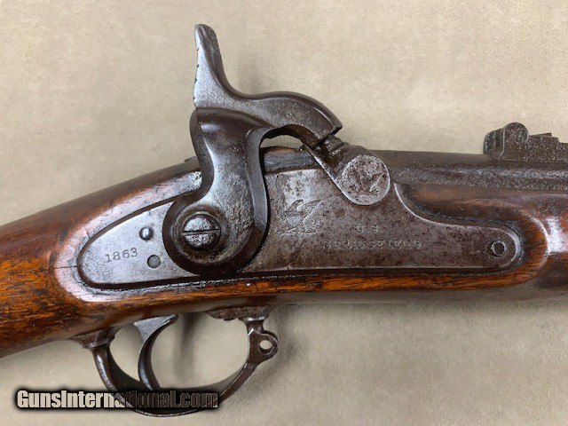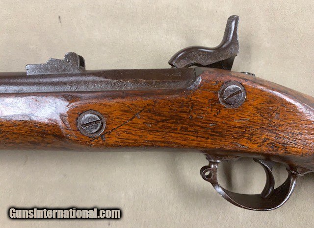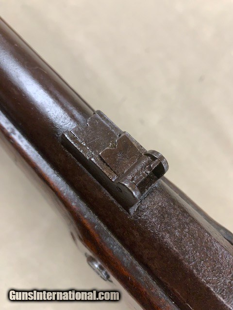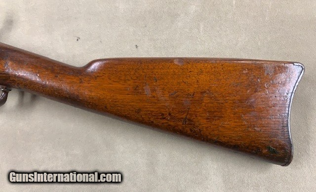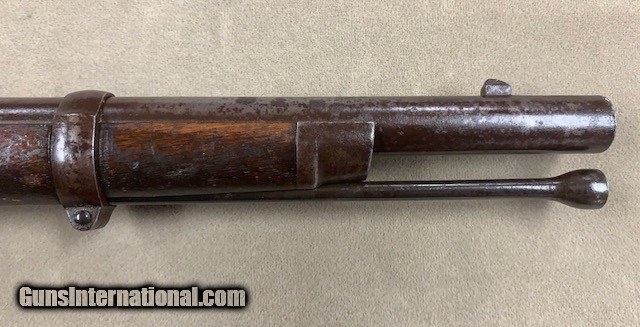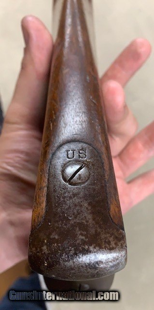 Description: If your long lost relative fought in the Civil War this may have been his firearm. Both sides used Springfields, with Confederate soldiers bearing weapons captured from Northern Troops as well as guns purchased directly just prior and at the start of the conflict. An original US Civil War issued Springfield Model 1861 Pattern Musket with an 1863 dated lock, original cleaning rod, etc. Musket has an excellent condition stock with visible cartouches (see photo). Metal is what I call "barn find brown" and there is some pitting especially on top of the barrel towards the breech. Still a nice example from "the war of northern aggression", and a wonderful artifact that is 157 years old. SOLD Curio/Relic: Yes Antique: Yes Rifle Caliber: .58 |