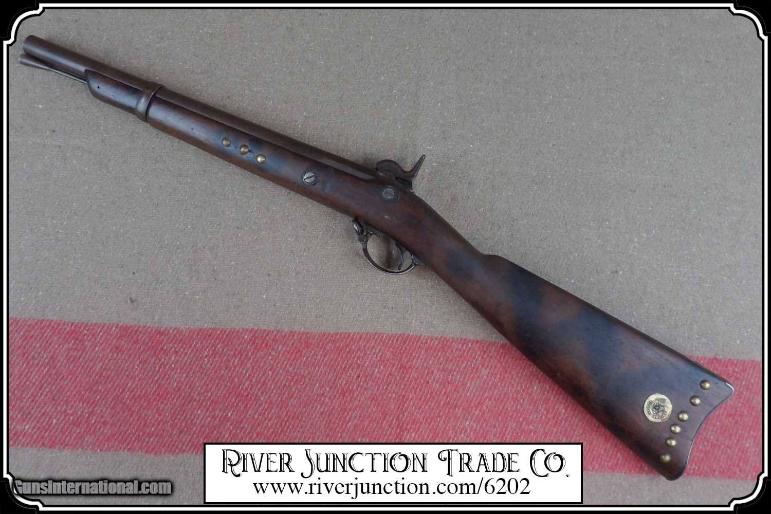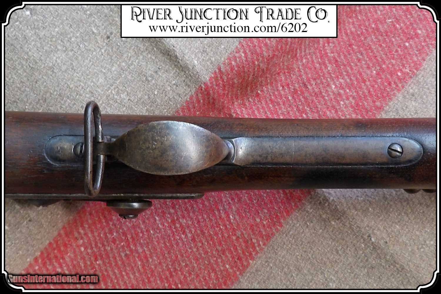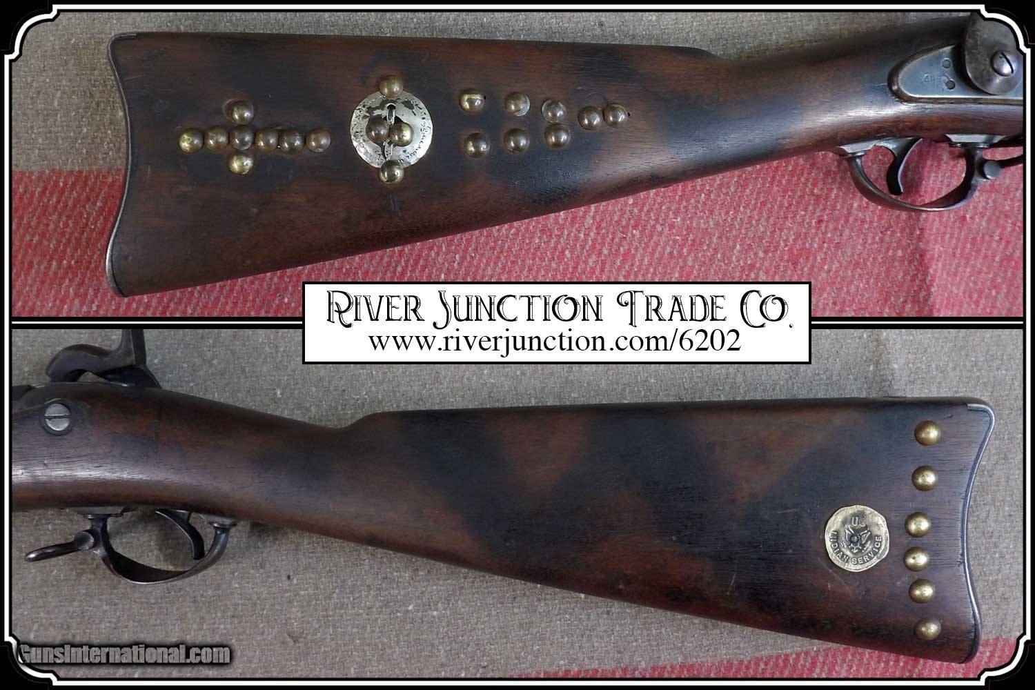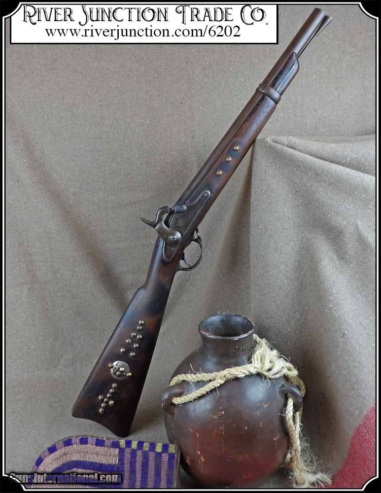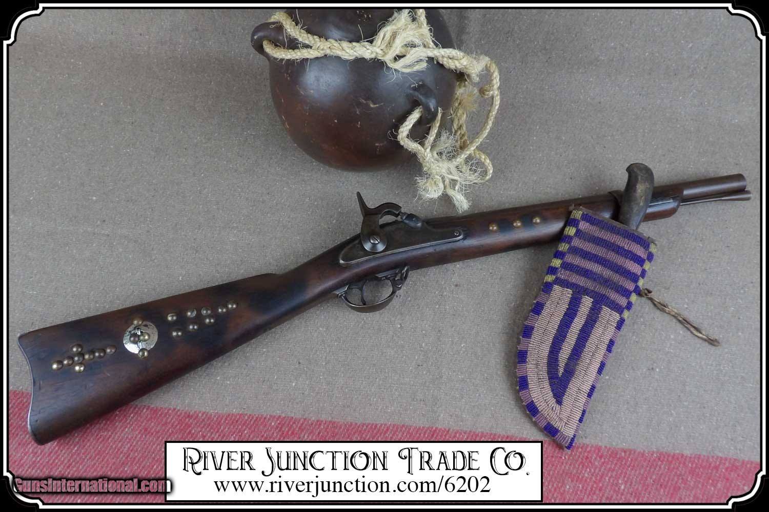 Description: Many weapons used by Native Americans would have been present at most of the late 19th century's most well-known battles, including the Battle of Little Bighorn. This was a U.S. Springfield Model 1863 rifle-musket and has since been bored out to .62 caliber smoothbore, and sawed off to a 16 inch barrel. It has an overall length of 31 inches. The ramrod is 16 inches long. The wood has a short crack above the barrel band and only minor nicks and dings otherwise. The lock is marked US over Springfield.The gun has an even, pleasant, brown patina, which is smooth and uncleaned. The lock, hammer, trigger guard, butt, tang, are all in perfect condition and ready for daily use. It is a good sound horseback or canoe gun. The tacks on the stock make me think that it might have been a reservation gun and the medallion on the left side of the stock reads US INDIAN SERVICE. It sure is interesting. Other items are not included. This is an ANTIQUE and can be shipped directly to you. (adult signature required) this is an Antique and I think a good sound shooter. No guarantees, warranties, or liabilities for any actual usage. If any firearms are to be used for shooting purposes, a qualified gunsmith should inspect them first. We will ship outside the U.S.A. Payment: Item, can be ordered on line with a credit card or paypal on our sight. Just Google (riverjunction) and type in the River Junction Trade Co. item number (6202) in the search box. Before you checkout you will see shipping cost and total. OR If you prefer: Pay by cash, postal money order, cashiers check, personal & business checks. We wait for checks to clear. We always answer questions and entertain offers. Have questions? Call me 563-880-4588. Jim SOLD |