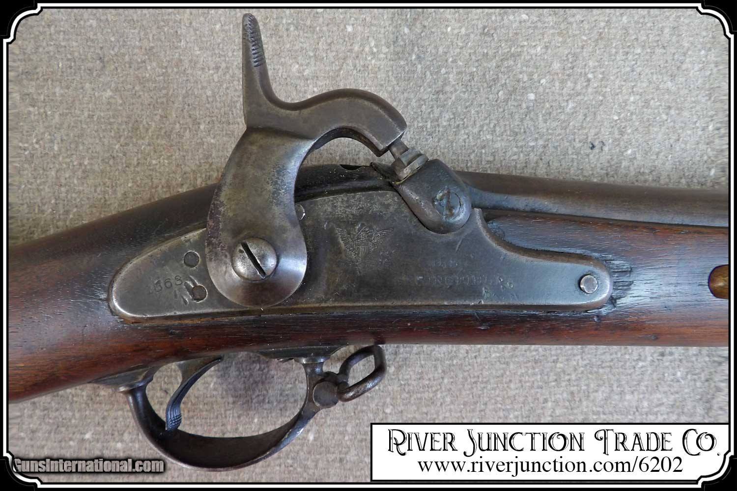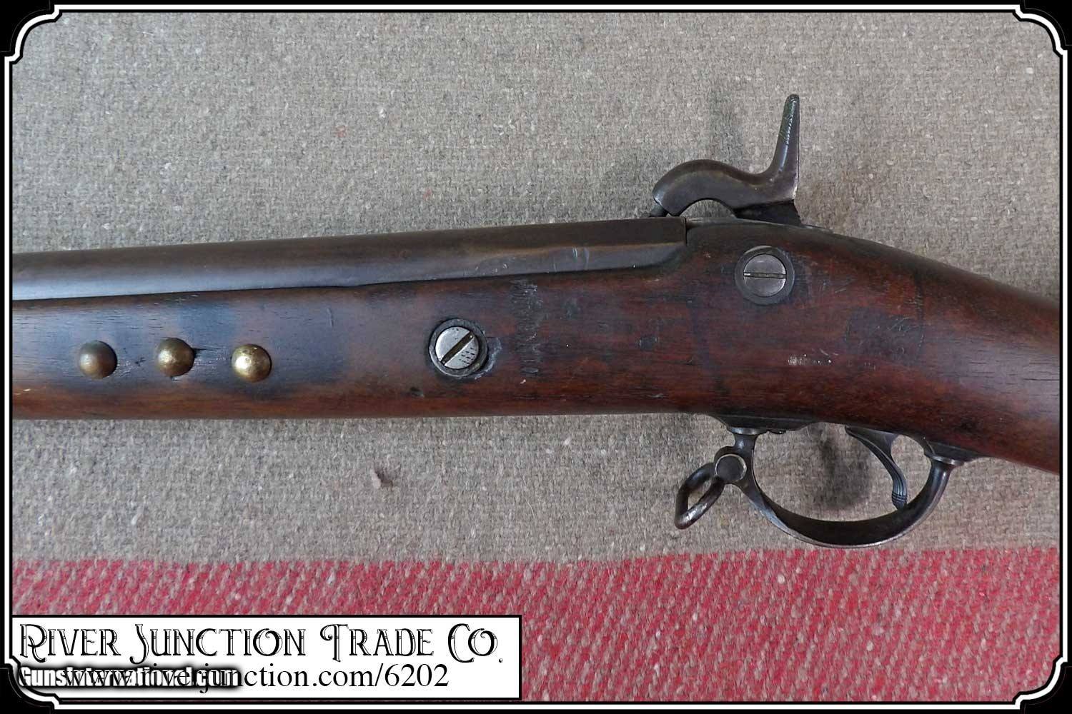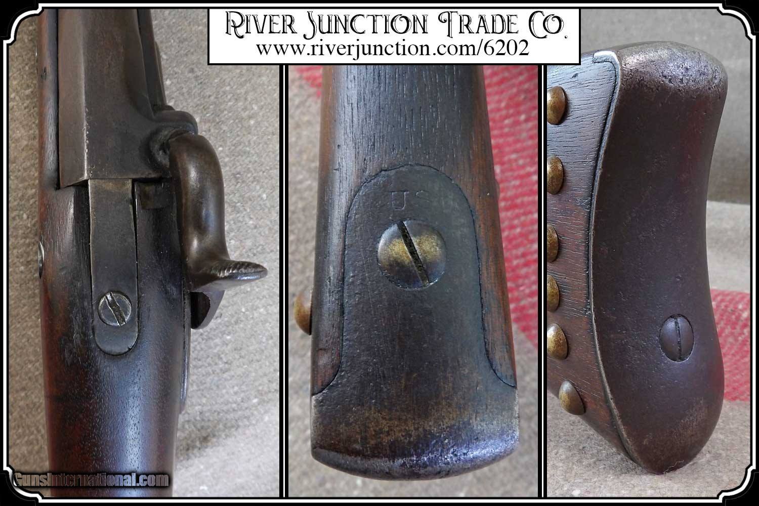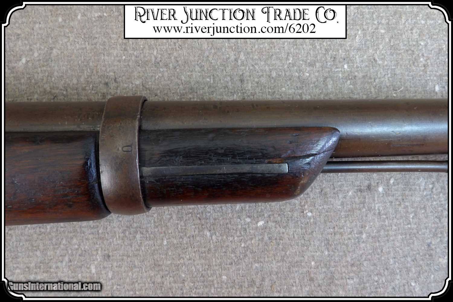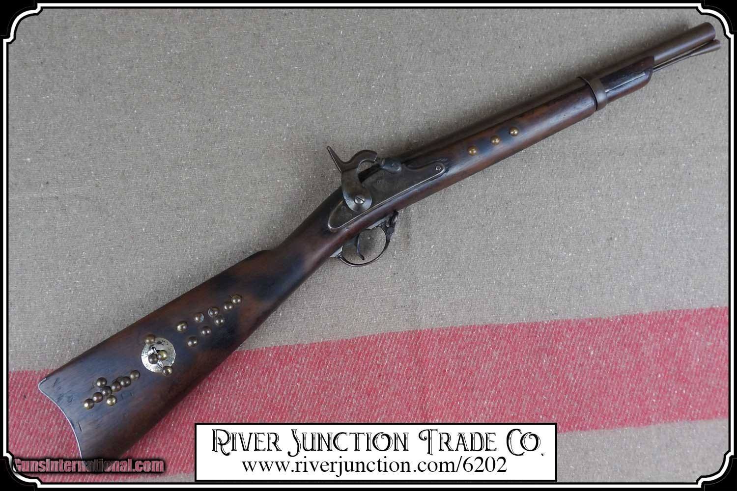 Description: Many weapons used by Native Americans would have been present at most of the late 19th century's most well-known battles, including the Battle of Little Bighorn. This was a U.S. Springfield Model 1863 rifle-musket and has since been bored out to .62 caliber smoothbore, and sawed off to a 16 inch barrel. It has an overall length of 31 inches. The ramrod is 16 inches long. The wood has a short crack above the barrel band and only minor nicks and dings otherwise. The lock is marked US over Springfield.The gun has an even, pleasant, brown patina, which is smooth and uncleaned. The lock, hammer, trigger guard, butt, tang, are all in perfect condition and ready for daily use. It is a good sound horseback or canoe gun. The tacks on the stock make me think that it might have been a reservation gun and the medallion on the left side of the stock reads US INDIAN SERVICE. It sure is interesting. Other items are not included. This is an ANTIQUE and can be shipped directly to you. (adult signature required) this is an Antique and I think a good sound shooter. No guarantees, warranties, or liabilities for any actual usage. If any firearms are to be used for shooting purposes, a qualified gunsmith should inspect them first. We will ship outside the U.S.A. Payment: Item, can be ordered on line with a credit card or paypal on our sight. Just Google (riverjunction) and type in the River Junction Trade Co. item number (6202) in the search box. Before you checkout you will see shipping cost and total. OR If you prefer: Pay by cash, postal money order, cashiers check, personal & business checks. We wait for checks to clear. We always answer questions and entertain offers. Have questions? Call me 563-880-4588. Jim SOLD |