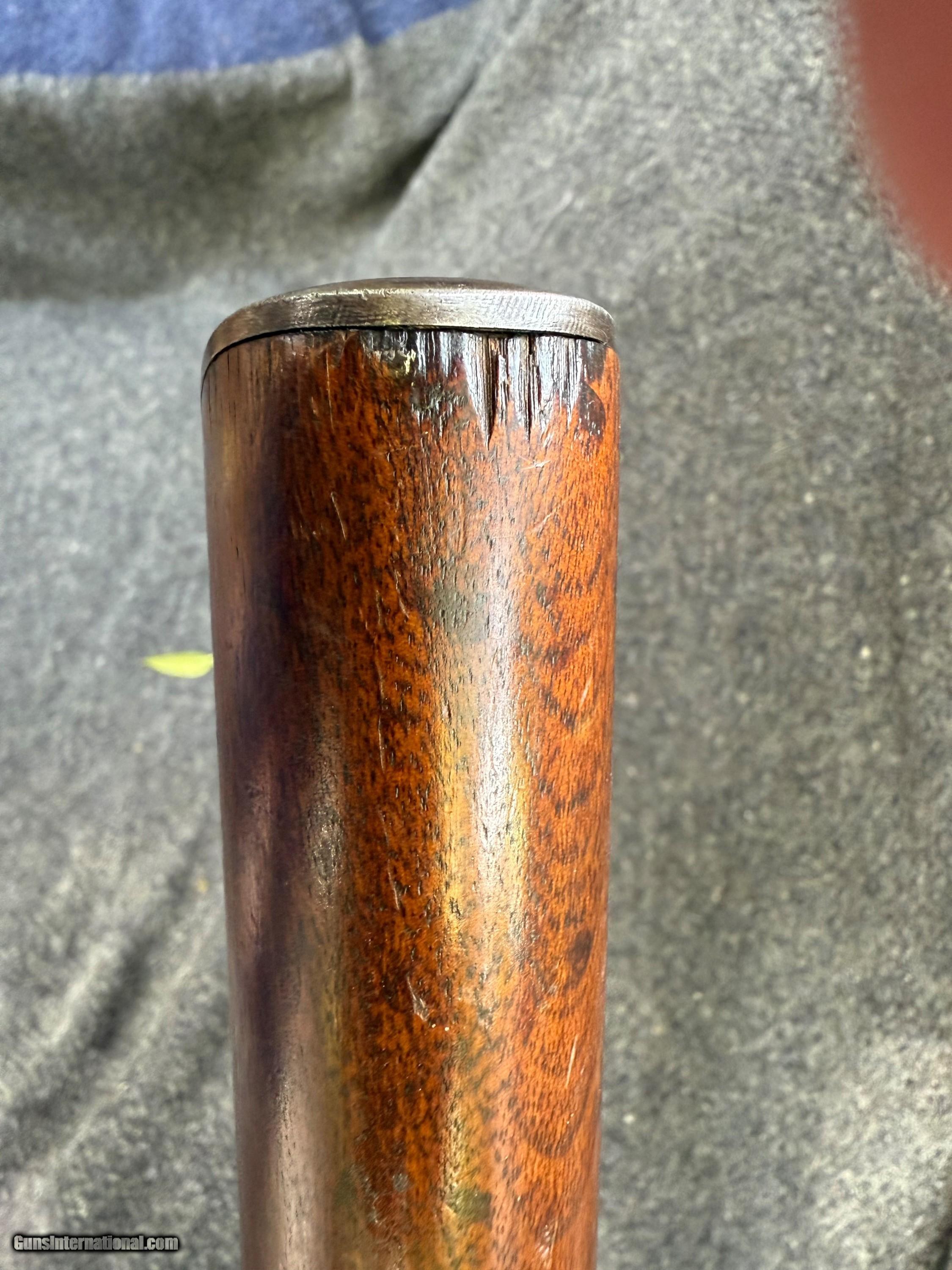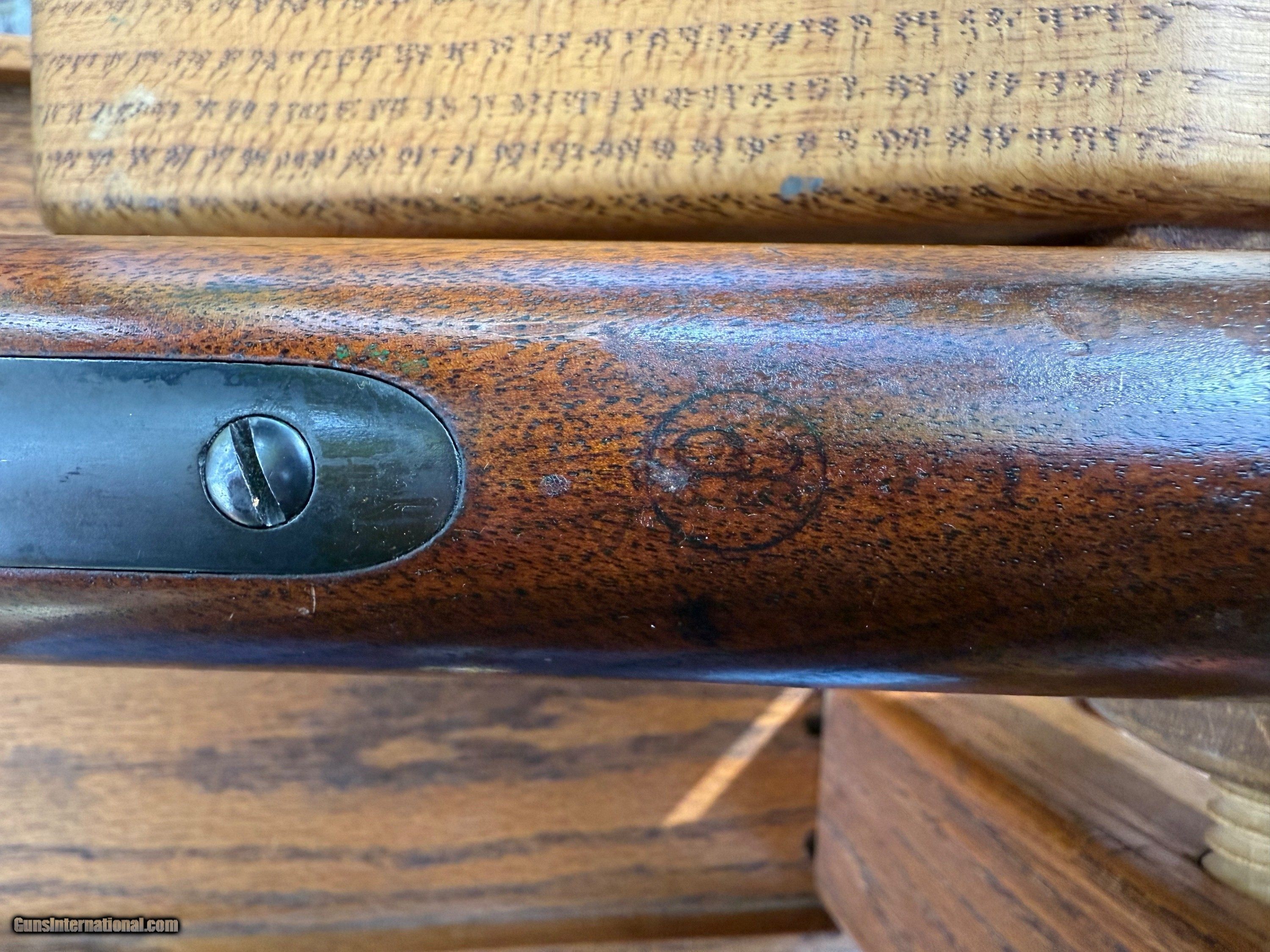 Stock Configuration & Condition: The wood stock has a straight grip, one barrel band, carbine sling swivel bar with ring, and a keyhole metal buttplate with the included cleaning rods. The wood shows a few scratches, scrapes and wood compressions from handling and storage. The butt plate and stock hardware have cleaned erosion, dings, and varying degrees of thinning on the leading edges. Stock cartouches ( Samuel W Porter) are strong and present on the wood. The most notable scratch is next to the butt plate. The stocks rate in about Very Good Plus – Fine or better condition for its age.